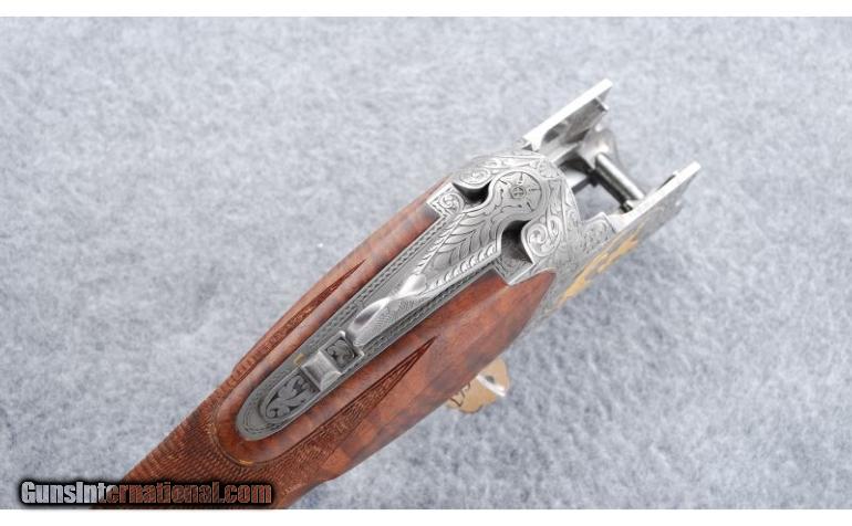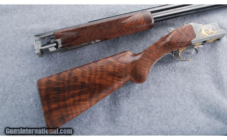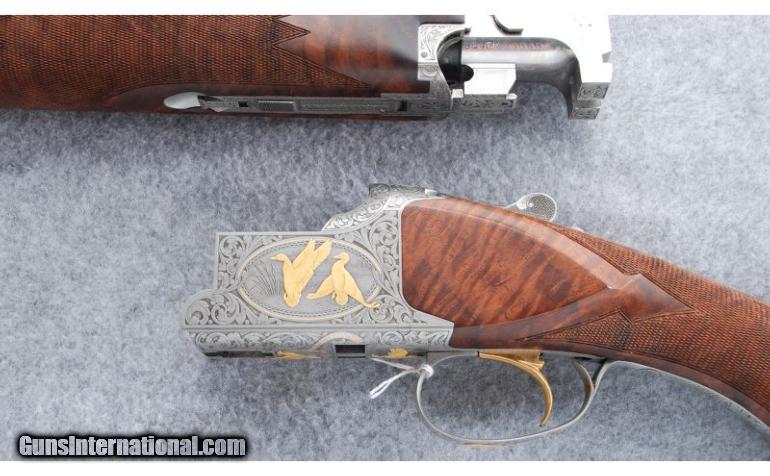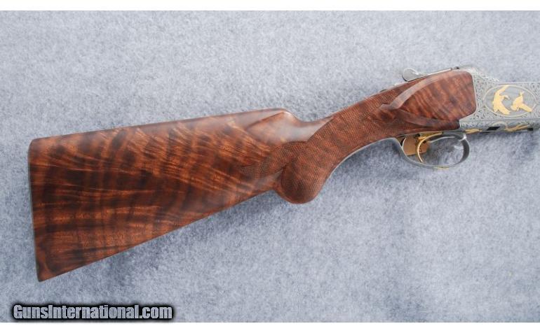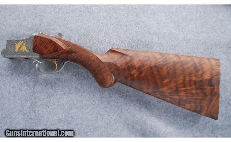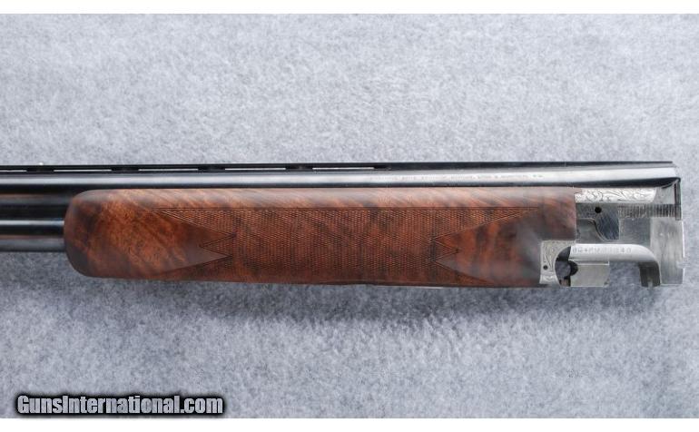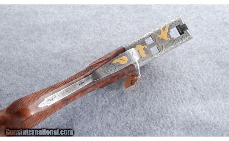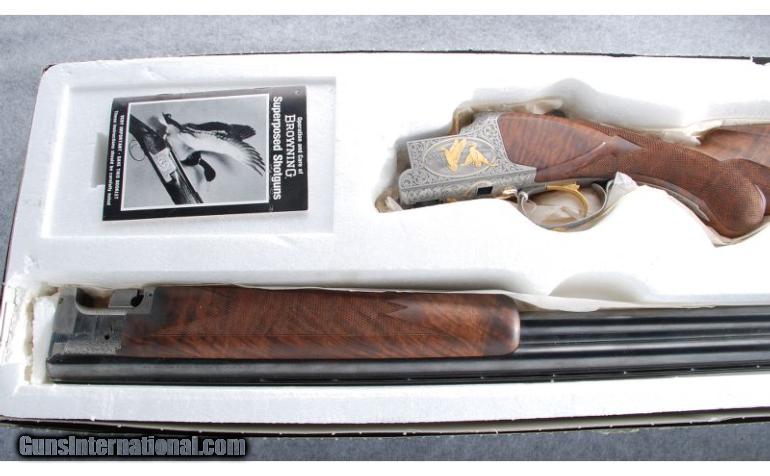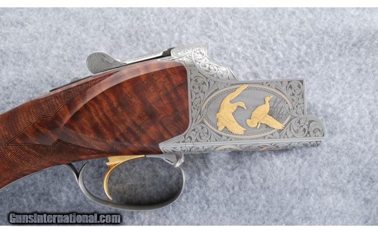 Description: This is the 1981 Mallard edition Browning Superposed (#40 of 500). It is a 2 3/4" 12 Gauge with a 28" vent rib barrel and features highly figured checkered walnut furniture, scroll engraving with game scenes, and gold inlays all on a French Grey receiver. This gun has a round knob pistol grip stock with a checkered butt. The chokes are fixed at Mod/Full. The Length of Pull is 14 1/4" and the gun weighs 7 lbs. 1 oz. It has white front and mid beads. This gun appears to have been left unassembled since it left the factory. There may be a few very minor storage marks. There is one spot of oxidation on the forend release. There are no noticeable dings or scratches on the furniture. The bores are bright. This gun comes with the manual, box, and wooden display case. SOLD Caliber Info: 12 Gauge Chambers: 2 3/4 Barrels: 28" vent rib barrels. Triggers: Single Selective. Gold. Stock: Highly figured checkered walnut round knob pistol grip. Butt Pad: Checkered butt. Chokes: Fixed - Mod/Full Extras: Box, manual, and wooden display case. Item Location: Gonzales, LA |
