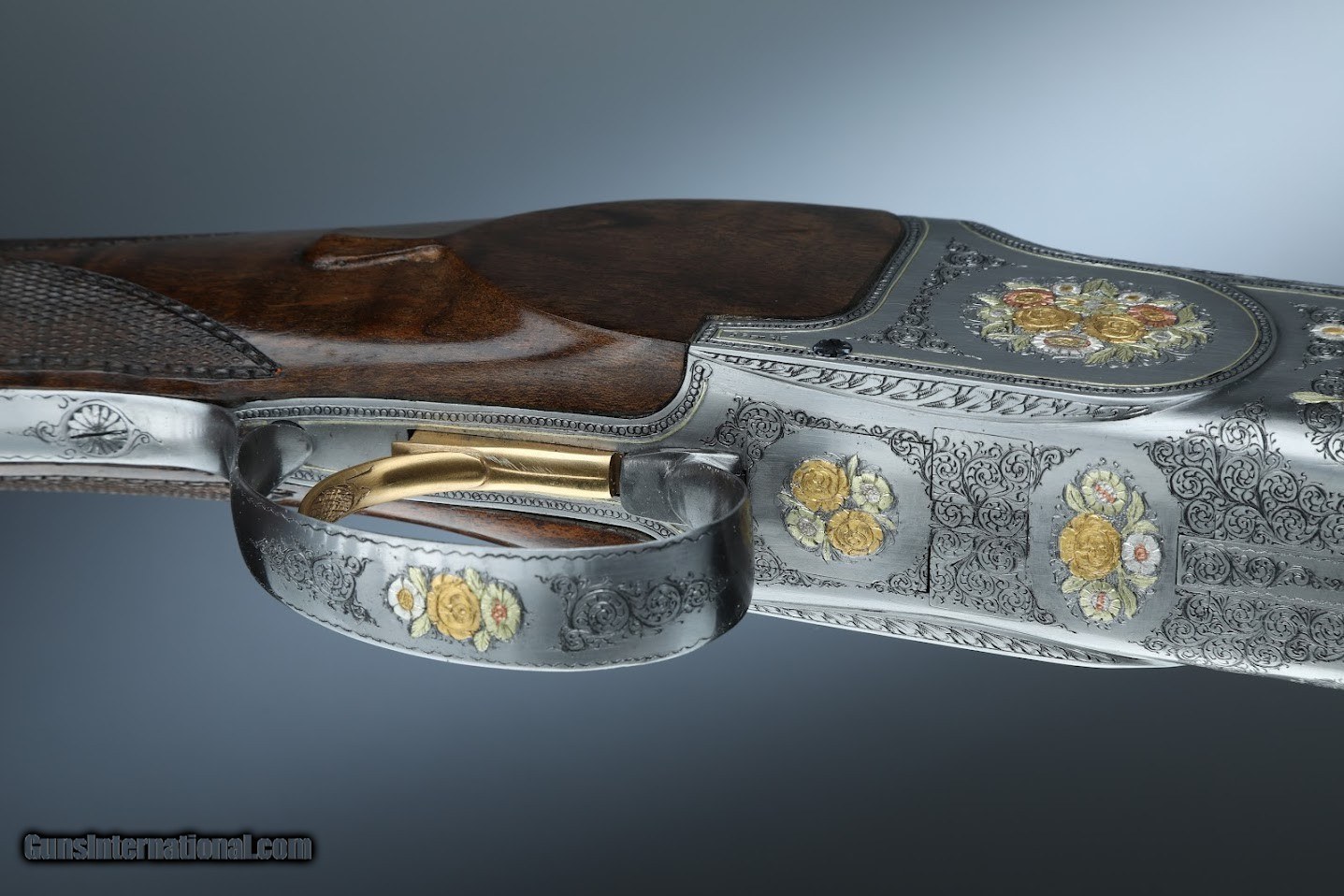 Description: We are offering another oustanding specimen of the finest engraving from Angelo Bee's personal collection.This distinctive master piece is called the “bouquet” gun and is a one of one. He did engrave a companion "bouquet" gun that complements this one. It features the same flower and fine English scroll design but it's a Browning pump action "Trombone" rifle in 22LR. Angelo wanted to engrave an over-the-top shotgun that was above and beyond the Superluxe grade that was produced by the Fabrique National in Herstal, Belgium. Notable features of this gun include multi-color 24 carat gold inlays, a gold border around the receiver, fine English scroll, a double ribbed ventilated rib, the head of a duck chiseled in the top lever, filed receiver cheeks, a long tang trigger guard and a serrated gold-plated trigger. The stock is a gorgeous special-order walnut from Belgium that features a round knob pistol grip, tear drop carving, butt plate checkering and a Schnabel fore end. The engraving consists of a bouquet of flowers in gold inlays on both sides of the receiver in the middle and other flowers forward of the center, two bouquets of flowers on the top and bottom of the receiver. The trigger guard has a gold inlaid flower and so does the fore end iron. The inlays are surrounded with exquisite fine English scroll throughout the metal surfaces of this gun. Due to all the many and unique features of this gun, Angelo created a new grading category and calls it “Ultraluxe” grade. The gun has a beautiful grey finish by Angelo Bee. The barrel was blued by Eubanks Gunsmithing. This gun is autographed with “ABee” and a bee symbol on the left side of the receiver in the bottom right area near the stock. NRA Grade: Perfect.to excellent. This gun comes with: 1. Leatter of Provenance (Signed by Angelo Bee on his personal letterhead) 2. Certificate of Authenticity (signed by Angelo Bee) 3. A fitted Browning hard case The companion "bouquet" gun is listed under this number: 102746541. If you buy both, the pair will be discounted $2,000.00. SOLD Shotgun Gauge: 20 Gauge Manufacturer: Browning Model: B25 Serial Number: 401201V6 Barrel Length: 28 Inches Chambers: 2 3/4 Action: Superposed Fore End: Schnabel Rib: double ventilated Finish: grey Chokes: Full and Modified |