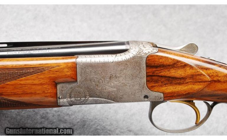 Description: SOLD Manufacturer: Circa 1956 Caliber Info: 20ga Chambers: 2 3/4 Metal Condition: Shows waer but in good condition Wood Condition: Very Good condition-no nicks or scratches Bore Condition: Nice and Bright Barrels: 26 1/2 Triggers: Single Selective Stock: Prince of Wales Grip Stock Dimensions: 15" LOP 1 1/2" DAC 2 1/2" DAH Fore End: Typical Superposed Butt Pad: Pachmayr Recoil Pad Weight: 6 Lbs 12 Oz. Sights: Front and Middle Beads Chokes: IC & MOD Extras: Engraved by Felix Funken. Item Location: Scarborough, ME |