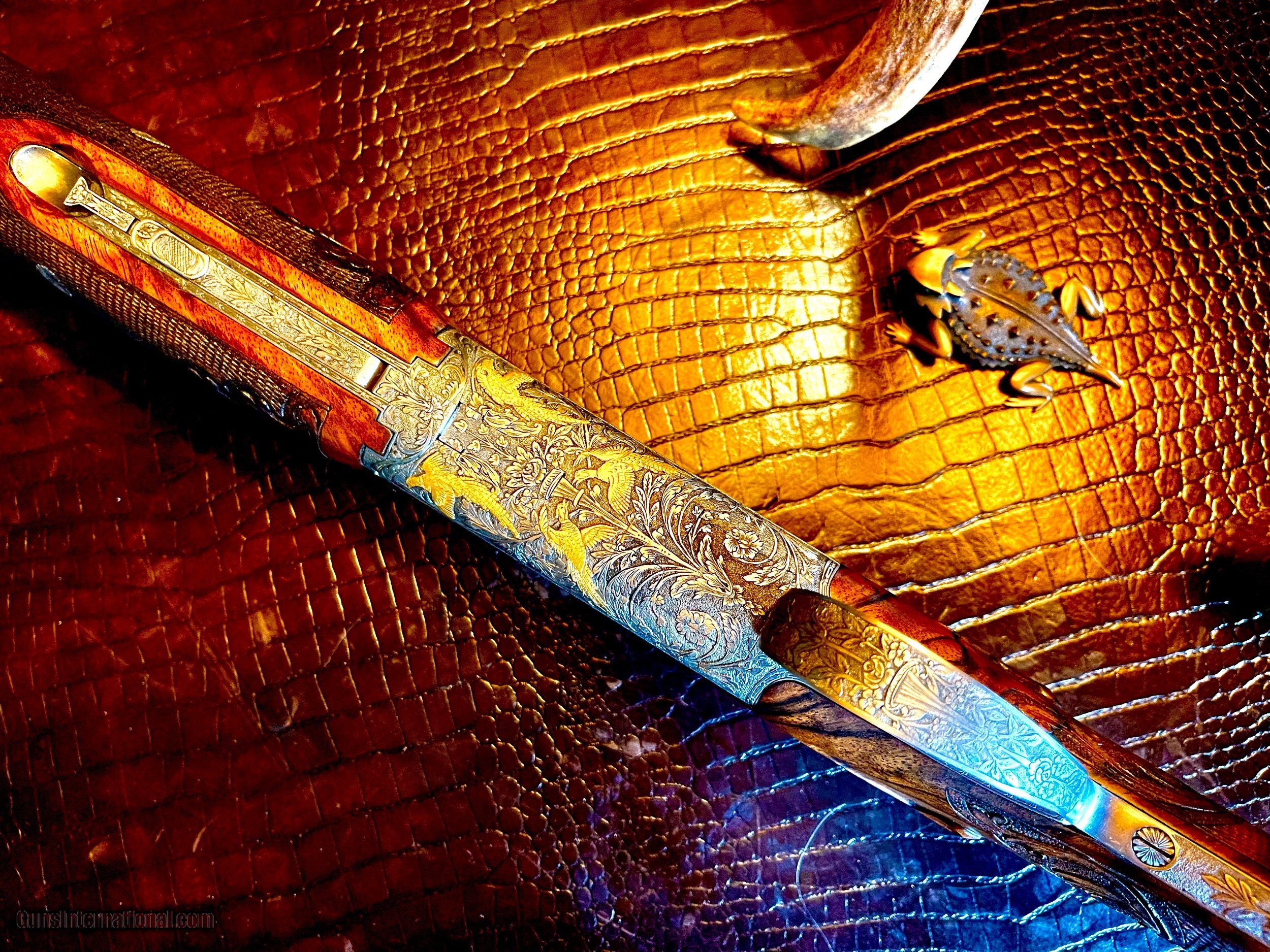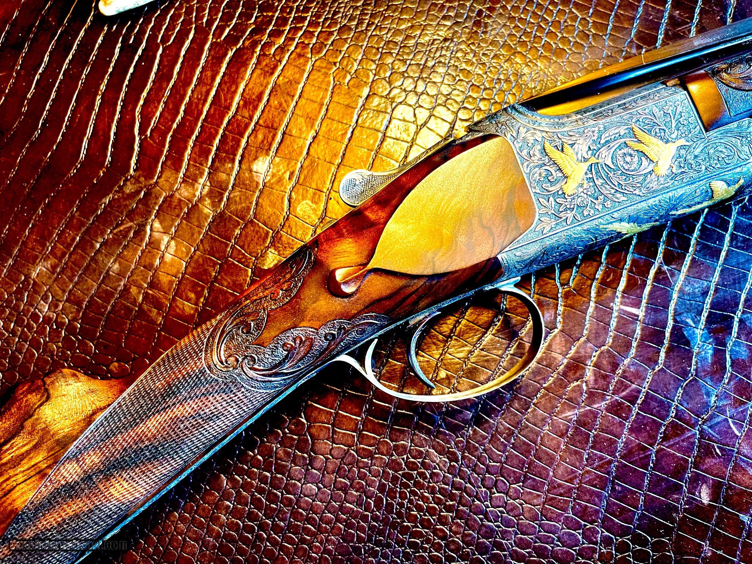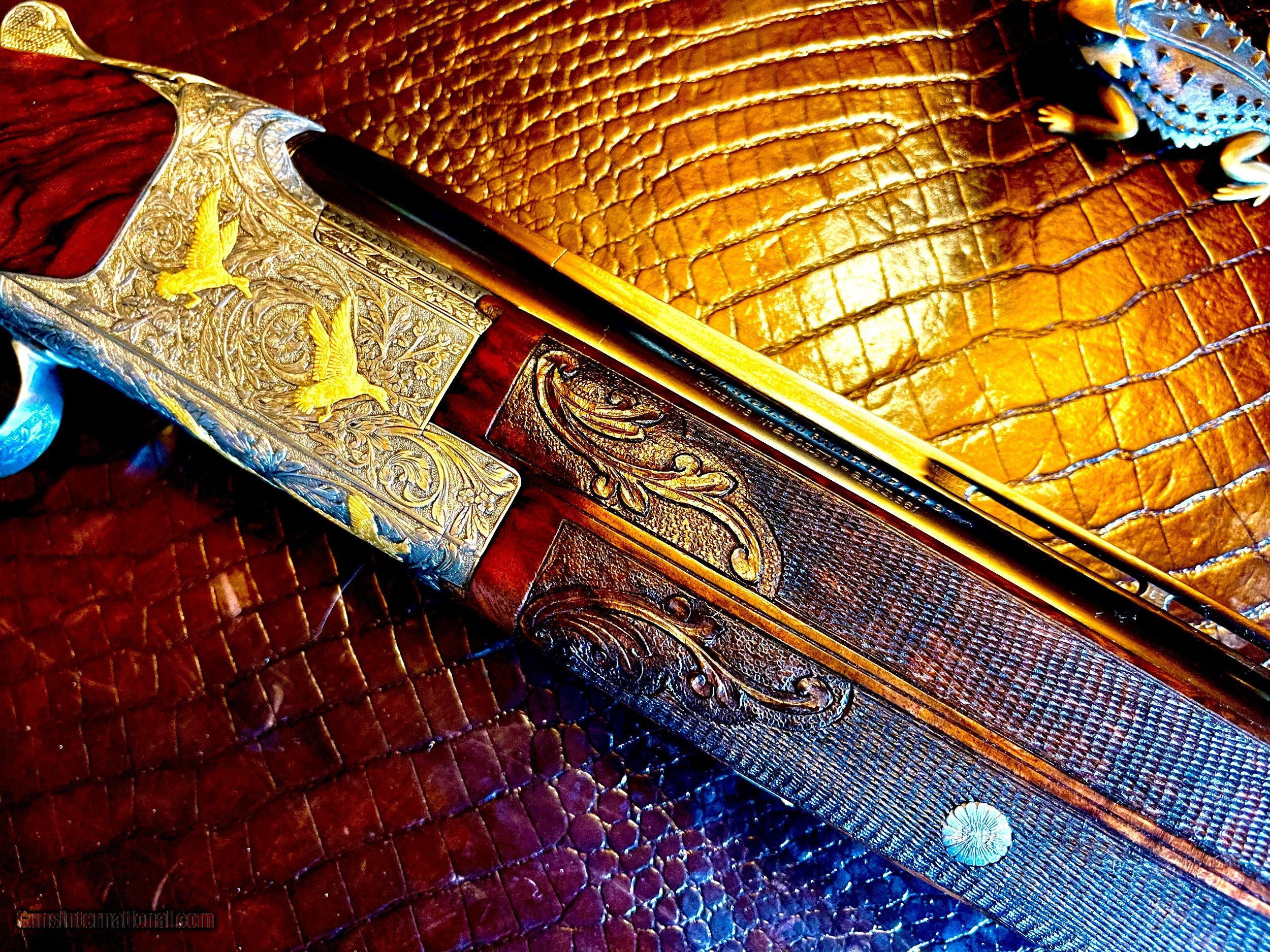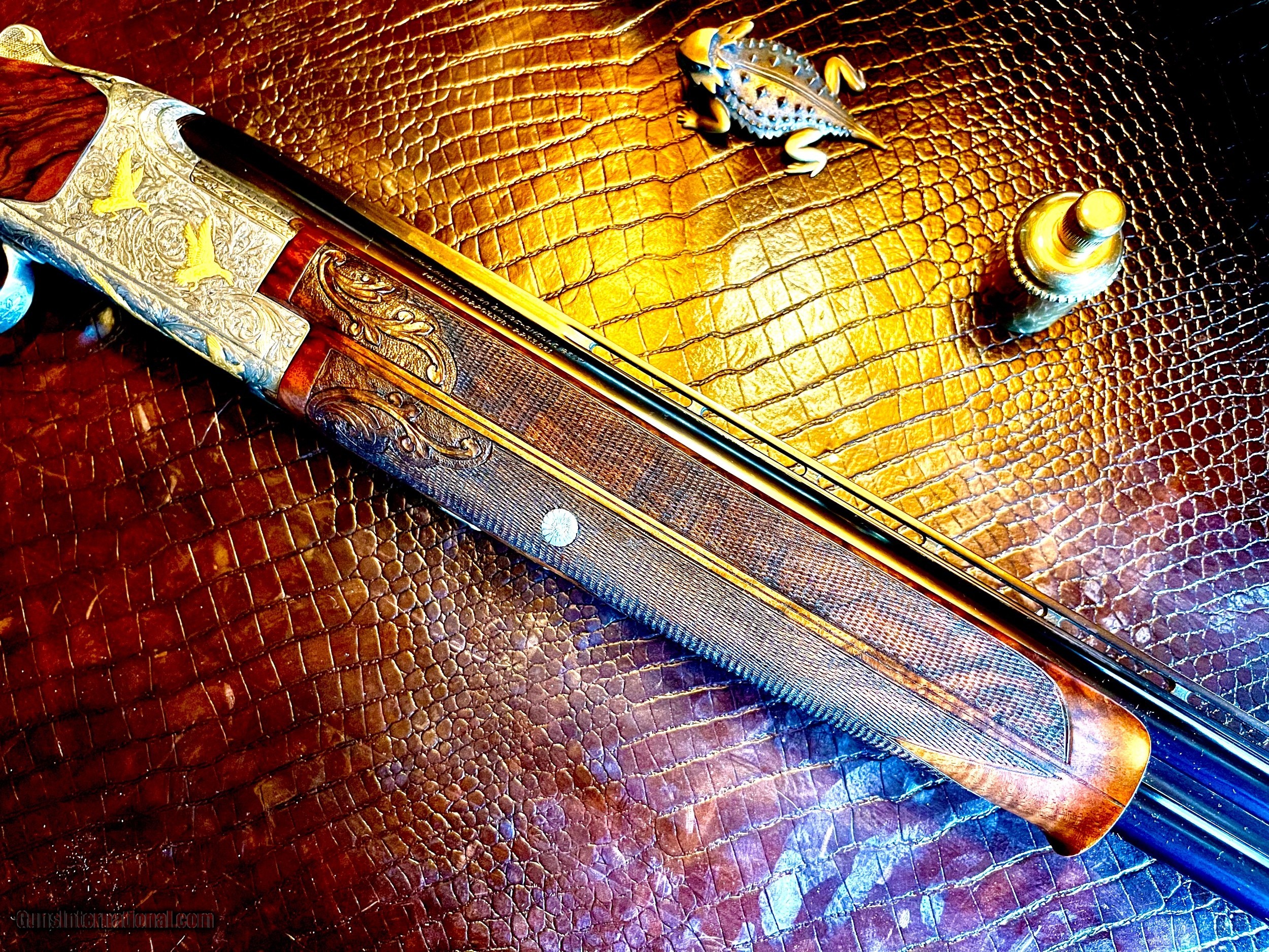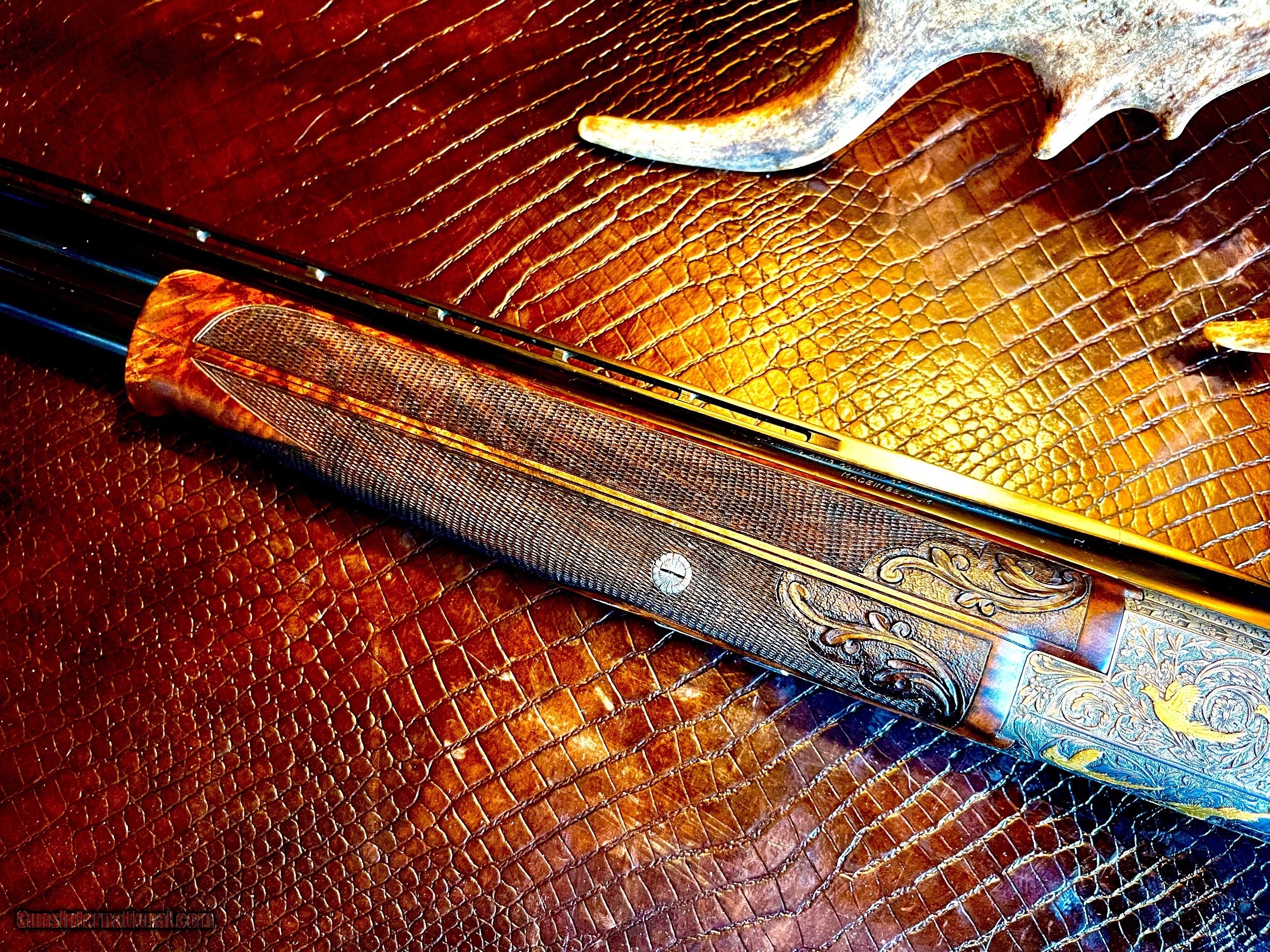 Description: Browning Superposed Superlight - 28ga - Angelo Bee’s Masterpiece - Three Piece Forend - Checkered Butt - Fleur-de-lis engraved Wood done in Belgium - Color Case Hardened Trigger (first I've ever seen) - This gun was finished 15 years ago and was just received for me to sell - Angelo handled all of the engraving - the gun took 4 years to build because of the Belgium work that needed to be done on the wood - the entire stock/woodwork was done on Belgium - the engraving done in California by Angelo over the course of a couple of years. This is the finest work I have seen from Angelo in years. I believe it may just be his personal best. 14 3/8 x 1 1/2 x 2 1/8 - 6.5 lbs SOLD The Quillen-Worfe Private Gun Collection - Guns International page – please read prior to making a purchase: