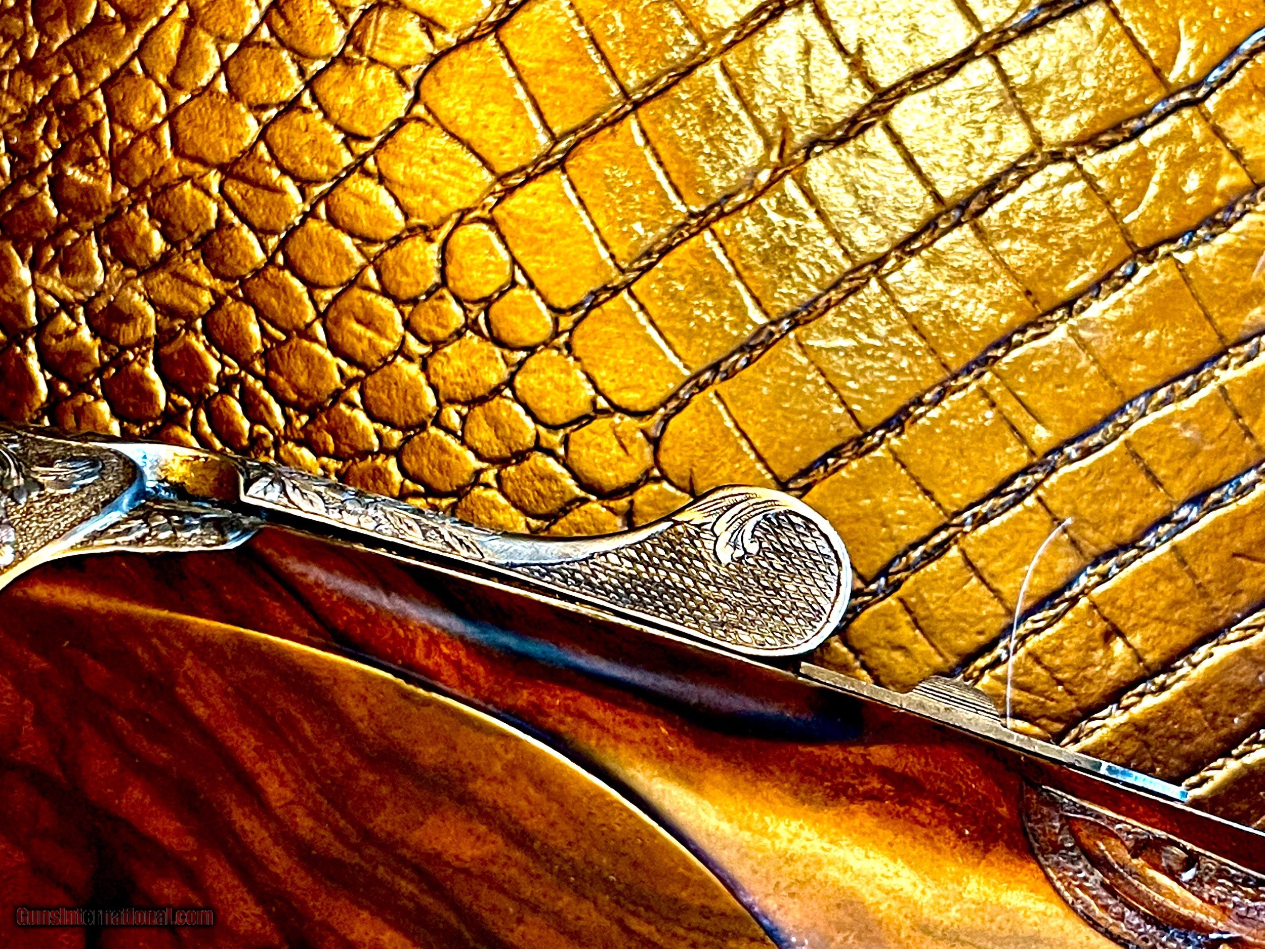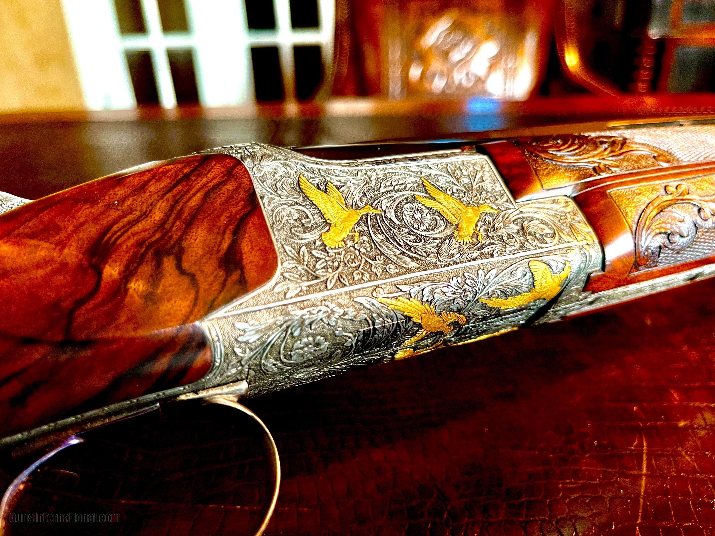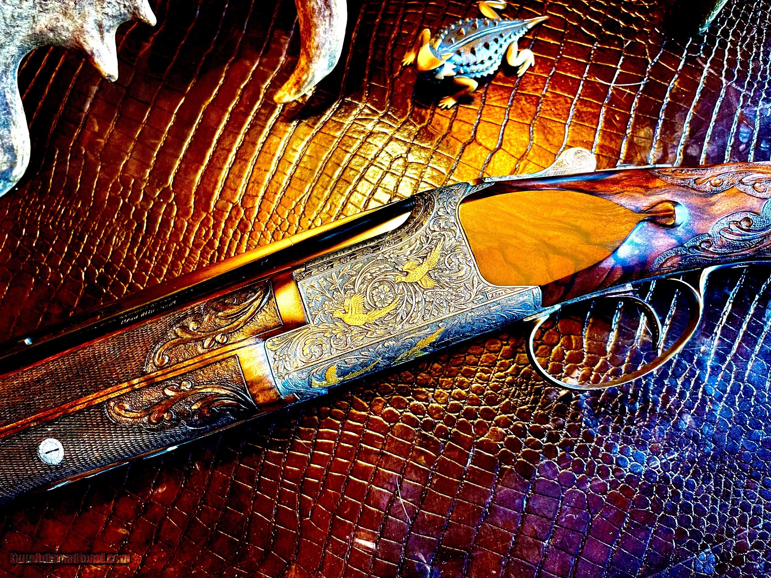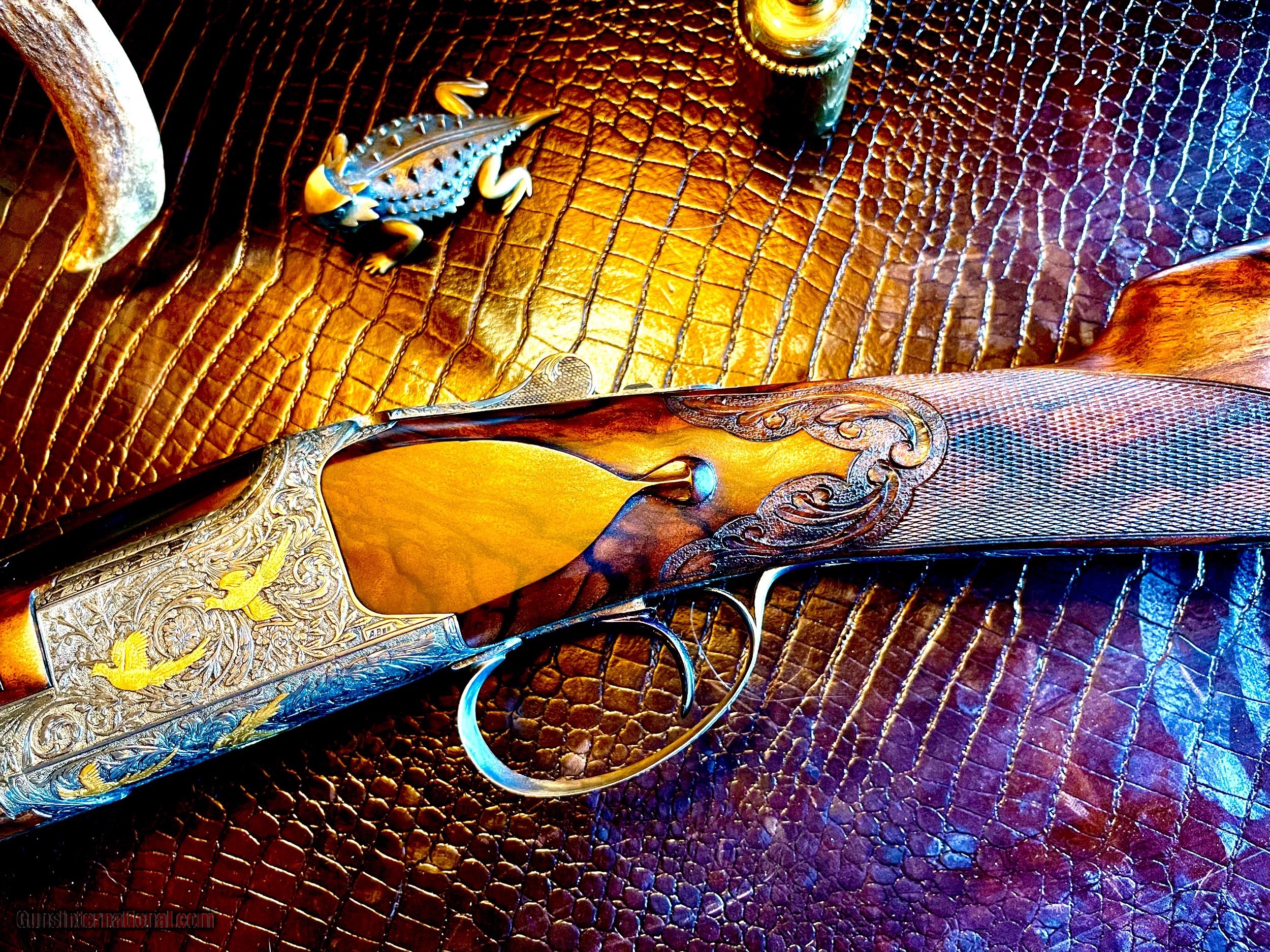 Description: Browning Superposed Superlight - 28ga - Angelo Bee’s Masterpiece - Three Piece Forend - Checkered Butt - Fleur-de-lis engraved Wood done in Belgium - Color Case Hardened Trigger (first I've ever seen) - This gun was finished 15 years ago and was just received for me to sell - Angelo handled all of the engraving - the gun took 4 years to build because of the Belgium work that needed to be done on the wood - the entire stock/woodwork was done on Belgium - the engraving done in California by Angelo over the course of a couple of years. This is the finest work I have seen from Angelo in years. I believe it may just be his personal best. 14 3/8 x 1 1/2 x 2 1/8 - 6.5 lbs SOLD The Quillen-Worfe Private Gun Collection - Guns International page – please read prior to making a purchase: