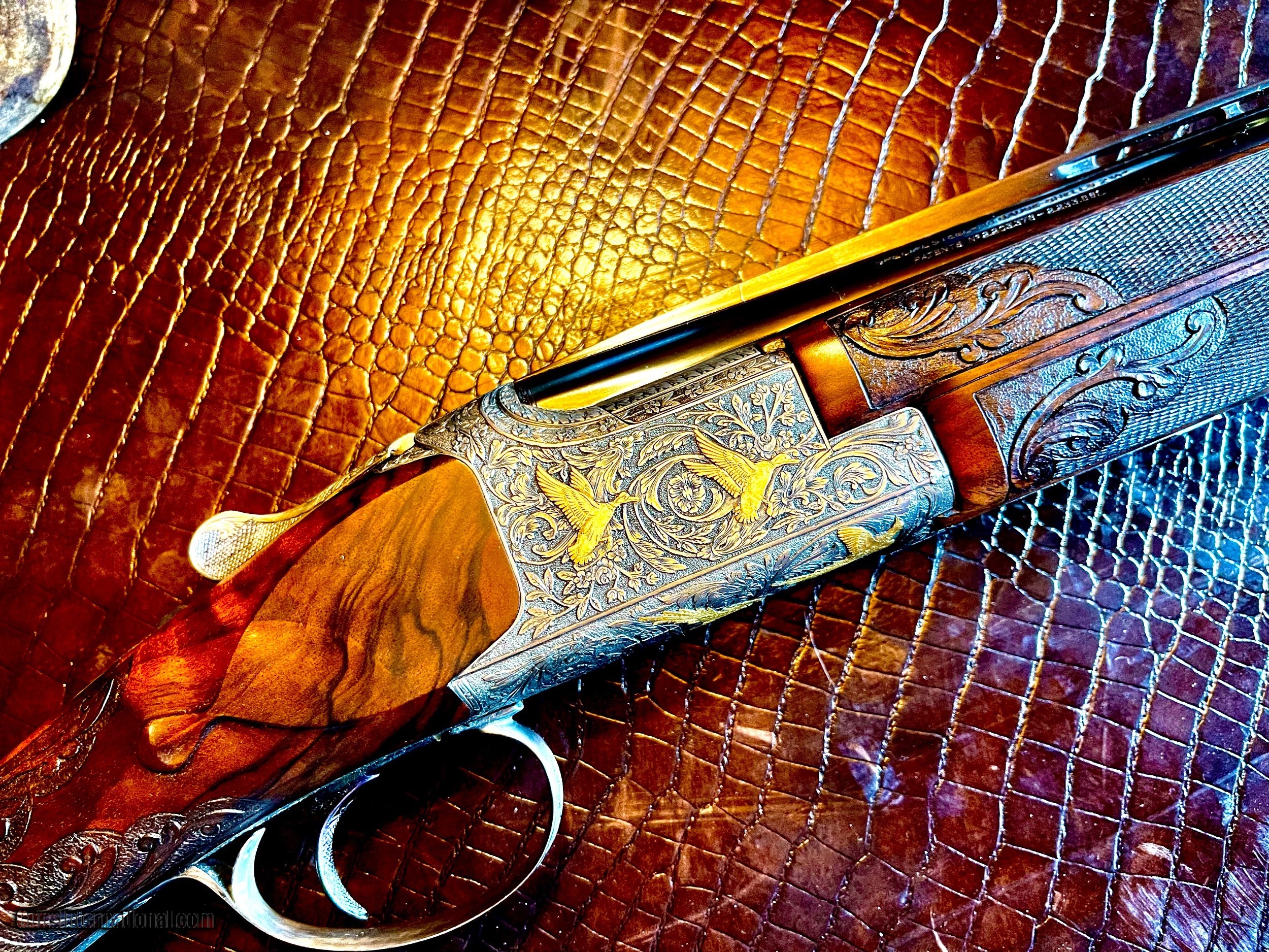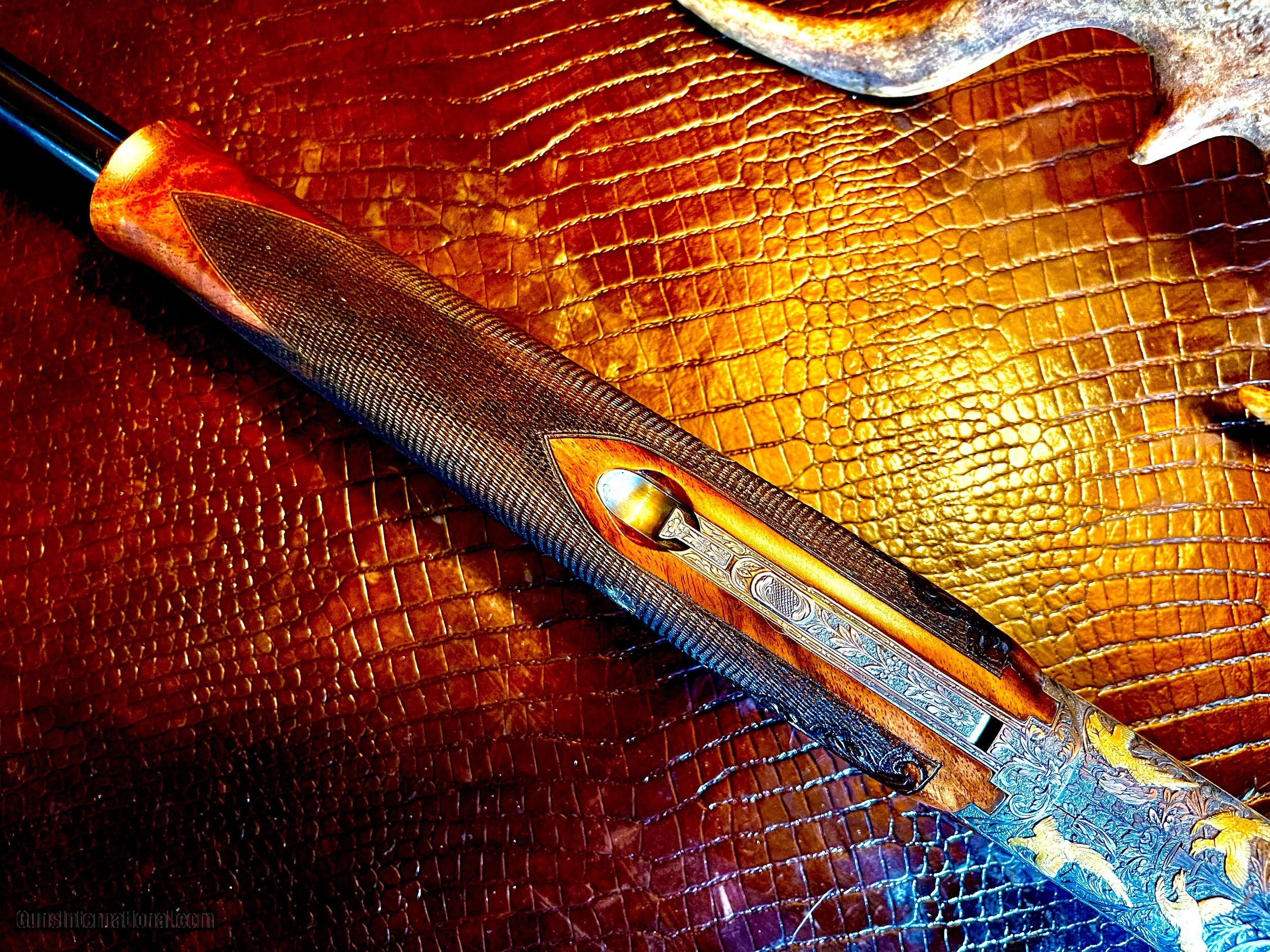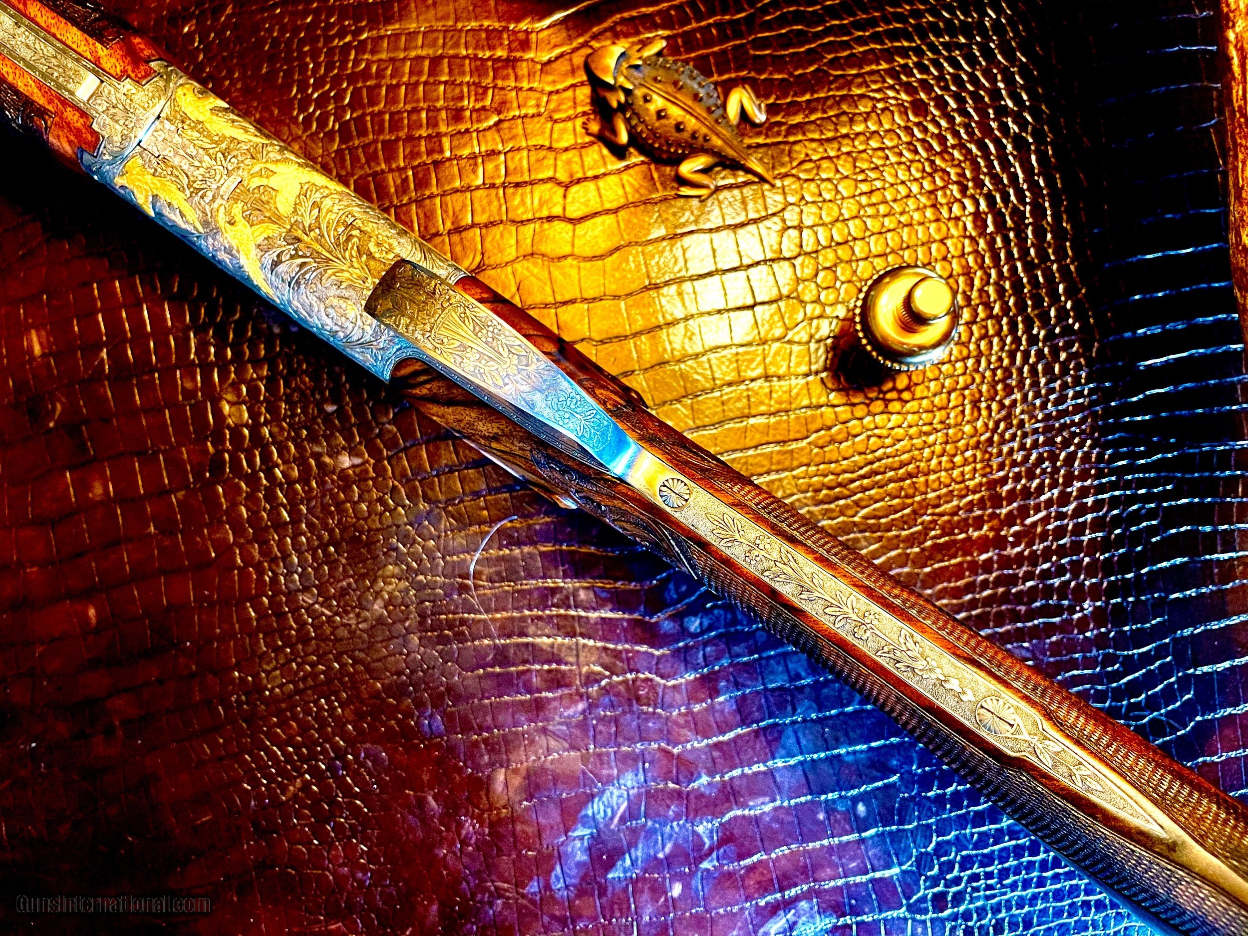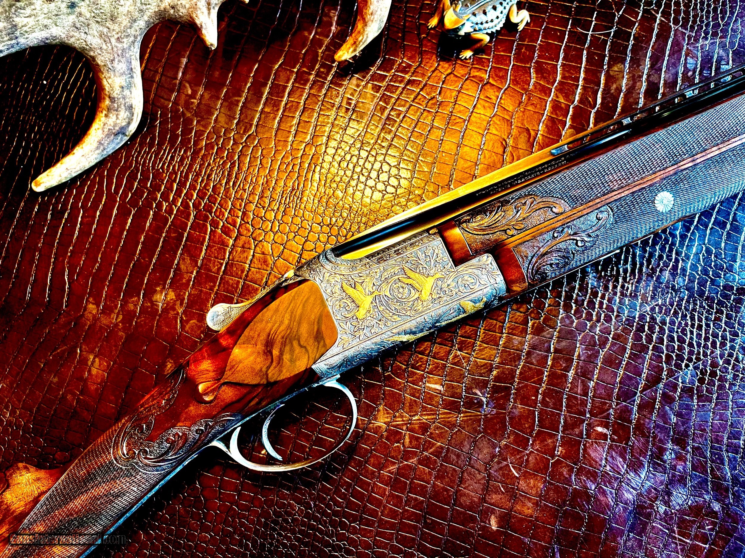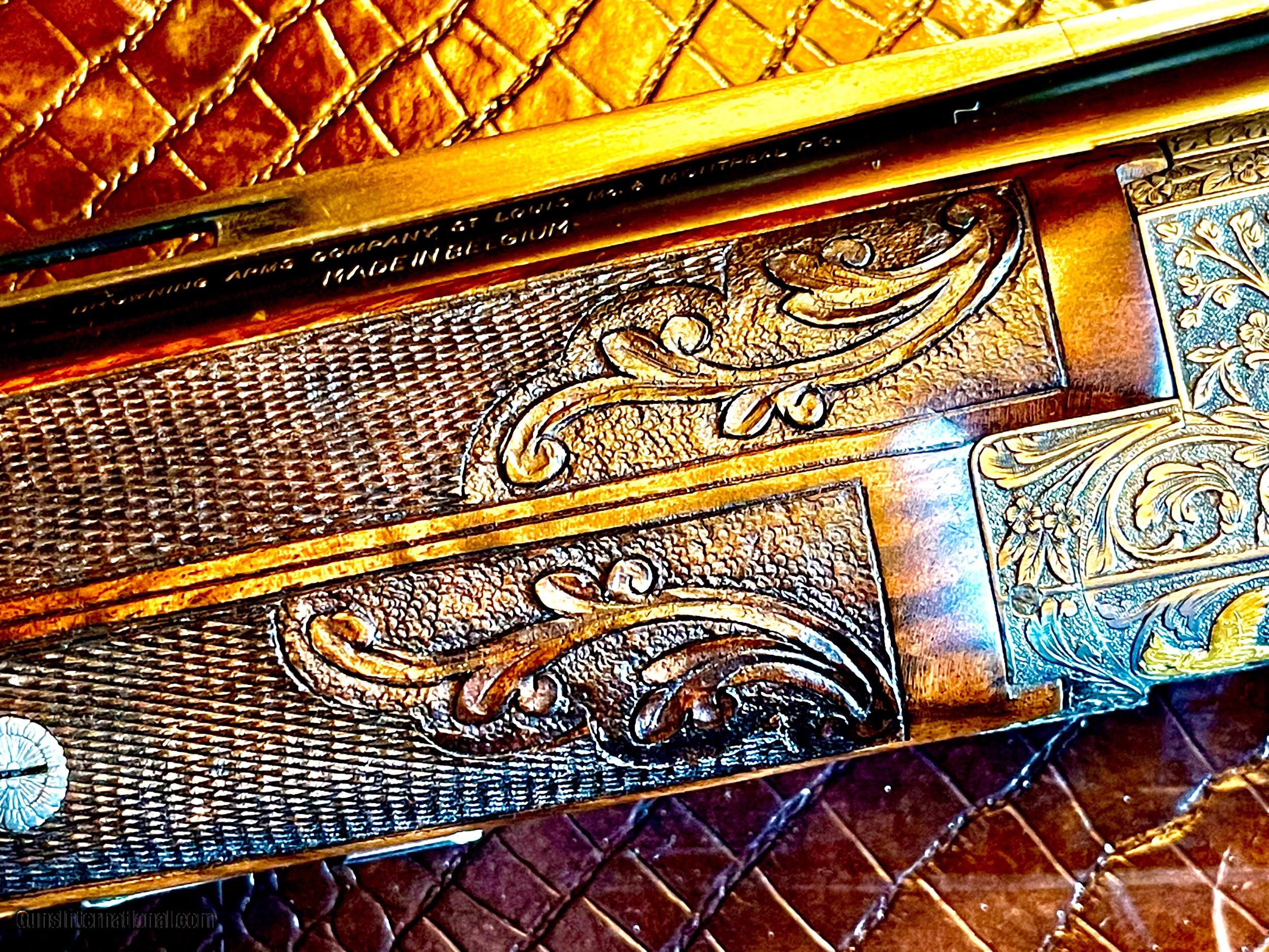 Description: Browning Superposed Superlight - 28ga - Angelo Bee’s Masterpiece - Three Piece Forend - Checkered Butt - Fleur-de-lis engraved Wood done in Belgium - Color Case Hardened Trigger (first I've ever seen) - This gun was finished 15 years ago and was just received for me to sell - Angelo handled all of the engraving - the gun took 4 years to build because of the Belgium work that needed to be done on the wood - the entire stock/woodwork was done on Belgium - the engraving done in California by Angelo over the course of a couple of years. This is the finest work I have seen from Angelo in years. I believe it may just be his personal best. 14 3/8 x 1 1/2 x 2 1/8 - 6.5 lbs SOLD The Quillen-Worfe Private Gun Collection - Guns International page – please read prior to making a purchase: