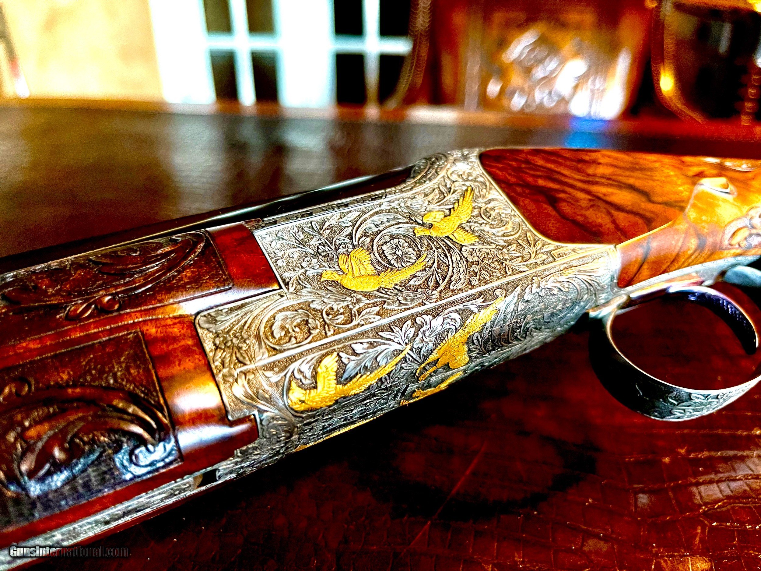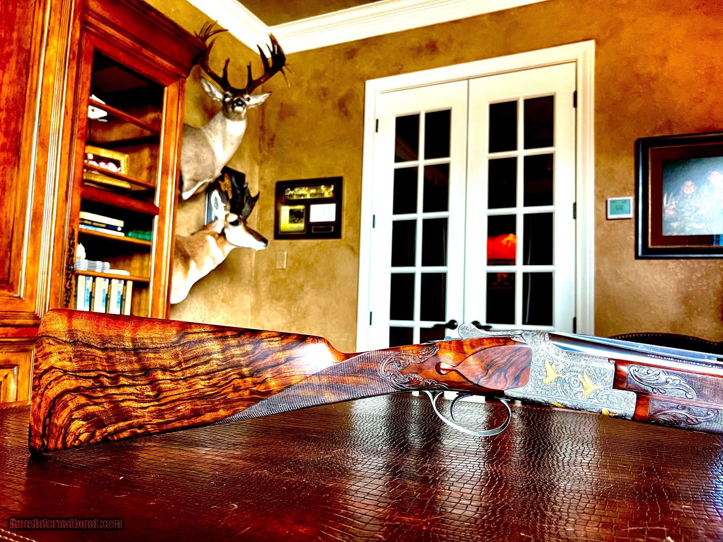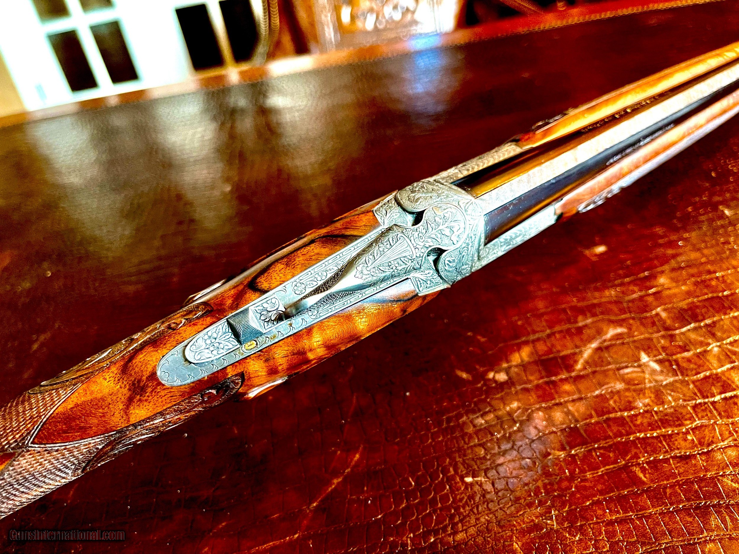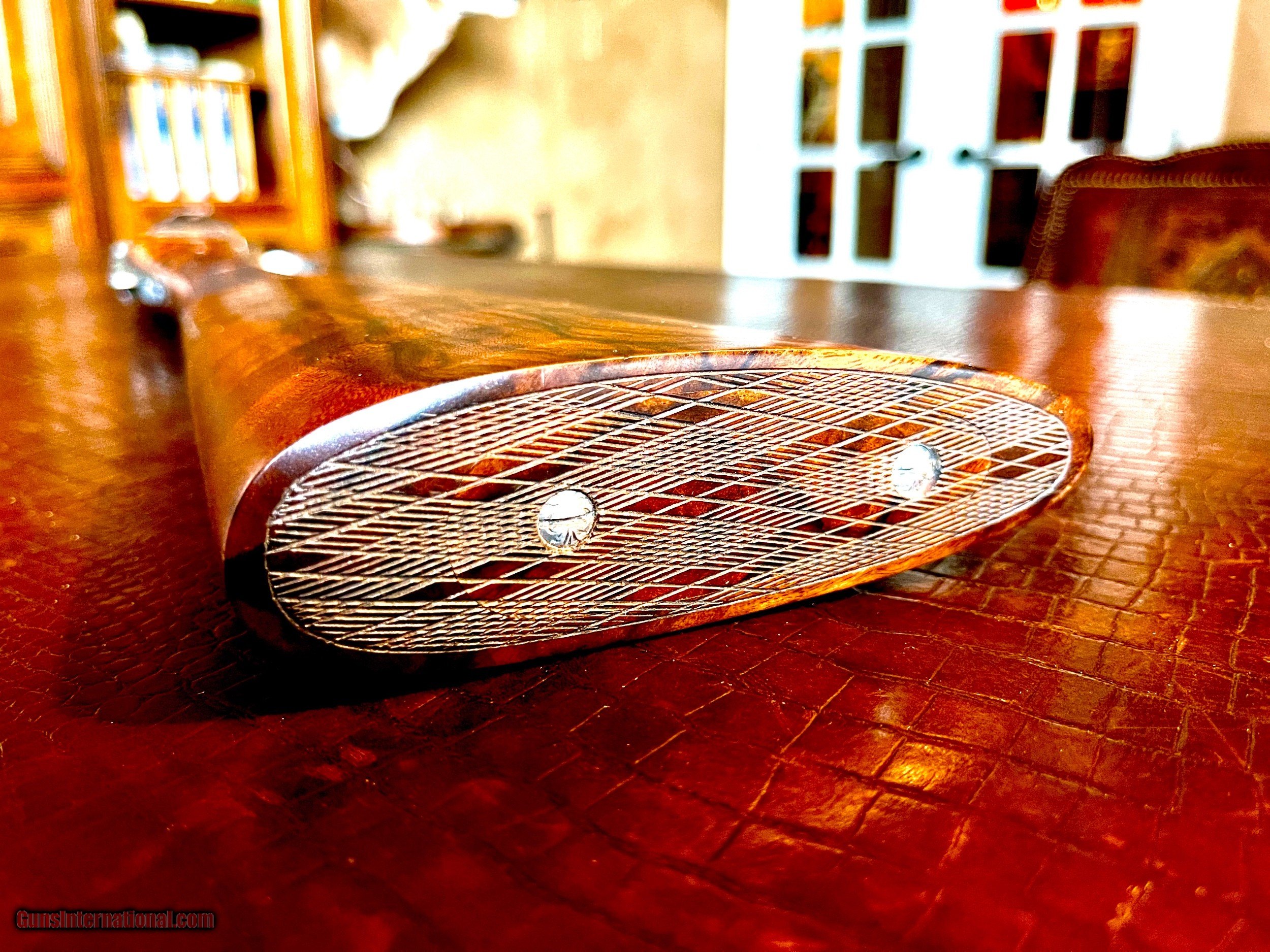 Description: Browning Superposed Superlight - 28ga - Angelo Bee’s Masterpiece - Three Piece Forend - Checkered Butt - Fleur-de-lis engraved Wood done in Belgium - Color Case Hardened Trigger (first I've ever seen) - This gun was finished 15 years ago and was just received for me to sell - Angelo handled all of the engraving - the gun took 4 years to build because of the Belgium work that needed to be done on the wood - the entire stock/woodwork was done on Belgium - the engraving done in California by Angelo over the course of a couple of years. This is the finest work I have seen from Angelo in years. I believe it may just be his personal best. 14 3/8 x 1 1/2 x 2 1/8 - 6.5 lbs SOLD The Quillen-Worfe Private Gun Collection - Guns International page – please read prior to making a purchase: