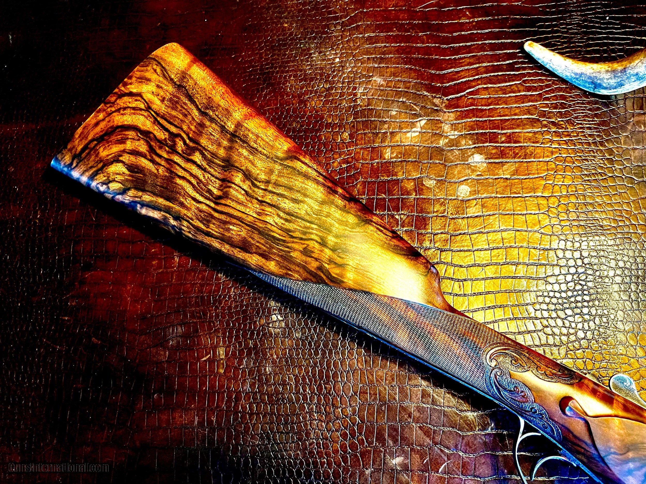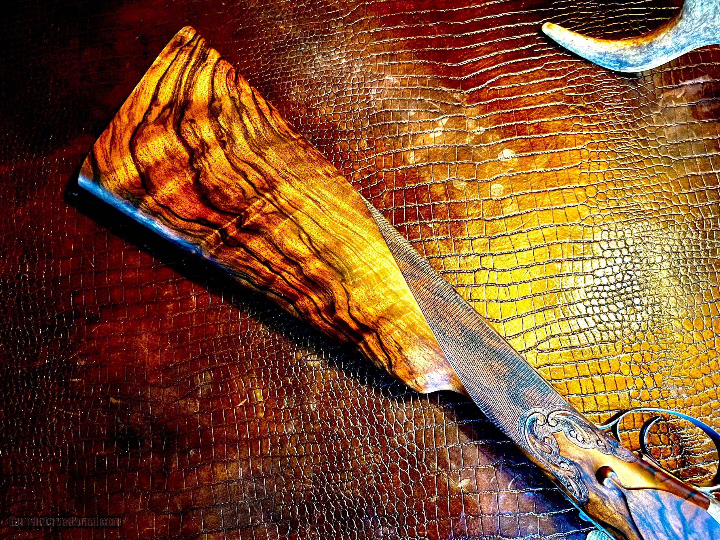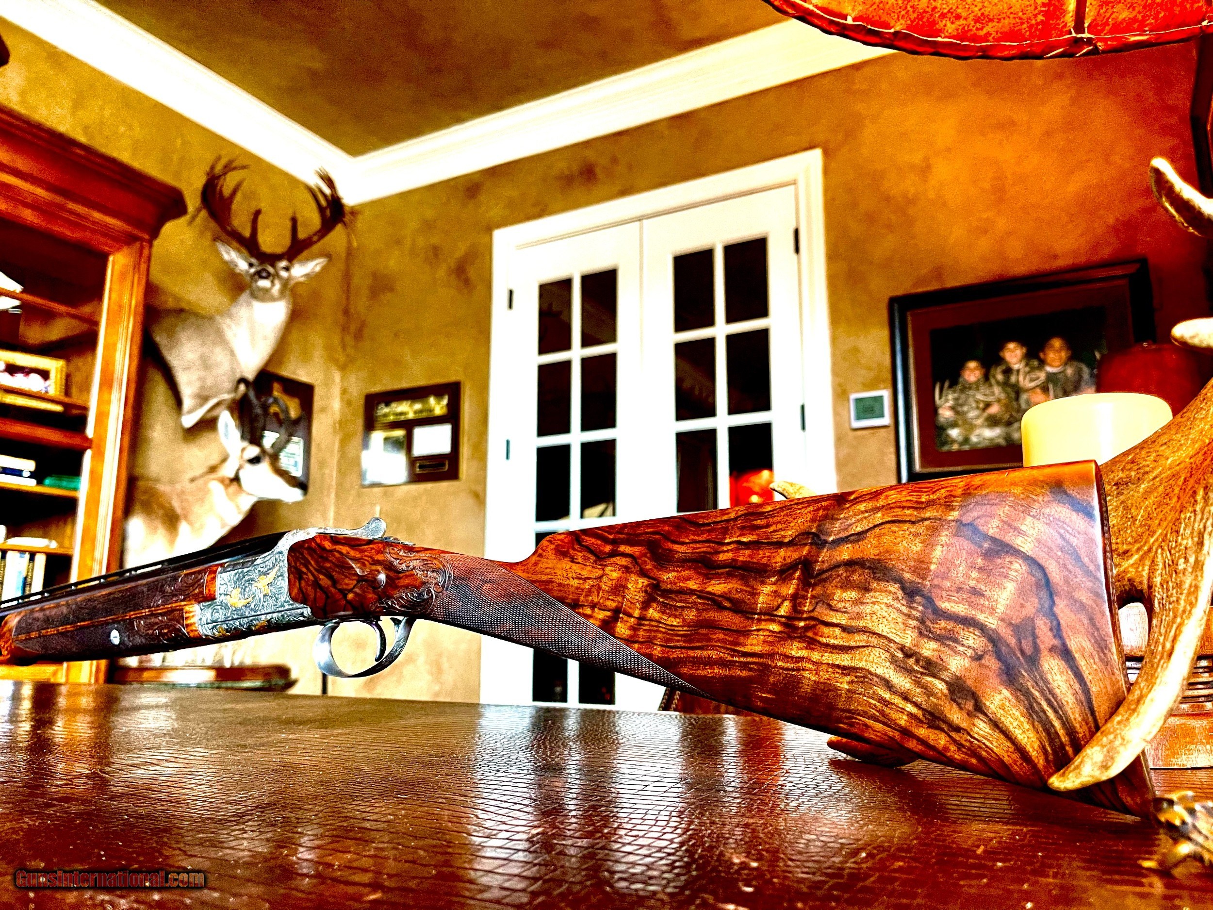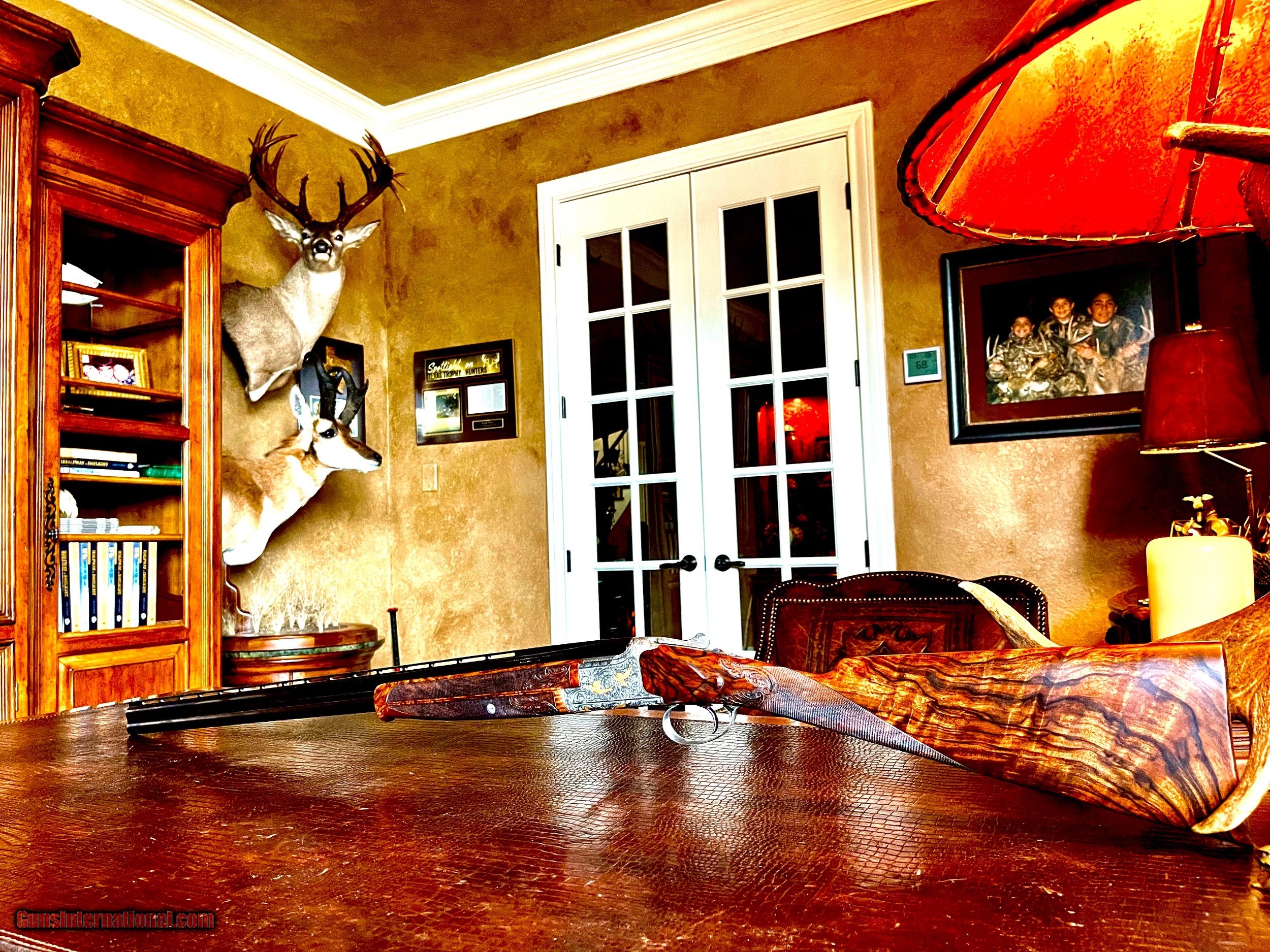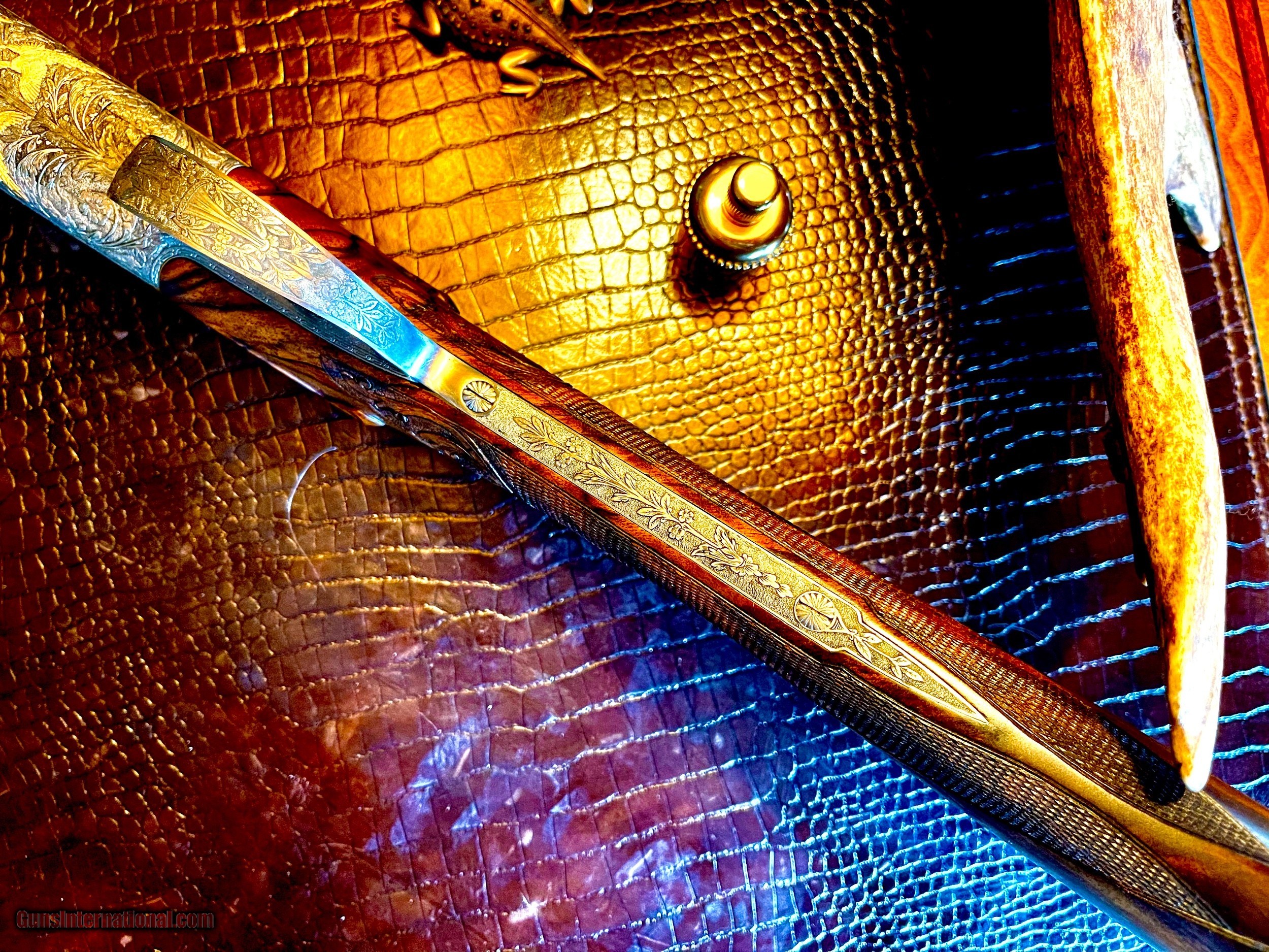 Description: Browning Superposed Superlight - 28ga - Angelo Bee’s Masterpiece - Three Piece Forend - Checkered Butt - Fleur-de-lis engraved Wood done in Belgium - Color Case Hardened Trigger (first I've ever seen) - This gun was finished 15 years ago and was just received for me to sell - Angelo handled all of the engraving - the gun took 4 years to build because of the Belgium work that needed to be done on the wood - the entire stock/woodwork was done on Belgium - the engraving done in California by Angelo over the course of a couple of years. This is the finest work I have seen from Angelo in years. I believe it may just be his personal best. 14 3/8 x 1 1/2 x 2 1/8 - 6.5 lbs SOLD The Quillen-Worfe Private Gun Collection - Guns International page – please read prior to making a purchase: