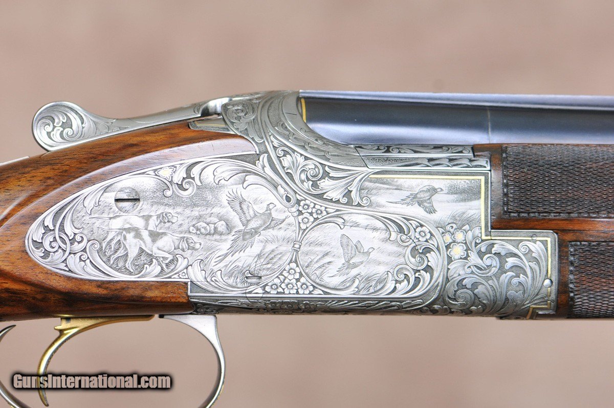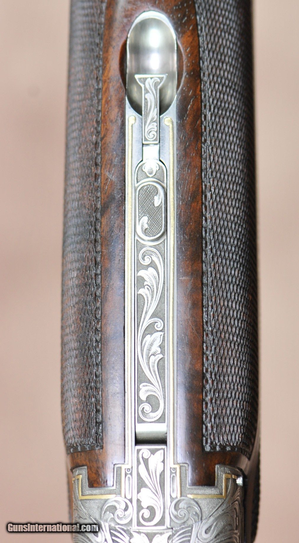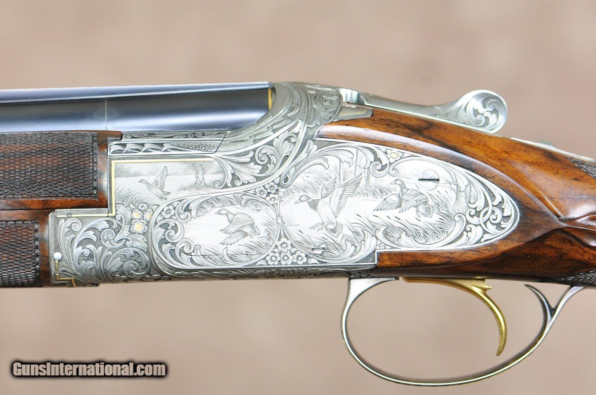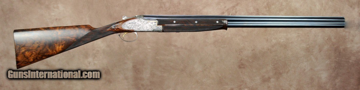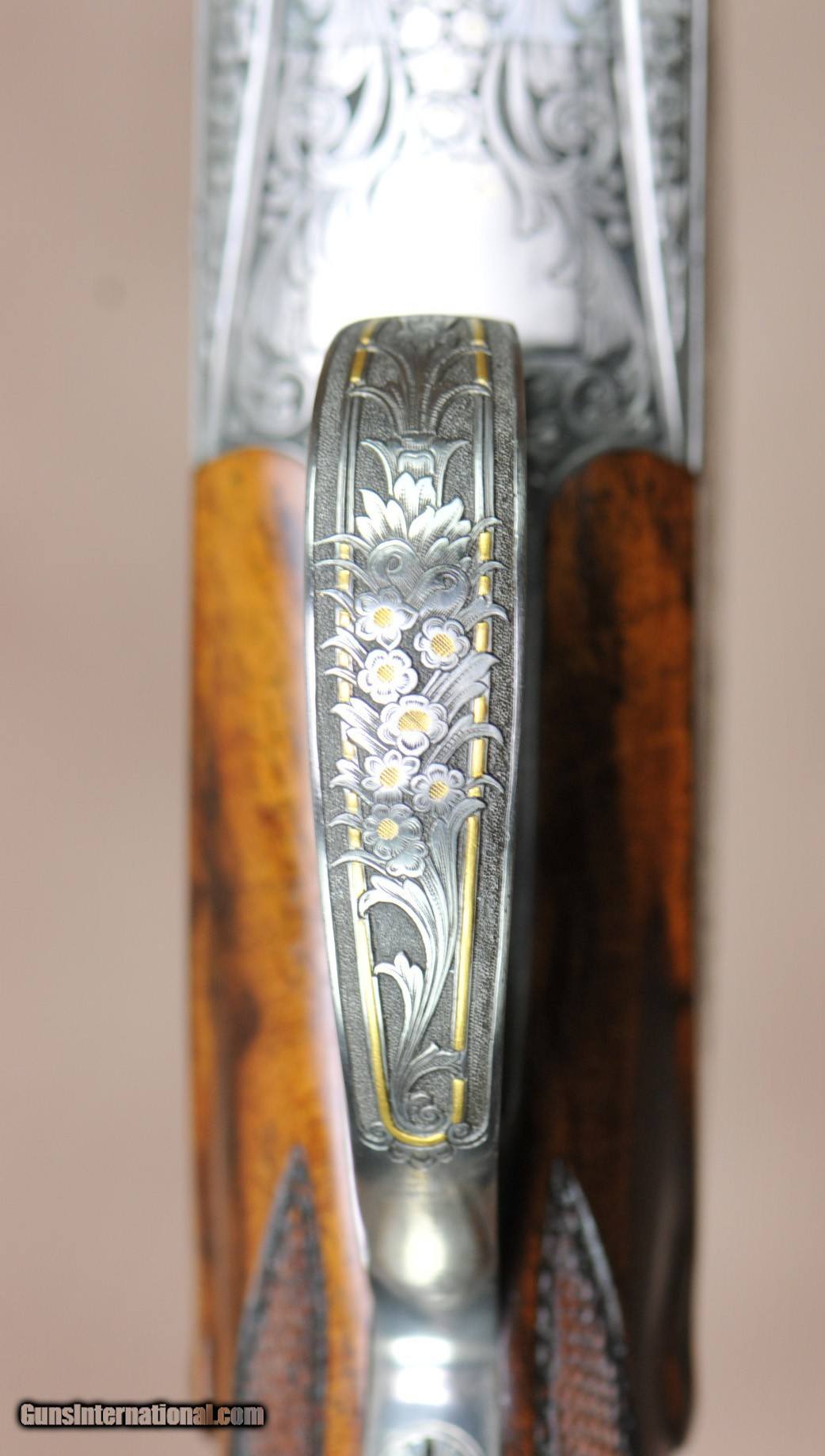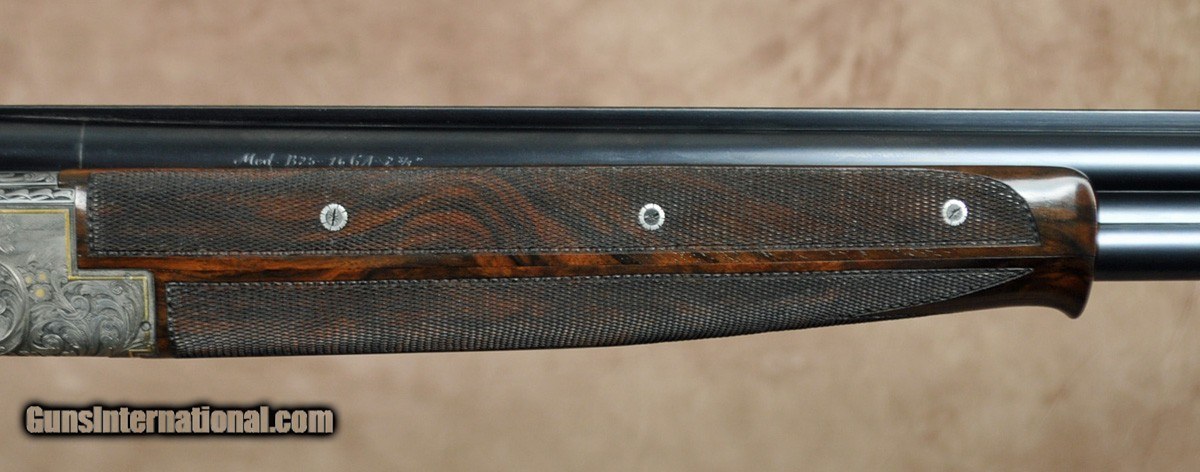 Description: Pre owned in ” Like New ” condition Browning B25 Superposed Custom 16 gauge. Out of the Custom shop, features hand engraved side plate game scenes by JM Martens. Fully engraved tang, 28″ and 29″ barrels with hand filed game ribs. Exhibition grade English straight stock, both fore arms are three piece. Emmebi case and original papers. SOLD |