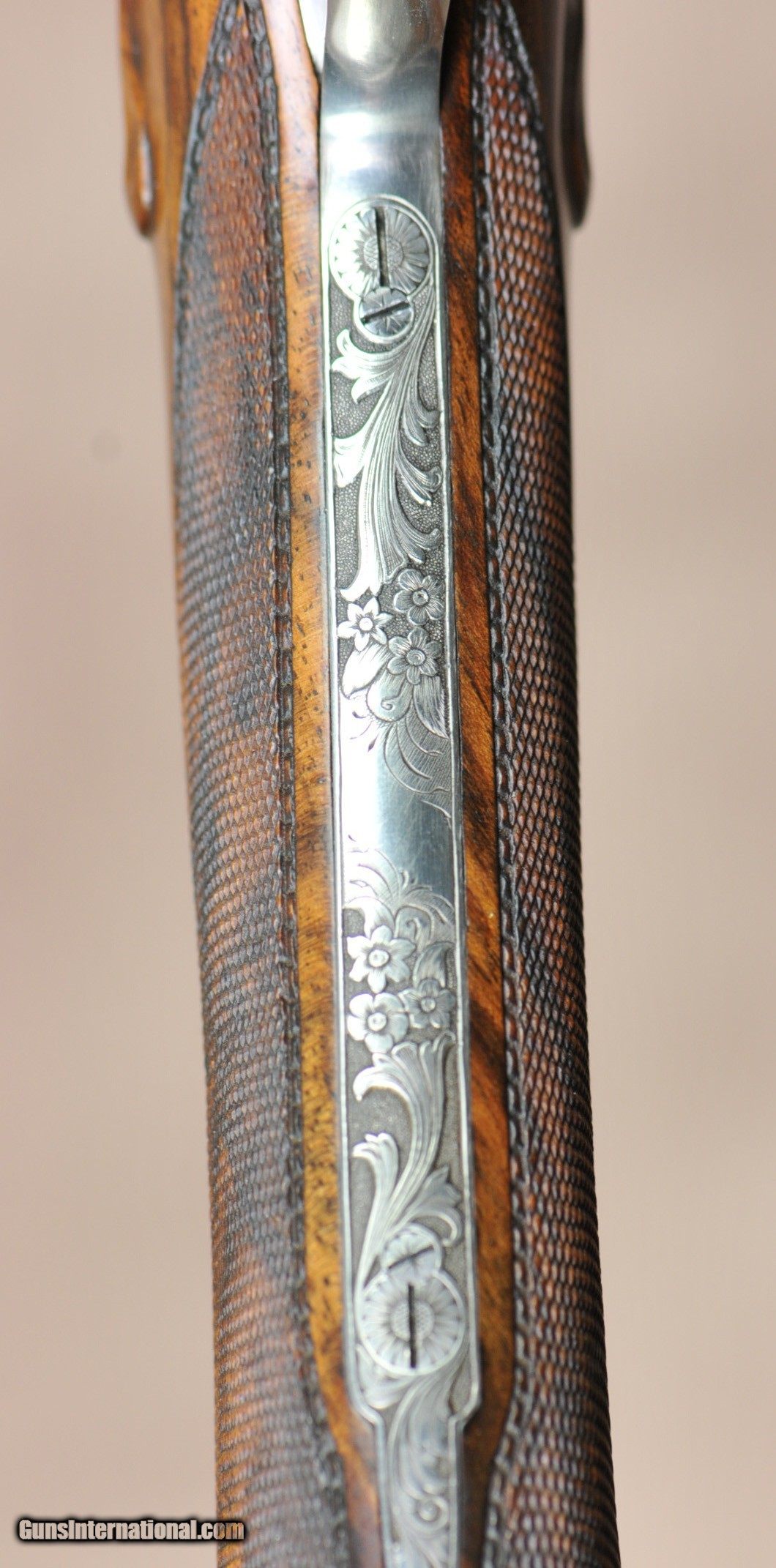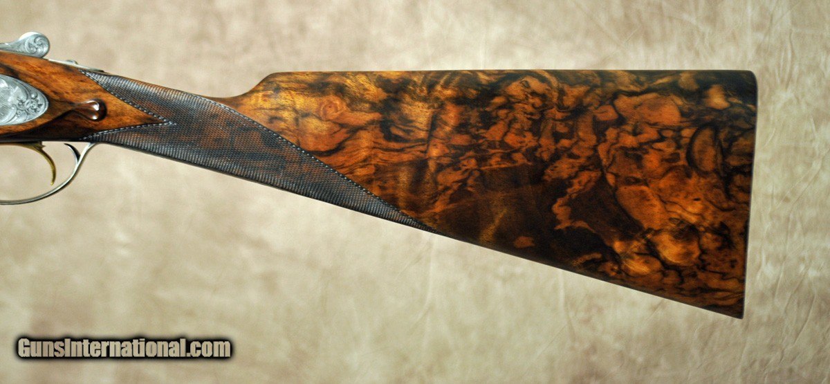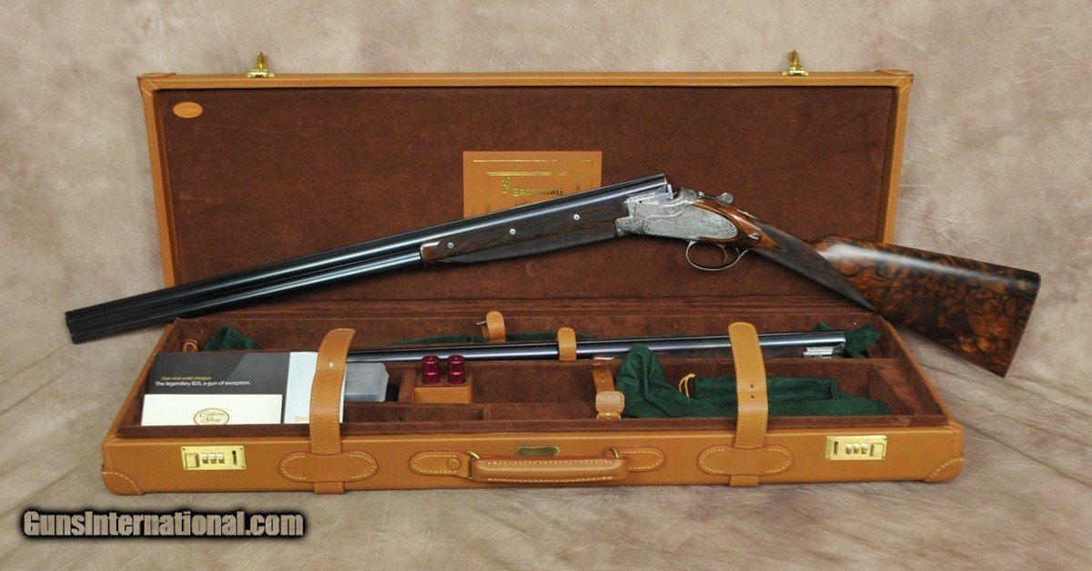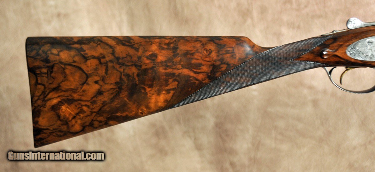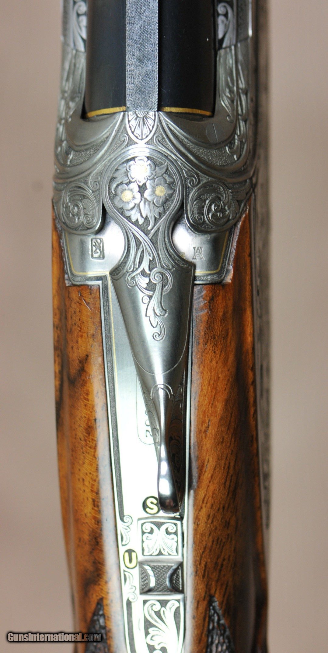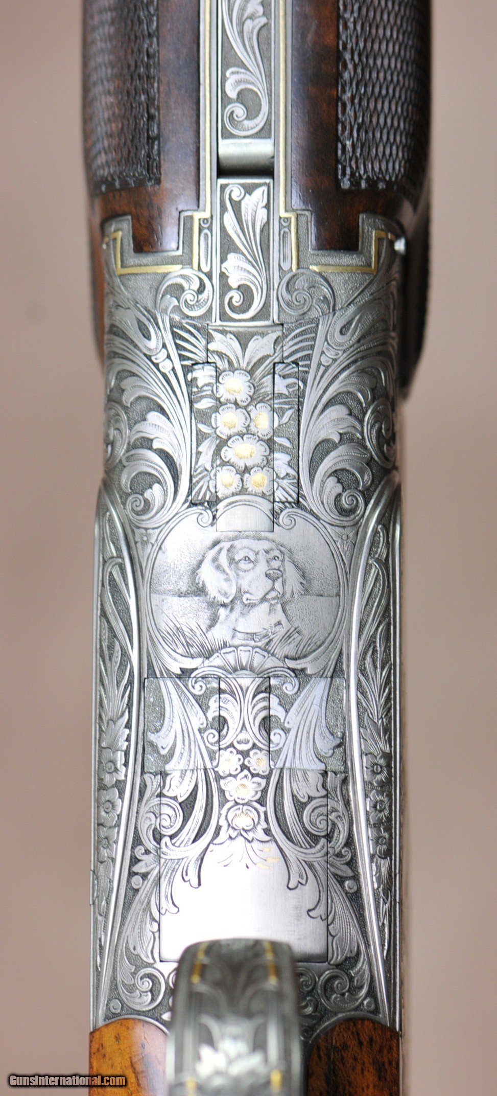Description: Pre owned in ” Like New ” condition Browning B25 Superposed Custom 16 gauge. Out of the Custom shop, features hand engraved side plate game scenes by JM Martens. Fully engraved tang, 28″ and 29″ barrels with hand filed game ribs. Exhibition grade English straight stock, both fore arms are three piece. Emmebi case and original papers. SOLD |