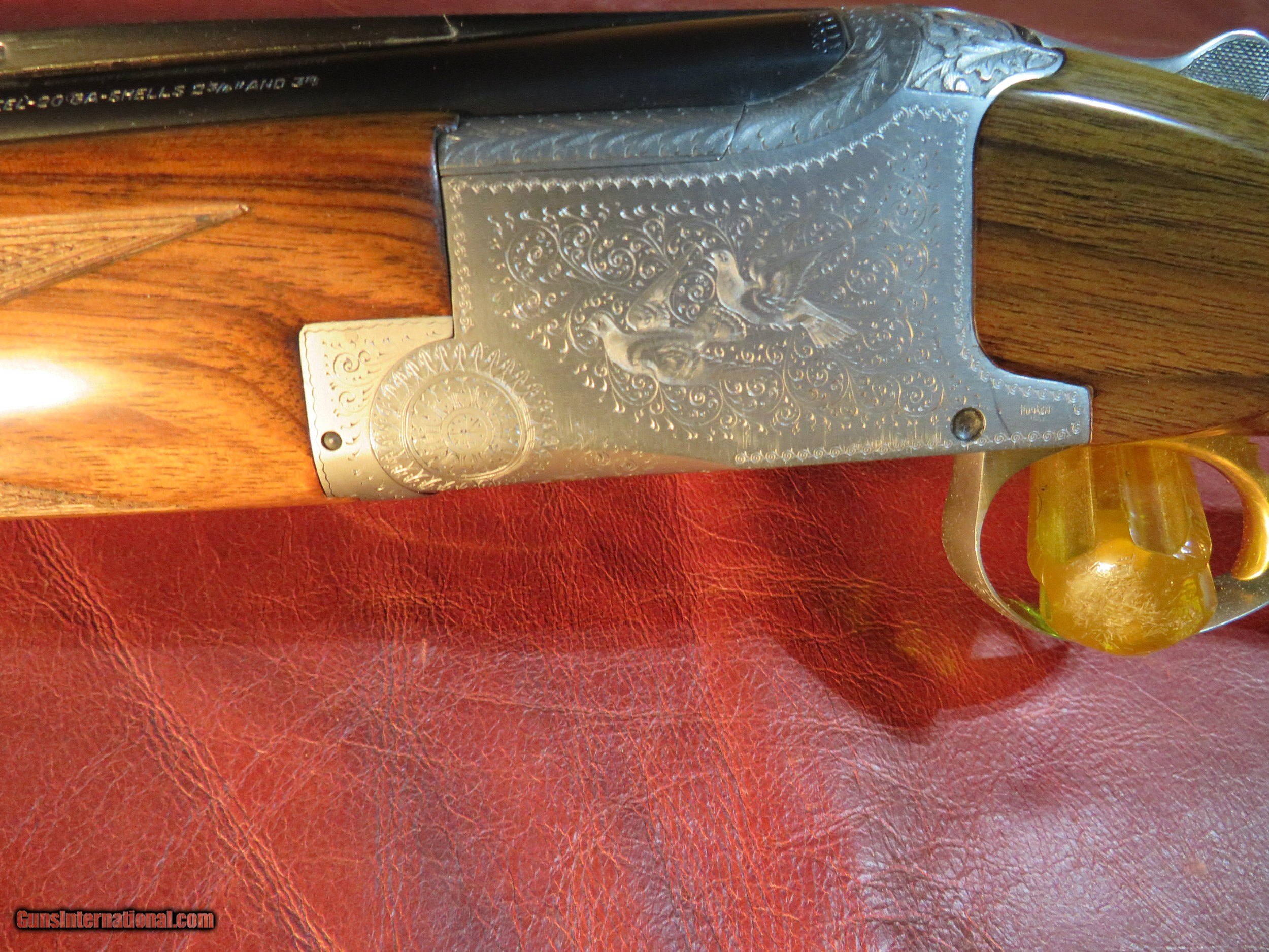 Description: SOLD Lovely grade 2 pigeon engraved by Funken 20 ga with mod/sk chokes High condition with a couple of what appear to be light shell scratches from a vest holder. Still pretty tight with lots of shooting left in it SOLD |