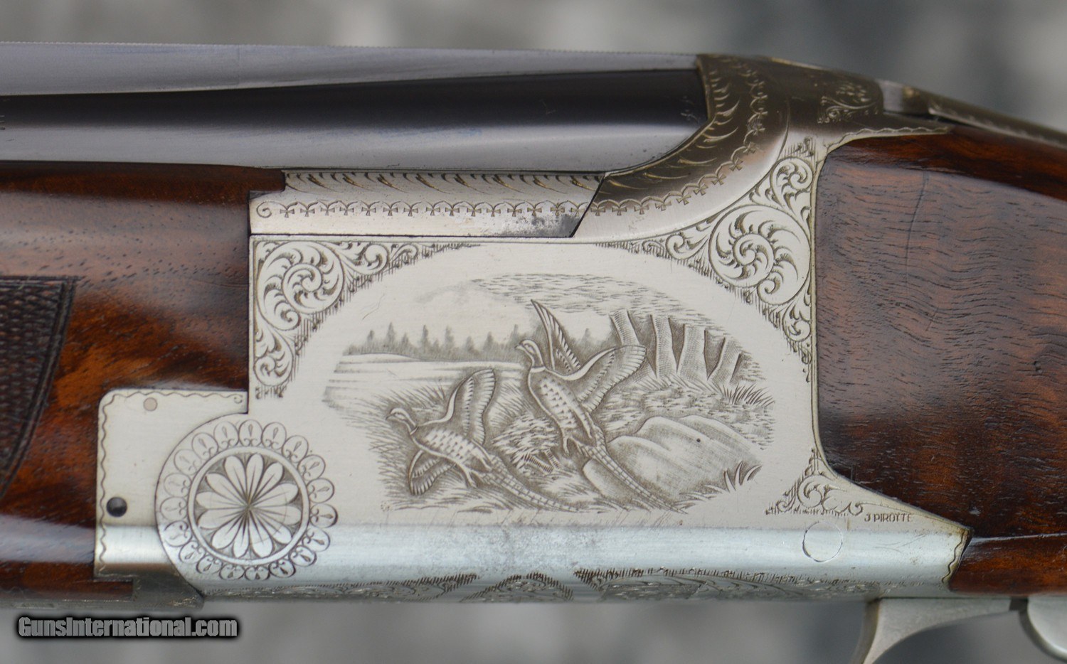 Description: Pre-Owned FN Browning B2G Broadway Trap 12GA with 30" .724 Bore fixed choke (.025/.030) barrels, checkered "Broadway" rib. Silver finisehd fully hand engraved "B2" Grade action featuring finely engraved game scenes framed by scrolls by Master Engraver J. Pirotte. Minor finish wear on action, some darkening. Minor bluing wear on barrels, minor bluing wear on checkering of rib; engraved long-tang. Factory pistol grip stock to the following dimensions: 1 1/2" DAC 1 3/4" DAH with 14 1/2" LOP to the center of the concave recoil pad. Completely neutral cast, no palmswell beavertail trap forearm. Gun weighs 7lbs 14ozs. Overall finish is in good condition, handling marks and dents in forearm and rear stock, no cracks. Does not include case. SOLD Shotgun Gauge: 12 Gauge |