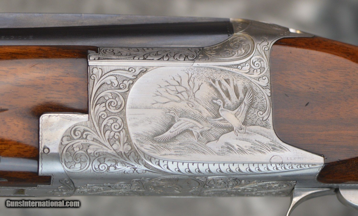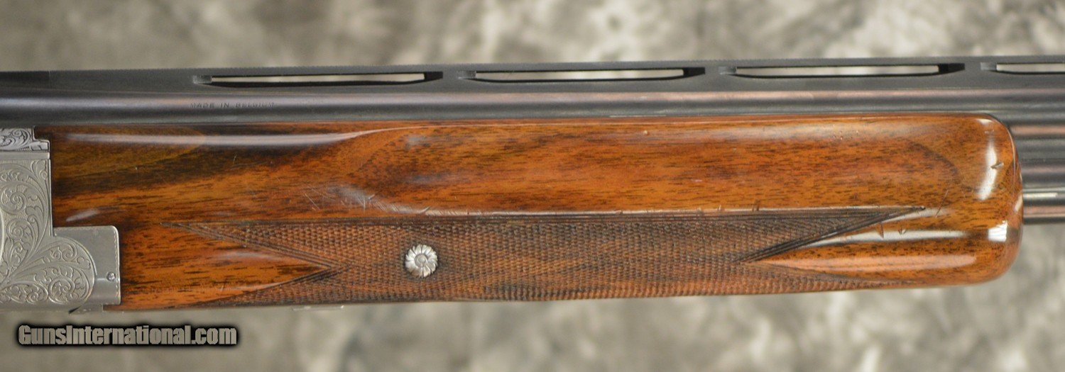 Description: Pre-Owned FN Browning C2G Broadway Pigeon 12GA with 30" .724 Bore Barrels, fixed (.040/.040) choke barrels, filed "Broadway" Rib. Features coin finished Scalloped Action with "C2" Grade engraving featuring deeply detailed game scenes framed by scrolls, fully hand engraved by the Belgian Master L. Lambert. Scarce Scalloped action, minor finish wear on receiver with some freckling, long tang. Screws have been taken out, factory pistol grip stock has been modified and refinished to the following dimensions: 1 5/8" DAC 2" DAH with 13 5/8" LOP to the center of a flat 1/2" recoil pad. Gun weighs 7lbs 14oz, beavertail trap forearm. Minor bluing wear on barrels. Stock was modified and refinished, but shows use and handling marks. Does not include case, but will ship in hard case. SOLD Shotgun Gauge: 12 Gauge |