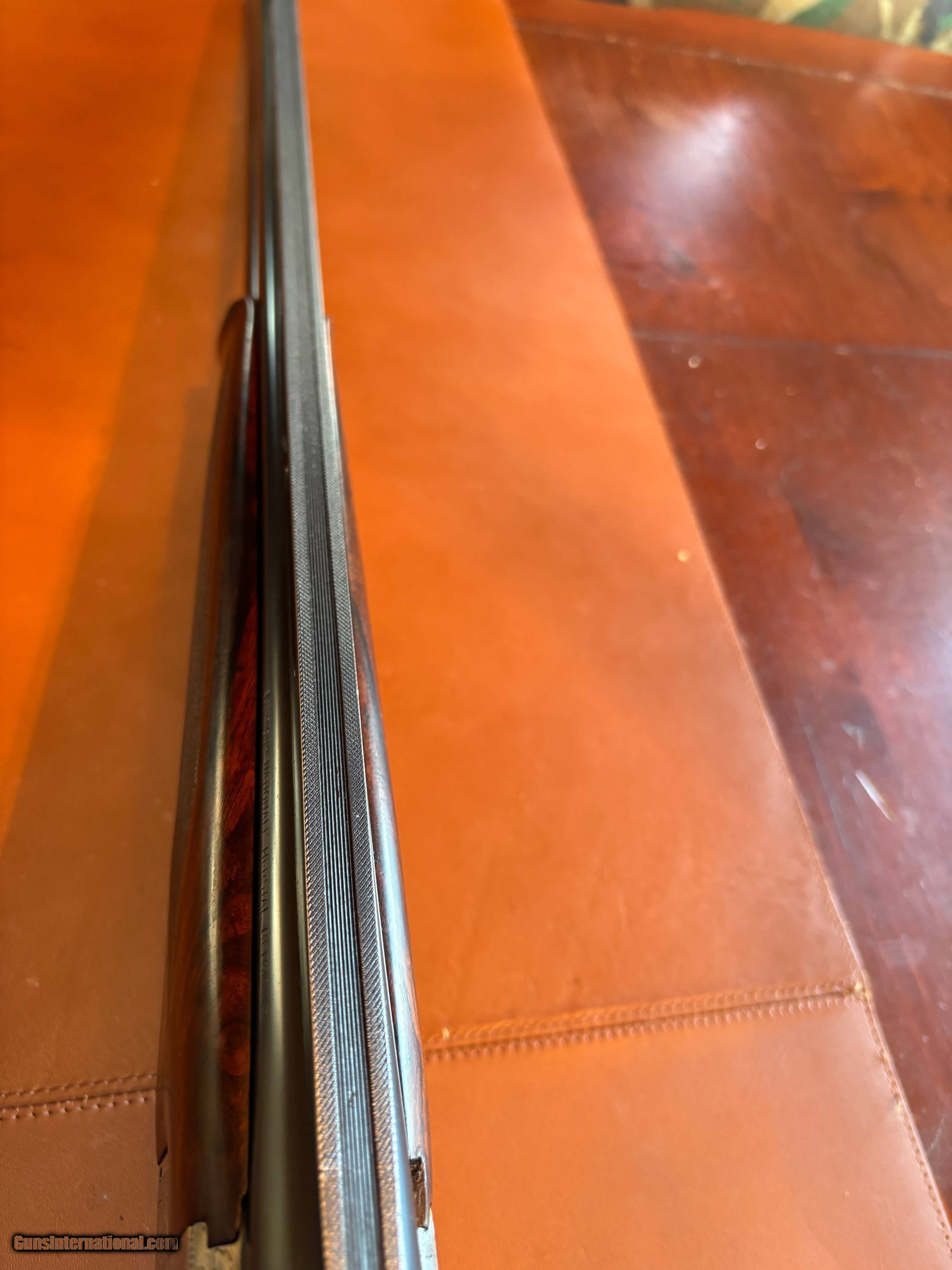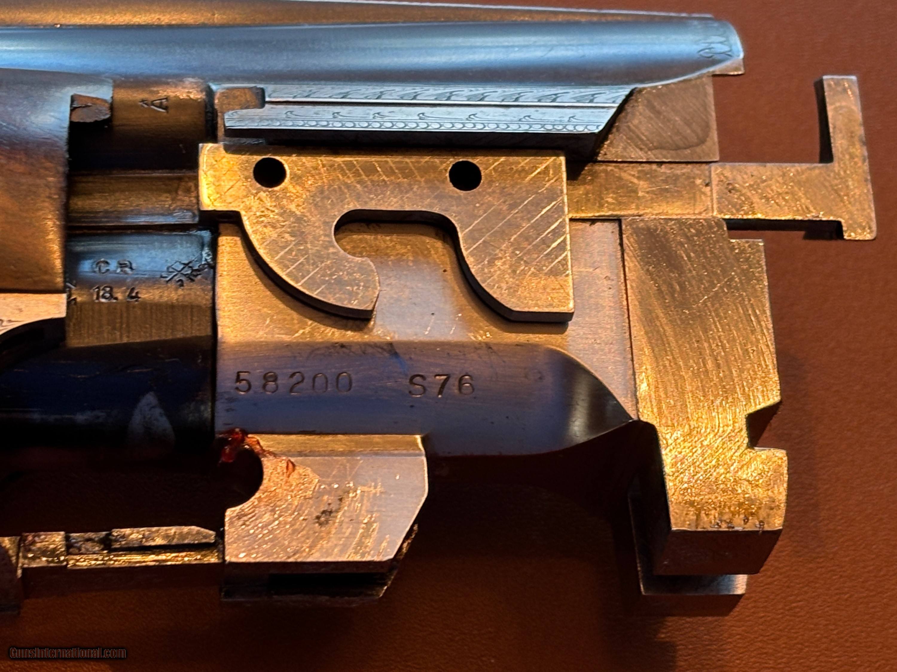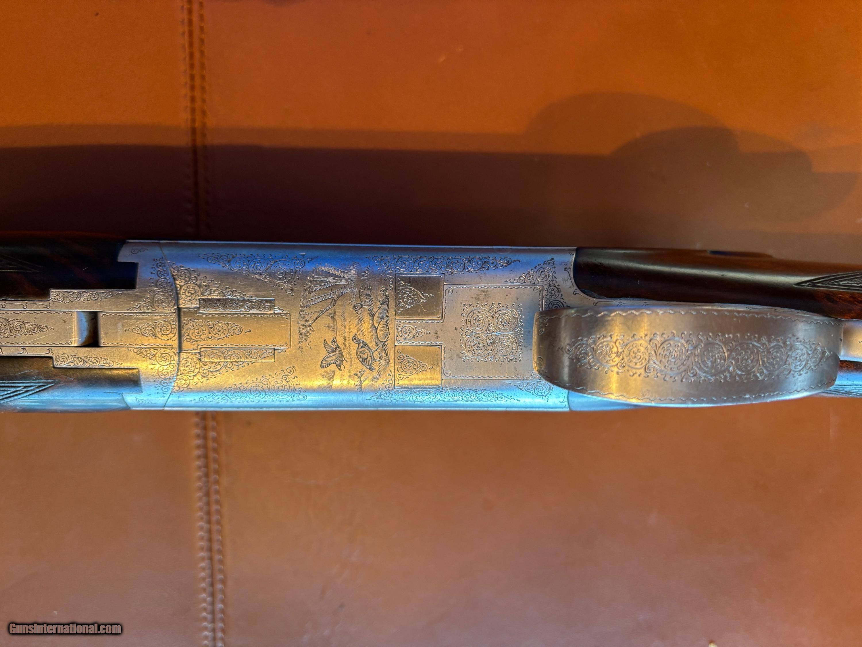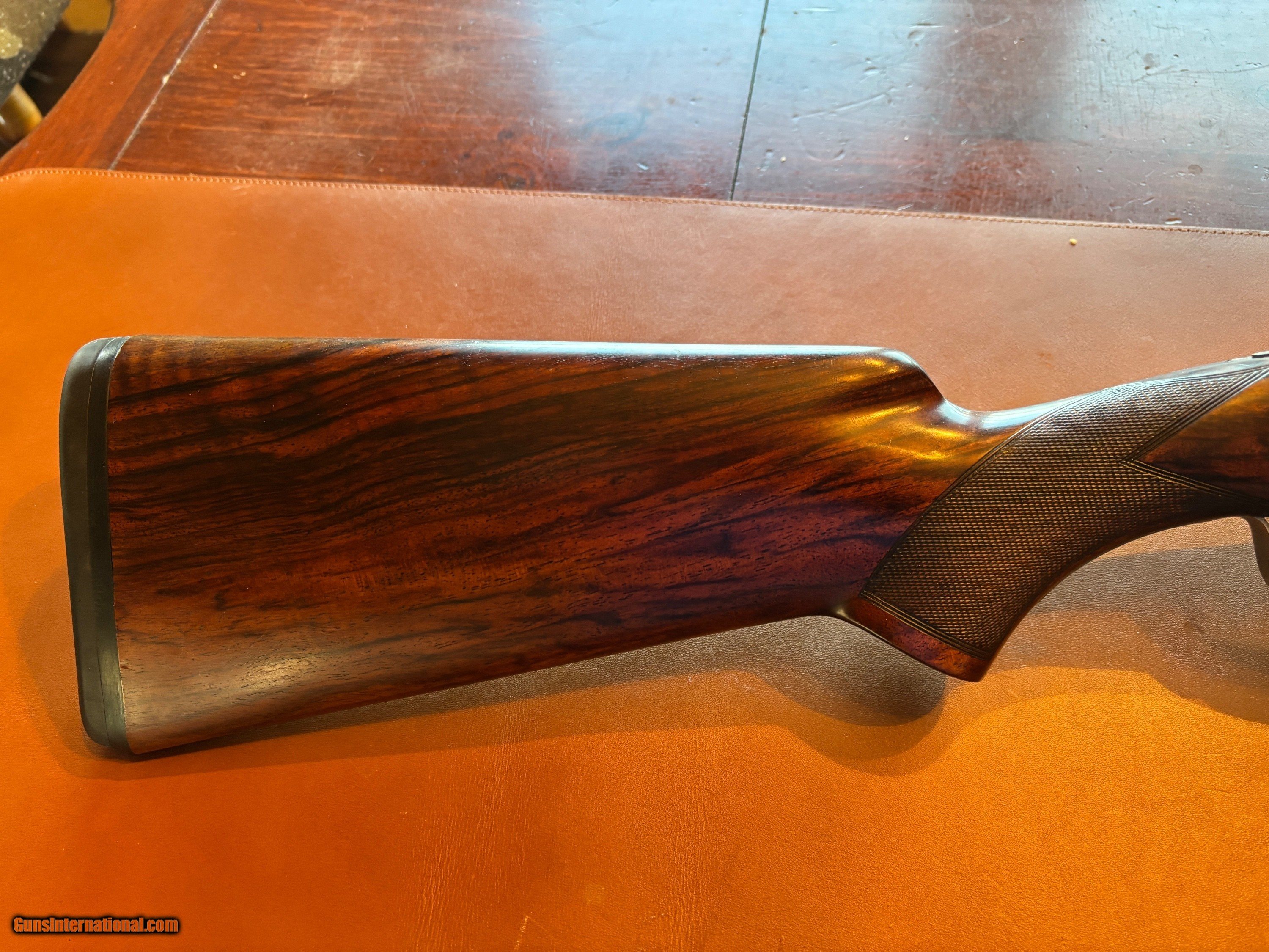 Description: FN Custom Shop C2 Cheverny grade Superposed B25 12 gauge O/U originally sold in England with Birmingham proofmark and chambered for 2 3/4" ammunition. This fine Custom Shop offering has the full PG buttstock with teardrops ( only found on Custom Shop guns)and tulip style forend of very highly figured French walnut with dimensions of 14 1/2" LOP from rear mechanical trigger ( introduced in 1970's) to a Soft KickEz pad, 1 1/2" comb, 2 1/2" heel with 3/8" cast off for a right handed shooter. There is one small chip at rear of forend, but wood is very solid. It has the later silver soldered Broadway type rib introduced in the 1970's to be more durable than the previous soft soldered type which quite often popped loose, usually on the rear. It has the 27 1/2" European length barrels with no choke designations on rear. It has the C2 Cheverny European engraving pattern with dogs, birds and scroll. This grade retailed at $2500 in 1976 when the Midas grade was $2650 in the U.S. This particular gun was retailed in England, probably by F. J. Wiseman in Birmingham, where Wiseman fitted the lower barrel with their proprietary 'Chokemaster' choke tubes in 1/4, 1/2, and 3/4 choke constrictions. The upper barrel has a fixed choke of modified from FN. S/N is 58200S76, which actually is from 1977. Engraving is very sharp and signed by L. Campo on satin receiver. Bores are excellent and the gun is fitted in a leather trunk case. $3,395.00 OBO Shotgun Gauge: 12 Gauge Manufacturer: FN Model: B25 Custom Shop Serial Number: 58200S76 Barrel Length: 27.5 Chambers: 2 3/4 Ejectors: Yes Condition: Excellent Metal Condition: Excellent Wood Condition: Excellent Bore Condition: Excellent Barrel Type: Fluid steel Action: B-25 Boxlock Triggers: Rear Position SST Stock: Full PG Stock Comb: 1 1/2 Stock Heel: 2 1/2 Stock Cast: 3/8" cast off for right hand Fore End: Custom Shop Tulip Style Butt Pad: 1" KickEz LOP: 14 1/2 Rib: Broadway style 2nd type silver soldered Finish: Satin metal and oil finish wood Weight: 7 lbs. 8 ozs. Sights: Bead front Manufacture Date: 1976-1977 Chokes: Custom Engraving: C2 Cheverny Item Location: N. C. Proof:Nitro: Yes, English 2 3/4" proof Price: $3,395.00 Contact Seller |
