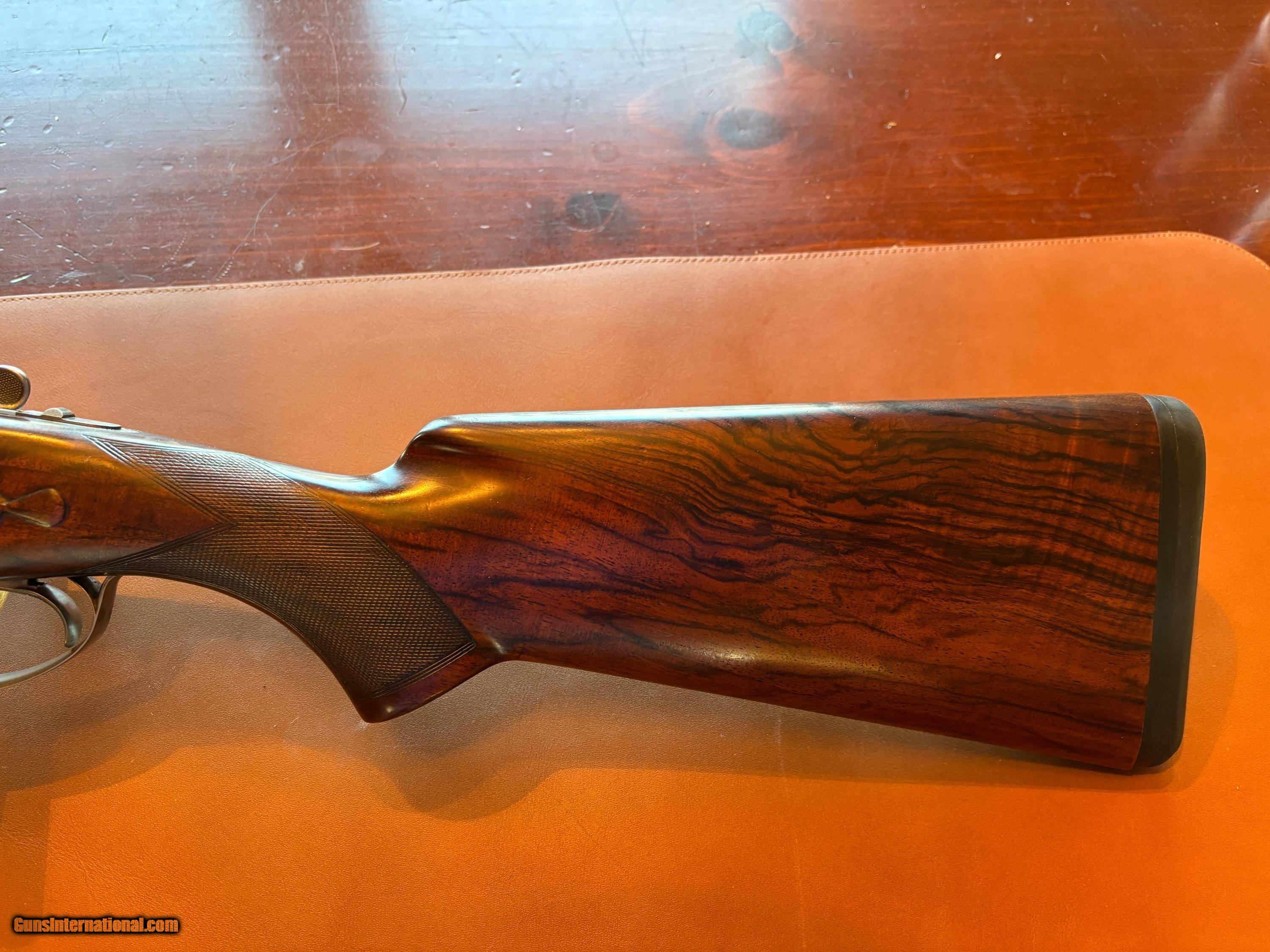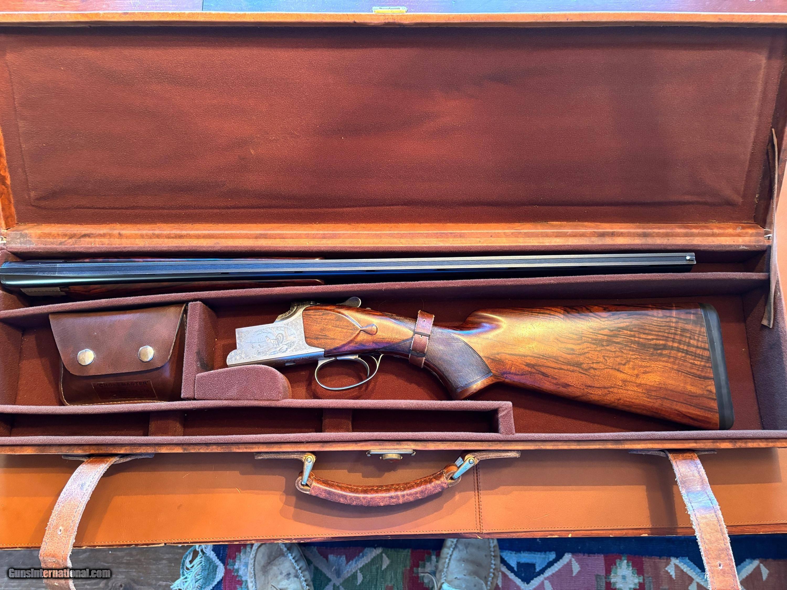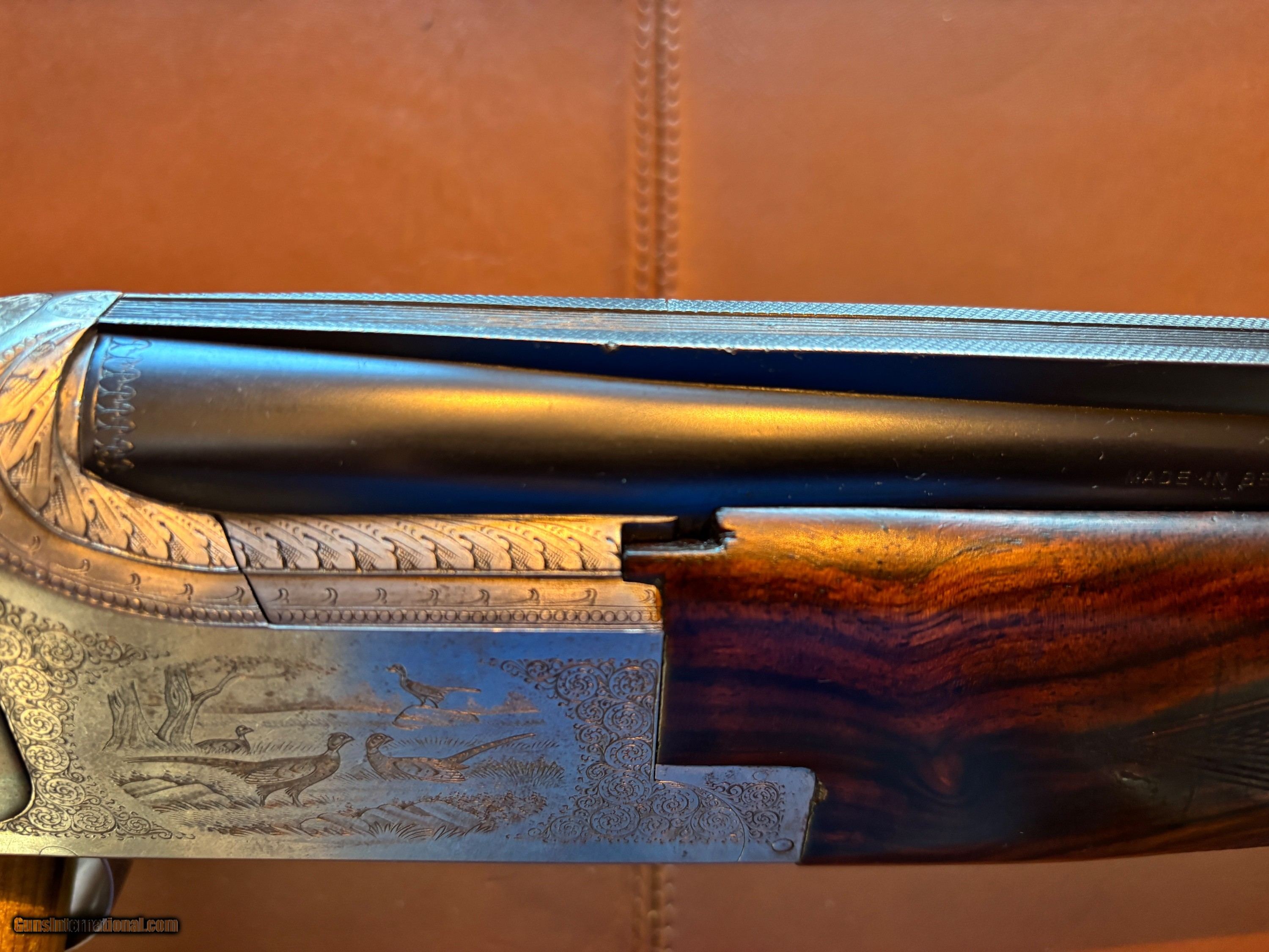 Description: FN Custom Shop C2 Cheverny grade Superposed B25 12 gauge O/U originally sold in England with Birmingham proofmark and chambered for 2 3/4" ammunition. This fine Custom Shop offering has the full PG buttstock with teardrops ( only found on Custom Shop guns)and tulip style forend of very highly figured French walnut with dimensions of 14 1/2" LOP from rear mechanical trigger ( introduced in 1970's) to a Soft KickEz pad, 1 1/2" comb, 2 1/2" heel with 3/8" cast off for a right handed shooter. There is one small chip at rear of forend, but wood is very solid. It has the later silver soldered Broadway type rib introduced in the 1970's to be more durable than the previous soft soldered type which quite often popped loose, usually on the rear. It has the 27 1/2" European length barrels with no choke designations on rear. It has the C2 Cheverny European engraving pattern with dogs, birds and scroll. This grade retailed at $2500 in 1976 when the Midas grade was $2650 in the U.S. This particular gun was retailed in England, probably by F. J. Wiseman in Birmingham, where Wiseman fitted the lower barrel with their proprietary 'Chokemaster' choke tubes in 1/4, 1/2, and 3/4 choke constrictions. The upper barrel has a fixed choke of modified from FN. S/N is 58200S76, which actually is from 1977. Engraving is very sharp and signed by L. Campo on satin receiver. Bores are excellent and the gun is fitted in a leather trunk case. $3,395.00 OBO Shotgun Gauge: 12 Gauge Manufacturer: FN Model: B25 Custom Shop Serial Number: 58200S76 Barrel Length: 27.5 Chambers: 2 3/4 Ejectors: Yes Condition: Excellent Metal Condition: Excellent Wood Condition: Excellent Bore Condition: Excellent Barrel Type: Fluid steel Action: B-25 Boxlock Triggers: Rear Position SST Stock: Full PG Stock Comb: 1 1/2 Stock Heel: 2 1/2 Stock Cast: 3/8" cast off for right hand Fore End: Custom Shop Tulip Style Butt Pad: 1" KickEz LOP: 14 1/2 Rib: Broadway style 2nd type silver soldered Finish: Satin metal and oil finish wood Weight: 7 lbs. 8 ozs. Sights: Bead front Manufacture Date: 1976-1977 Chokes: Custom Engraving: C2 Cheverny Item Location: N. C. Proof:Nitro: Yes, English 2 3/4" proof Price: $3,395.00 Contact Seller |