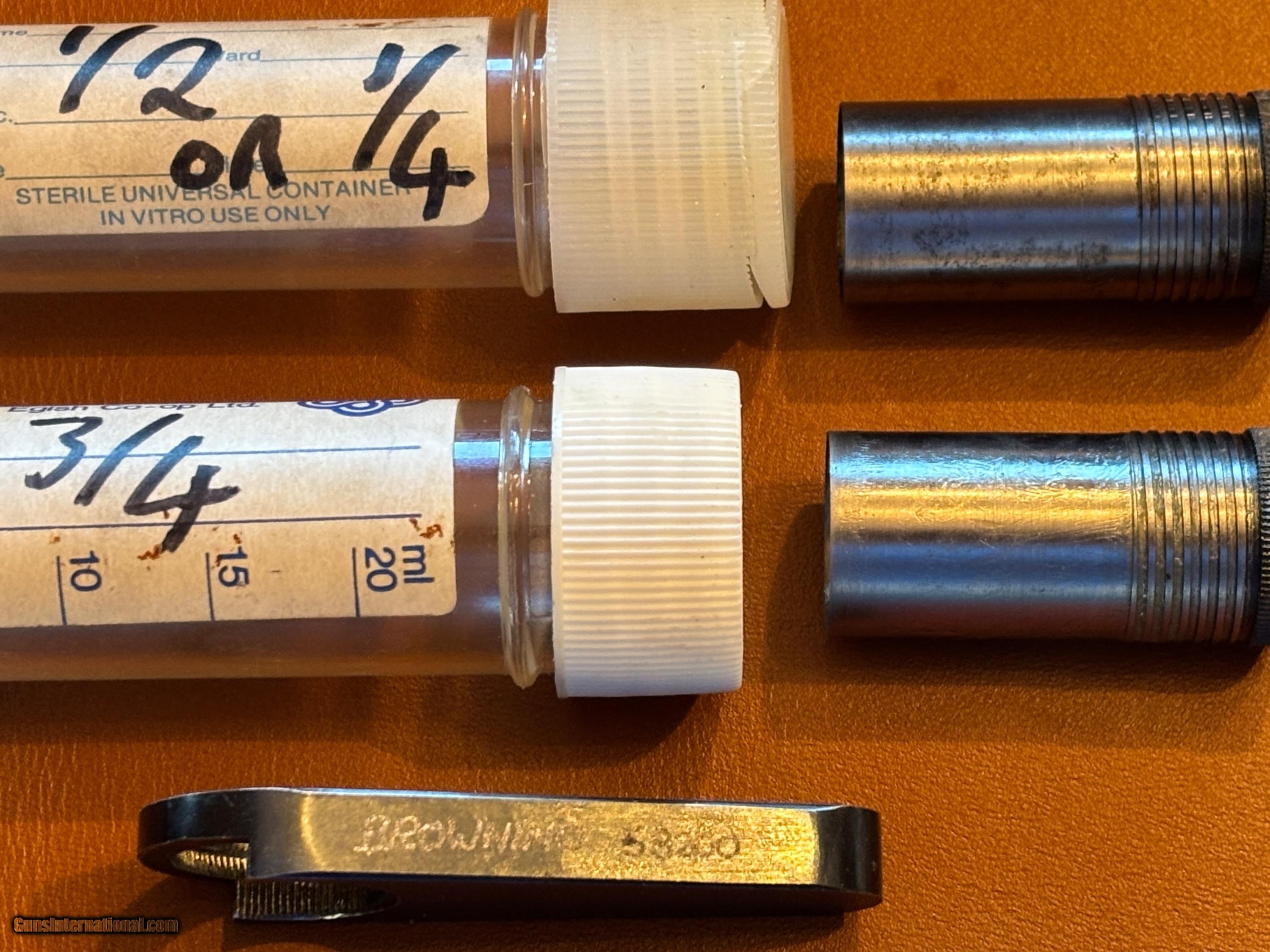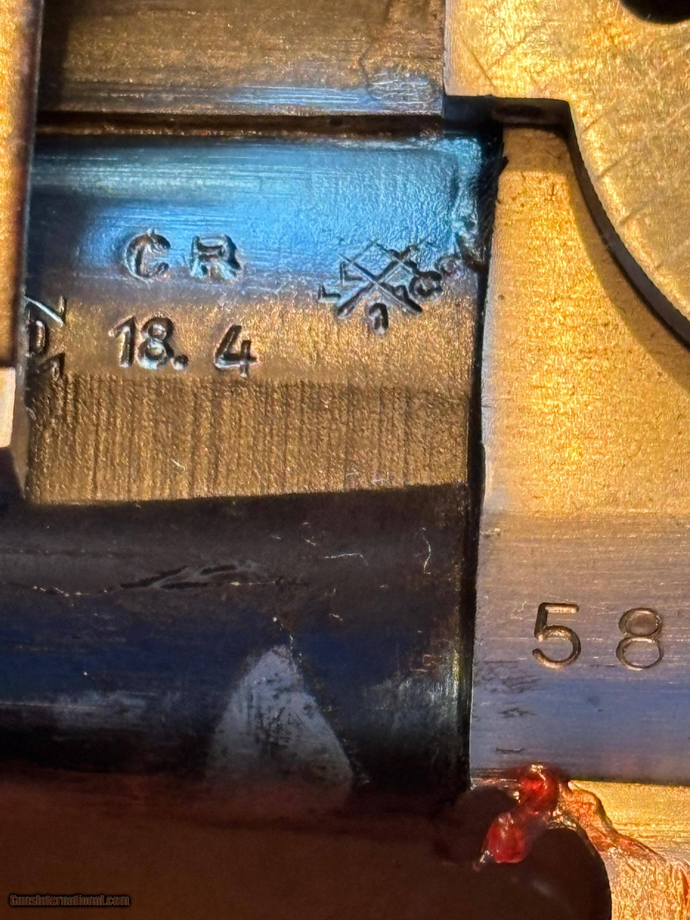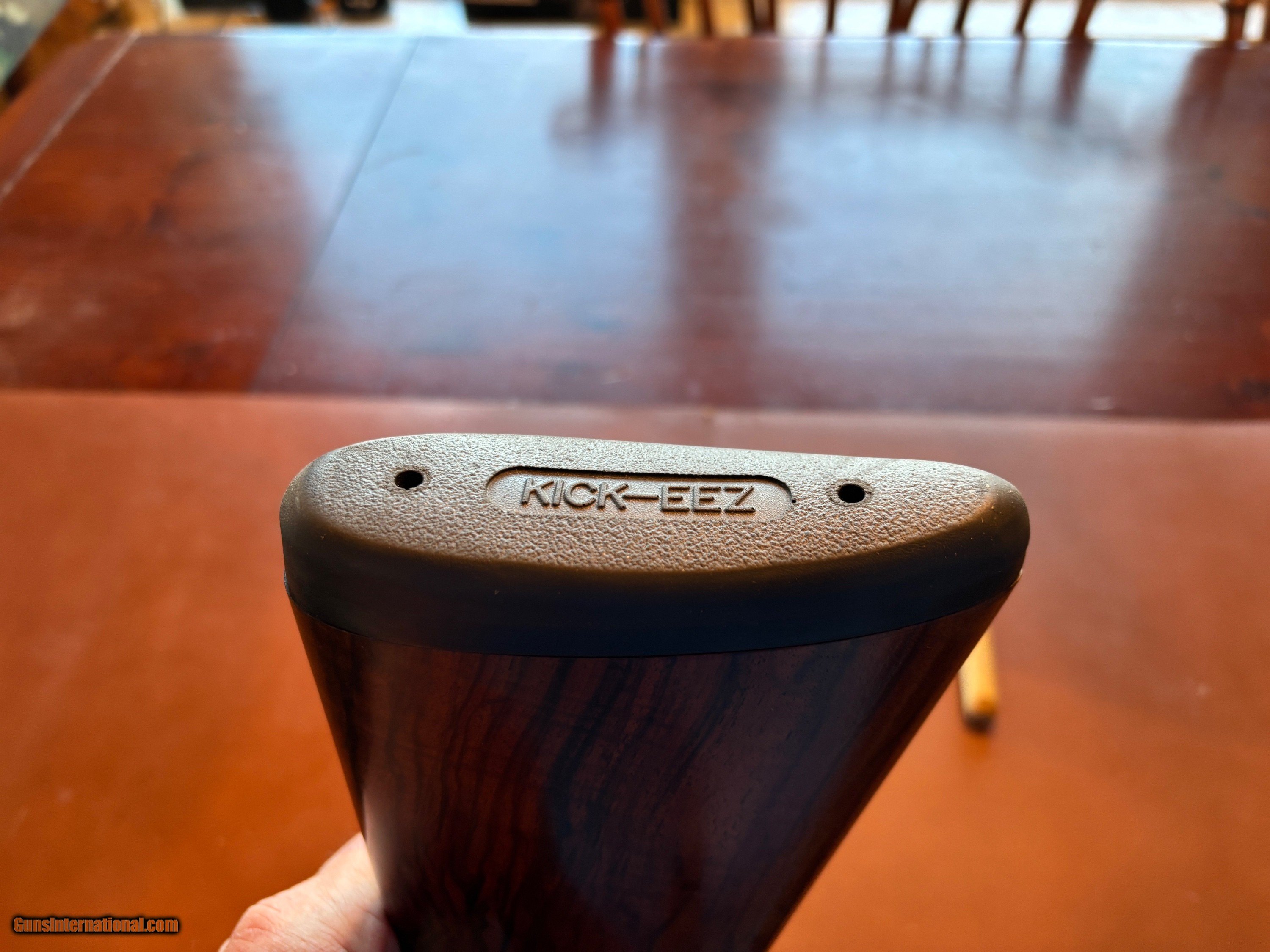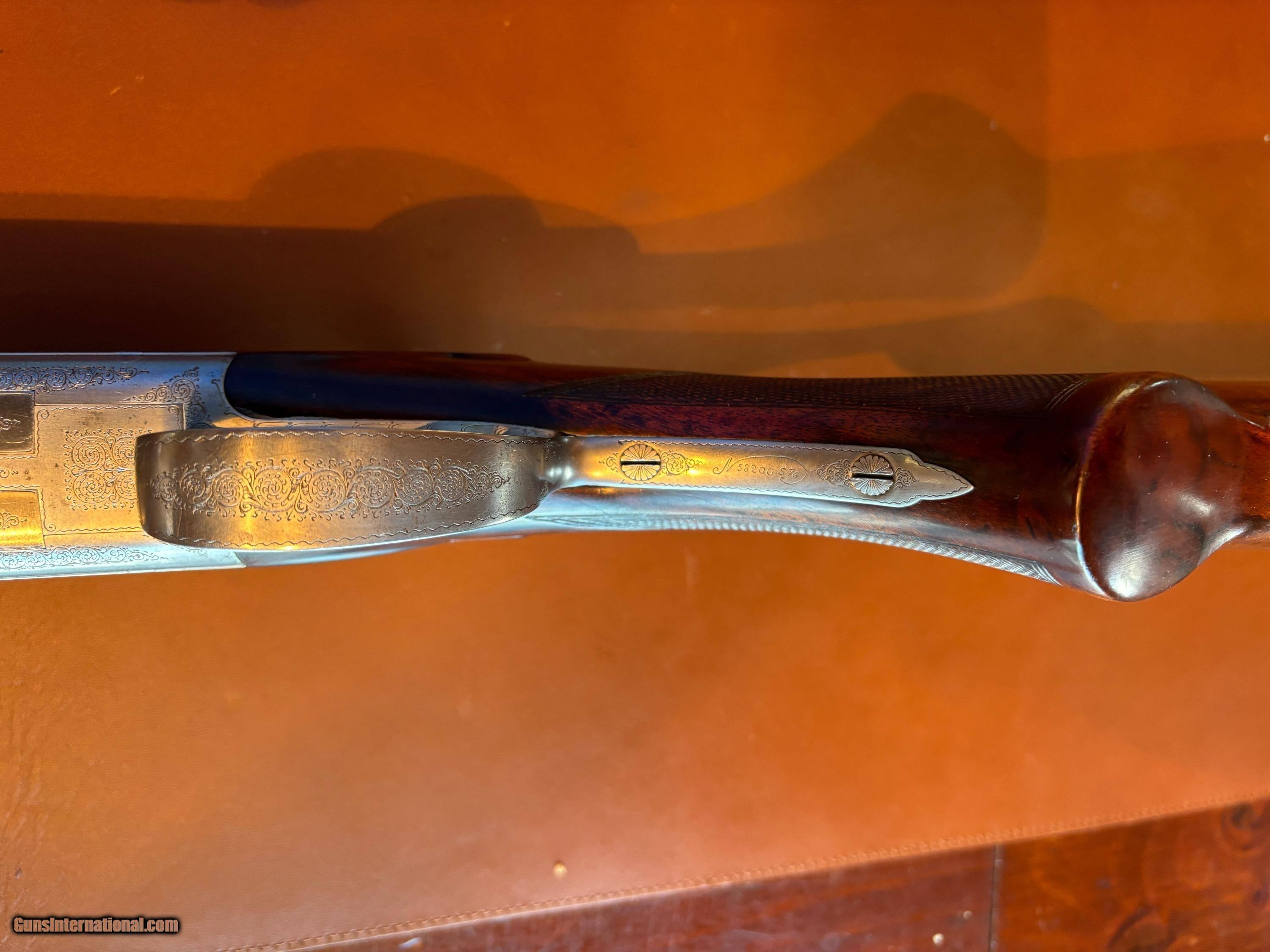 Description: FN Custom Shop C2 Cheverny grade Superposed B25 12 gauge O/U originally sold in England with Birmingham proofmark and chambered for 2 3/4" ammunition. This fine Custom Shop offering has the full PG buttstock with teardrops ( only found on Custom Shop guns)and tulip style forend of very highly figured French walnut with dimensions of 14 1/2" LOP from rear mechanical trigger ( introduced in 1970's) to a Soft KickEz pad, 1 1/2" comb, 2 1/2" heel with 3/8" cast off for a right handed shooter. There is one small chip at rear of forend, but wood is very solid. It has the later silver soldered Broadway type rib introduced in the 1970's to be more durable than the previous soft soldered type which quite often popped loose, usually on the rear. It has the 27 1/2" European length barrels with no choke designations on rear. It has the C2 Cheverny European engraving pattern with dogs, birds and scroll. This grade retailed at $2500 in 1976 when the Midas grade was $2650 in the U.S. This particular gun was retailed in England, probably by F. J. Wiseman in Birmingham, where Wiseman fitted the lower barrel with their proprietary 'Chokemaster' choke tubes in 1/4, 1/2, and 3/4 choke constrictions. The upper barrel has a fixed choke of modified from FN. S/N is 58200S76, which actually is from 1977. Engraving is very sharp and signed by L. Campo on satin receiver. Bores are excellent and the gun is fitted in a leather trunk case. $3,395.00 OBO Shotgun Gauge: 12 Gauge Manufacturer: FN Model: B25 Custom Shop Serial Number: 58200S76 Barrel Length: 27.5 Chambers: 2 3/4 Ejectors: Yes Condition: Excellent Metal Condition: Excellent Wood Condition: Excellent Bore Condition: Excellent Barrel Type: Fluid steel Action: B-25 Boxlock Triggers: Rear Position SST Stock: Full PG Stock Comb: 1 1/2 Stock Heel: 2 1/2 Stock Cast: 3/8" cast off for right hand Fore End: Custom Shop Tulip Style Butt Pad: 1" KickEz LOP: 14 1/2 Rib: Broadway style 2nd type silver soldered Finish: Satin metal and oil finish wood Weight: 7 lbs. 8 ozs. Sights: Bead front Manufacture Date: 1976-1977 Chokes: Custom Engraving: C2 Cheverny Item Location: N. C. Proof:Nitro: Yes, English 2 3/4" proof Price: $3,395.00 Contact Seller |