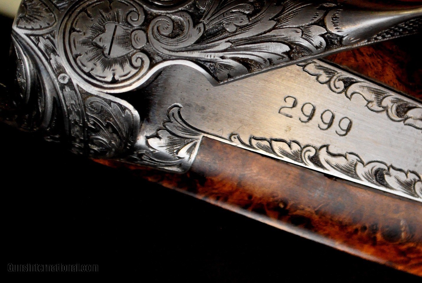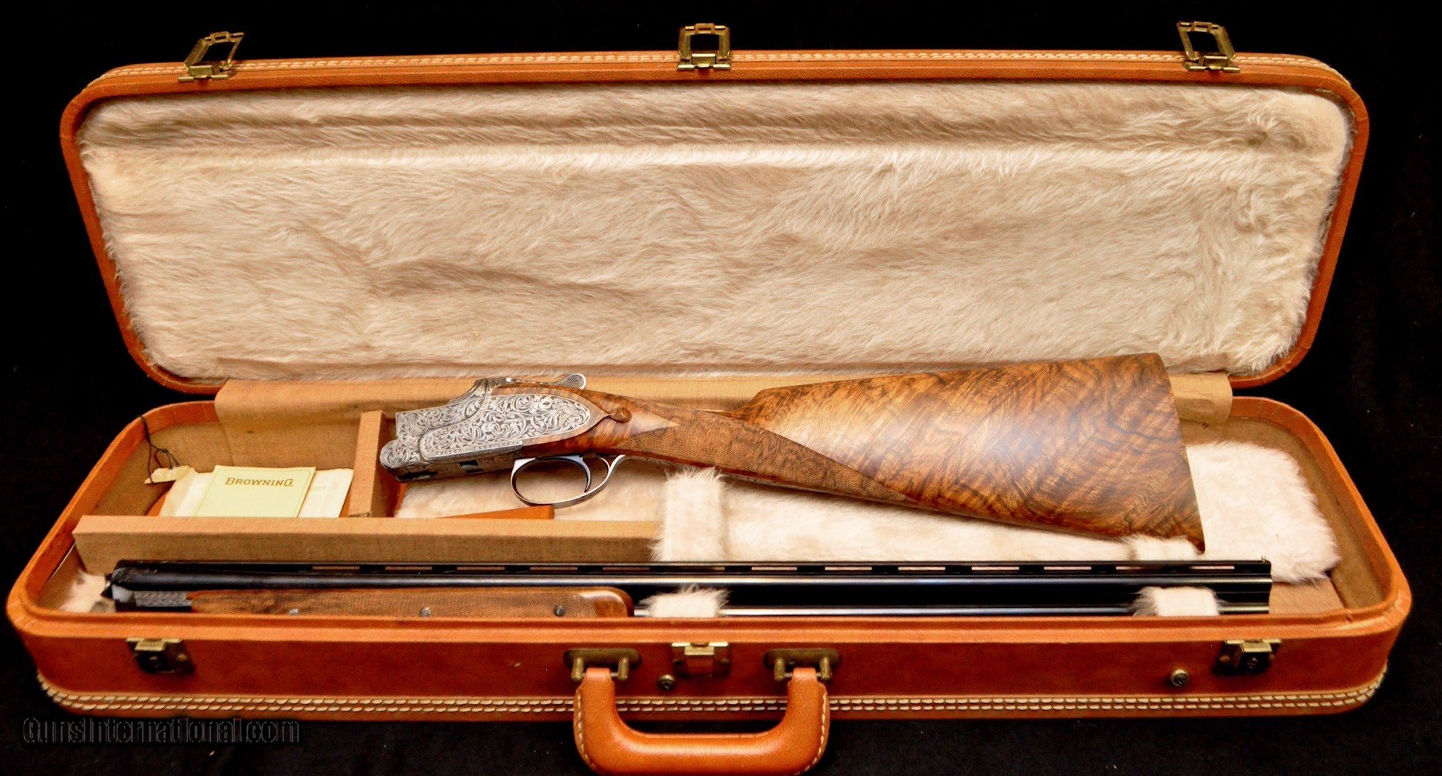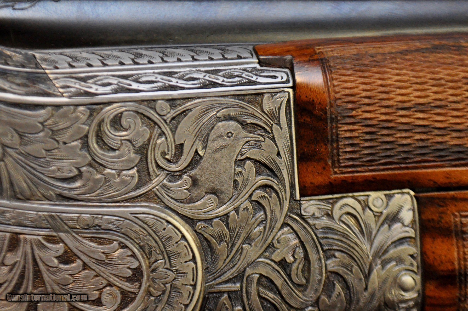 Description: Easily the most fantastic and high art Superposed I have sold in the last several years. This particular gun is truly a work of art. Made with 26-1/2" barrels that have low profile ventilated rib. Three piece forend with Schnabel tip is beautifully checkered. The receiver is full coverage engraved and signed by Smetz near the trigger guard with incredible relief engraving and hidden game birds of the highest quality as seen in the photos. The exhibition Turkish Walnut buttstock is of the one of the most highly figured pieces of wood on a gun I've ever owned. Checkered butt which is finished in skip line checkering. The gun is housed in a Browning Airways case. The gun remains in unfired condition retaining virutally all of its custom finish to both the wood and the metal. It would be hard to imagine a more beautifully done Superposed than this. This gun is priced at $24,500 plus shipping. Please dont hesitate to contact me with any questions or reasonable offers at (704) 280-2382 or via PM on this site. SOLD Shotgun Gauge: .410 Gauge Manufacturer: Browning Model: Custom Exhibition Serial Number: 2999 Barrel Length: 26-1/2 Chambers: 3 Ejectors: Yes Condition: As new Metal Condition: As New Wood Condition: As new Bore Condition: Brilliant and shiny Triggers: Gold plated SST Stock Comb: 1-3/8 Stock Heel: 1-7/8 Fore End: 3 piece Butt Pad: Checkered butt LOP: 15 Weight: 6lbs 10oz |