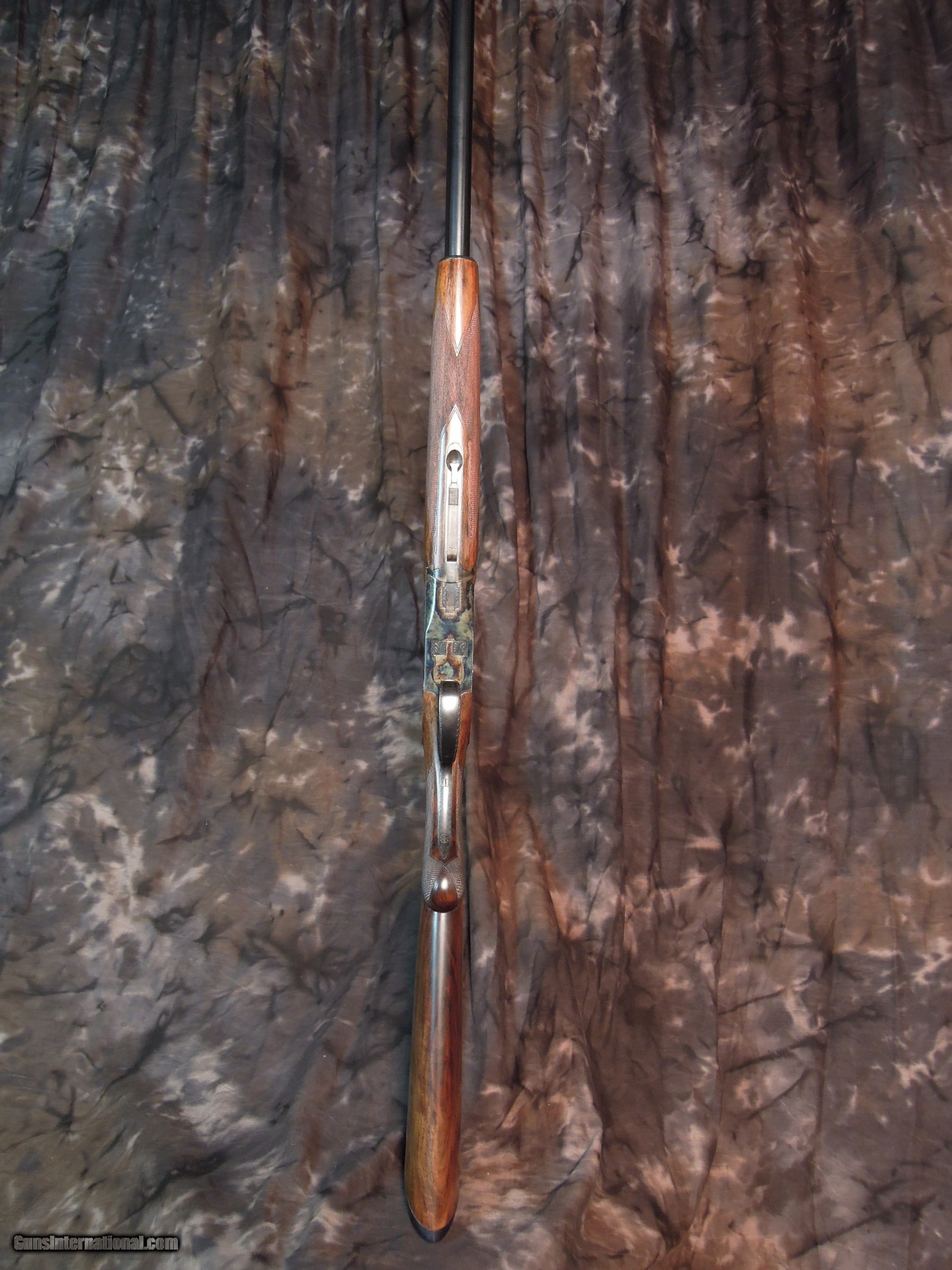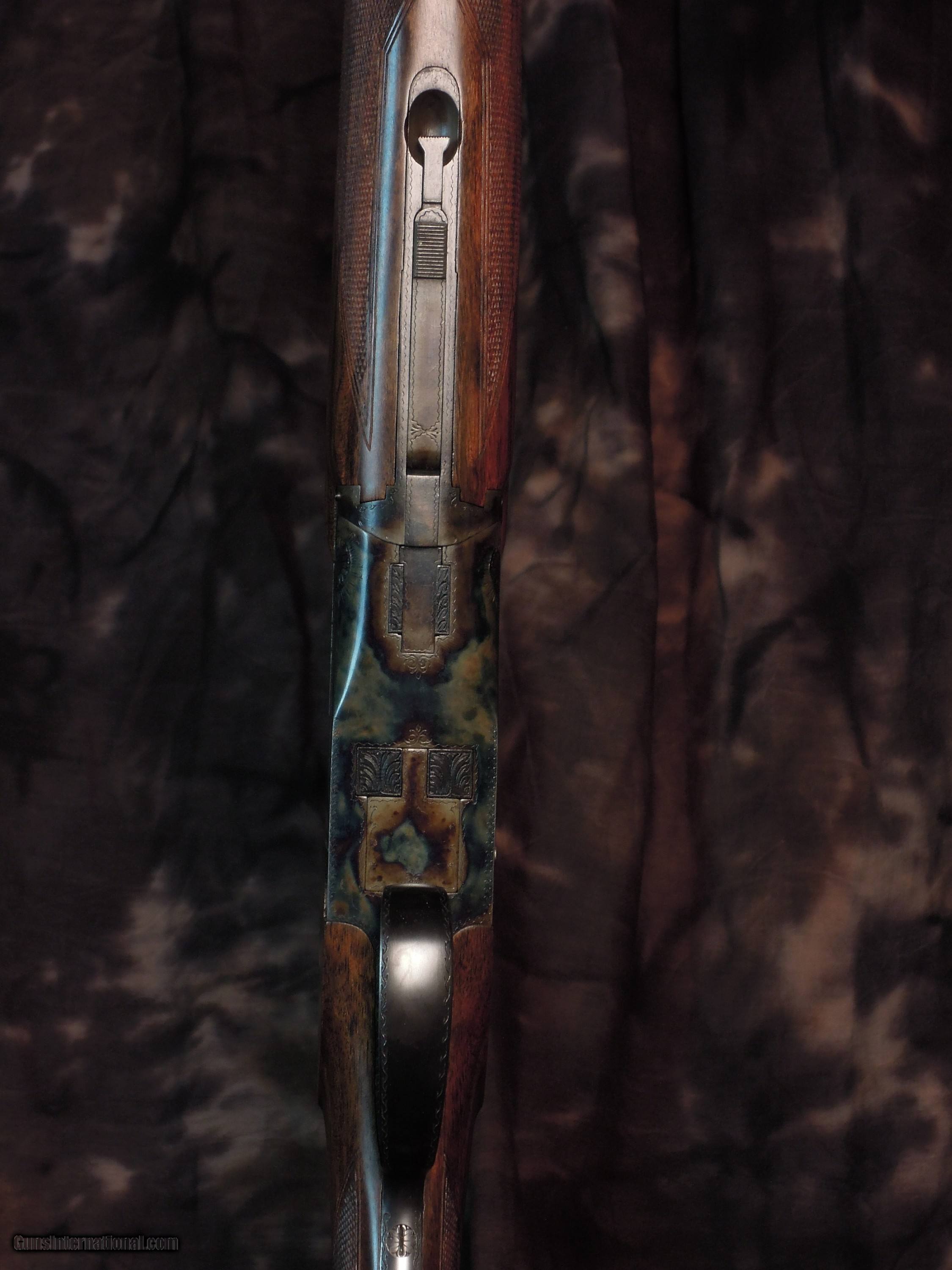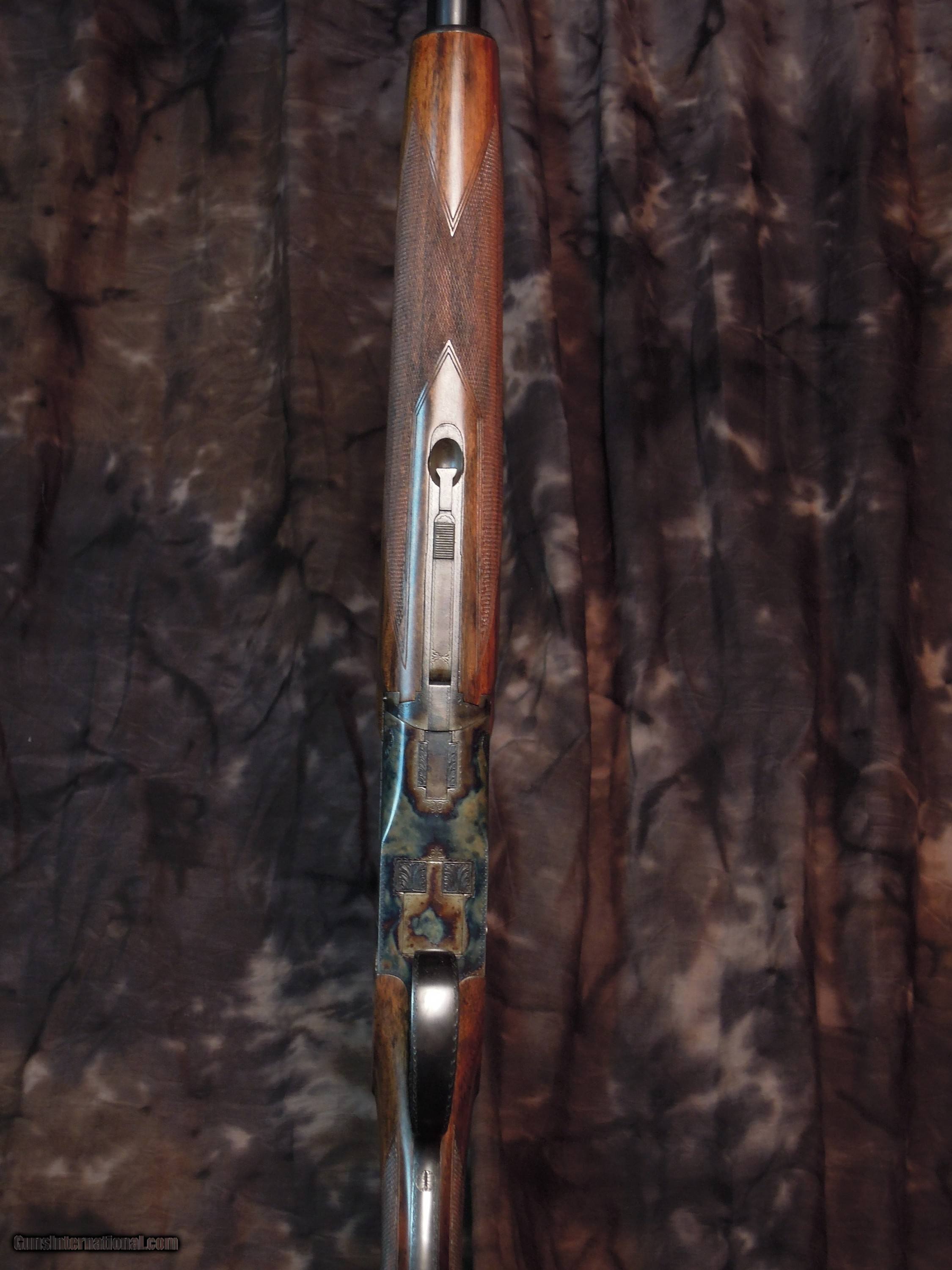 Description: Restored Pre War Browning Superposed with 32 inch barrels and double triggers. Remains in unfired condition. Early and rare 32 inch CONCAVE mat rib, double beads, and double triggers.Bores are bright and shiny with no pitting. There are no choke markings on the barrels,but chokes are IM/Full. Gun is new as restored and restocked. Stock is 1 3/8" x 1/ 3/4" x 15 " to period correct Browning butt plate. St Louis address on left barrel address. Beautiful Superposed. Enjoy the photos and I am happy to answer any questions that you may have. Or if you prefer make inquires though email SOLD |