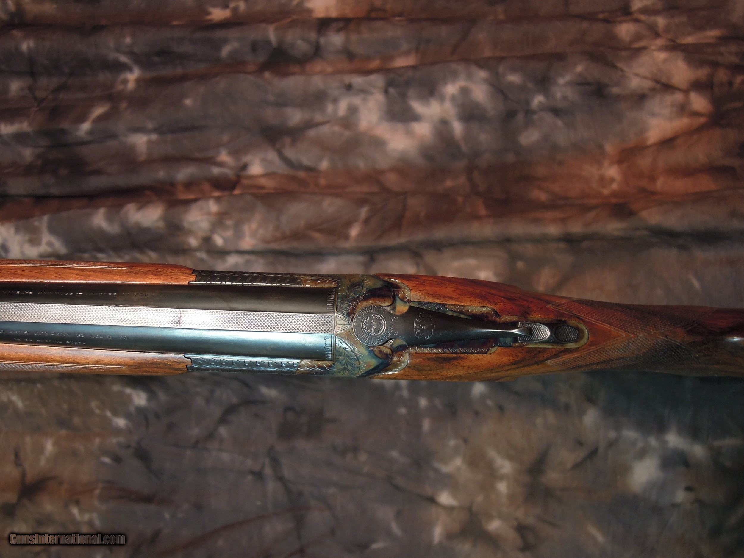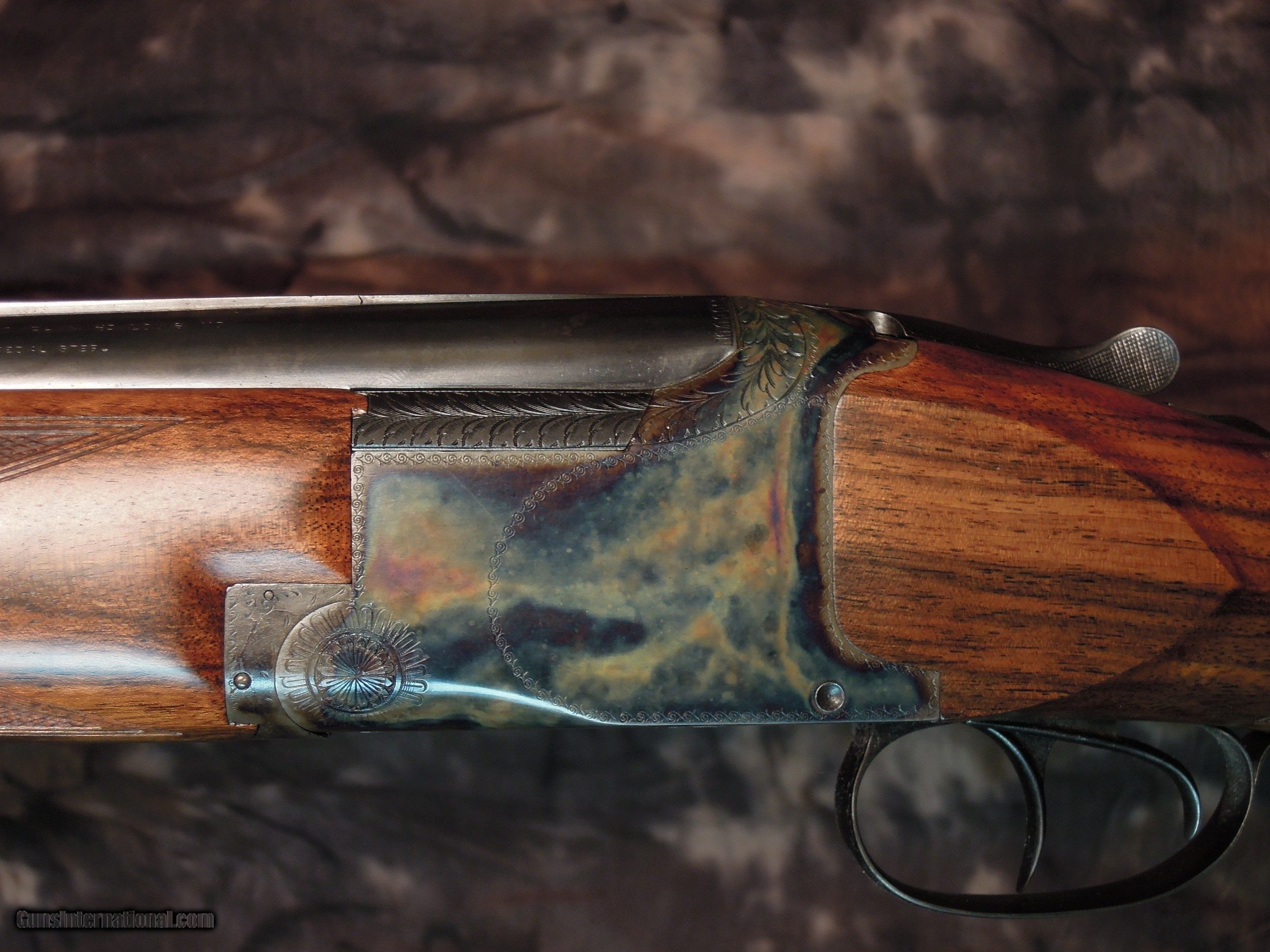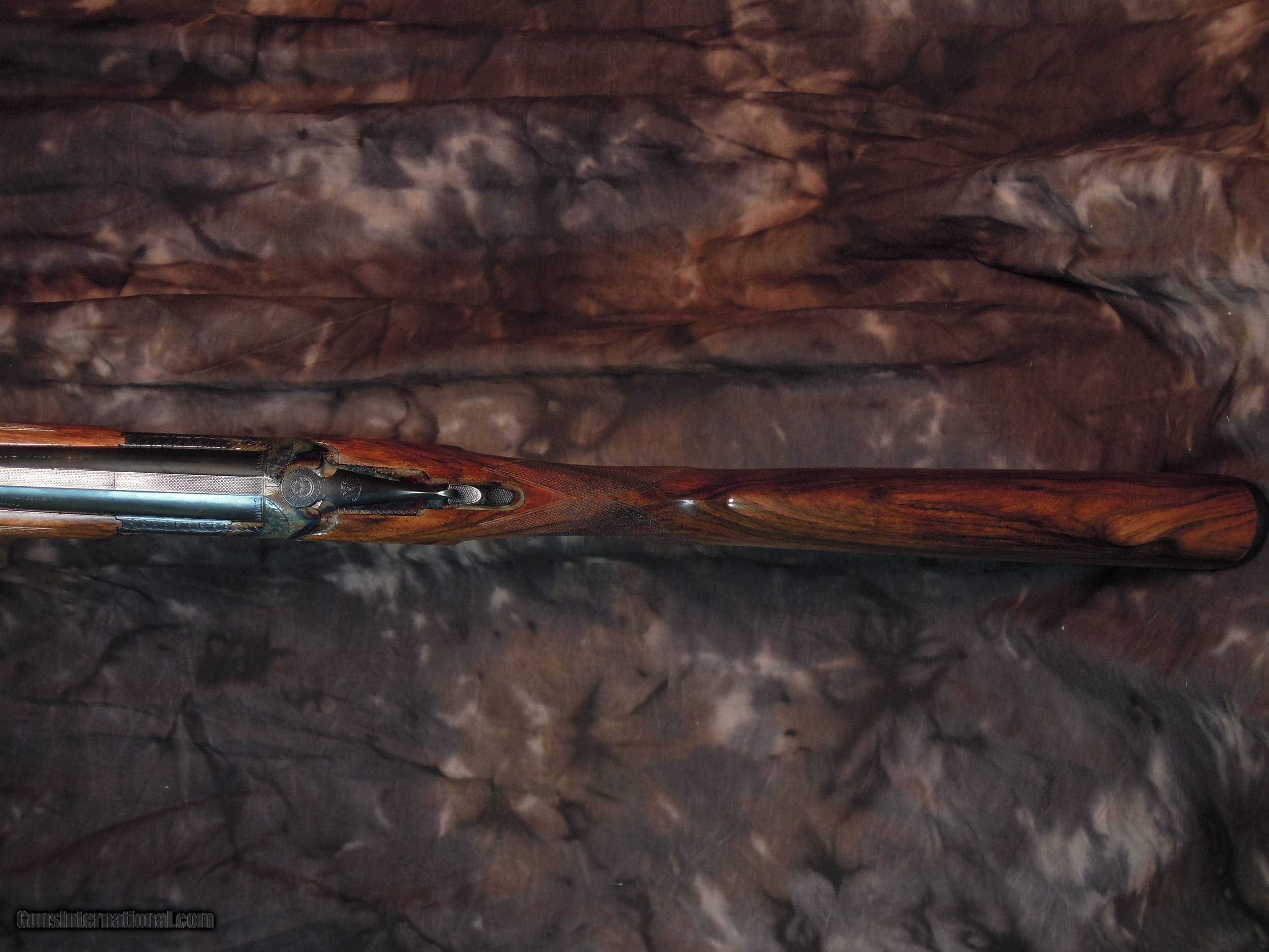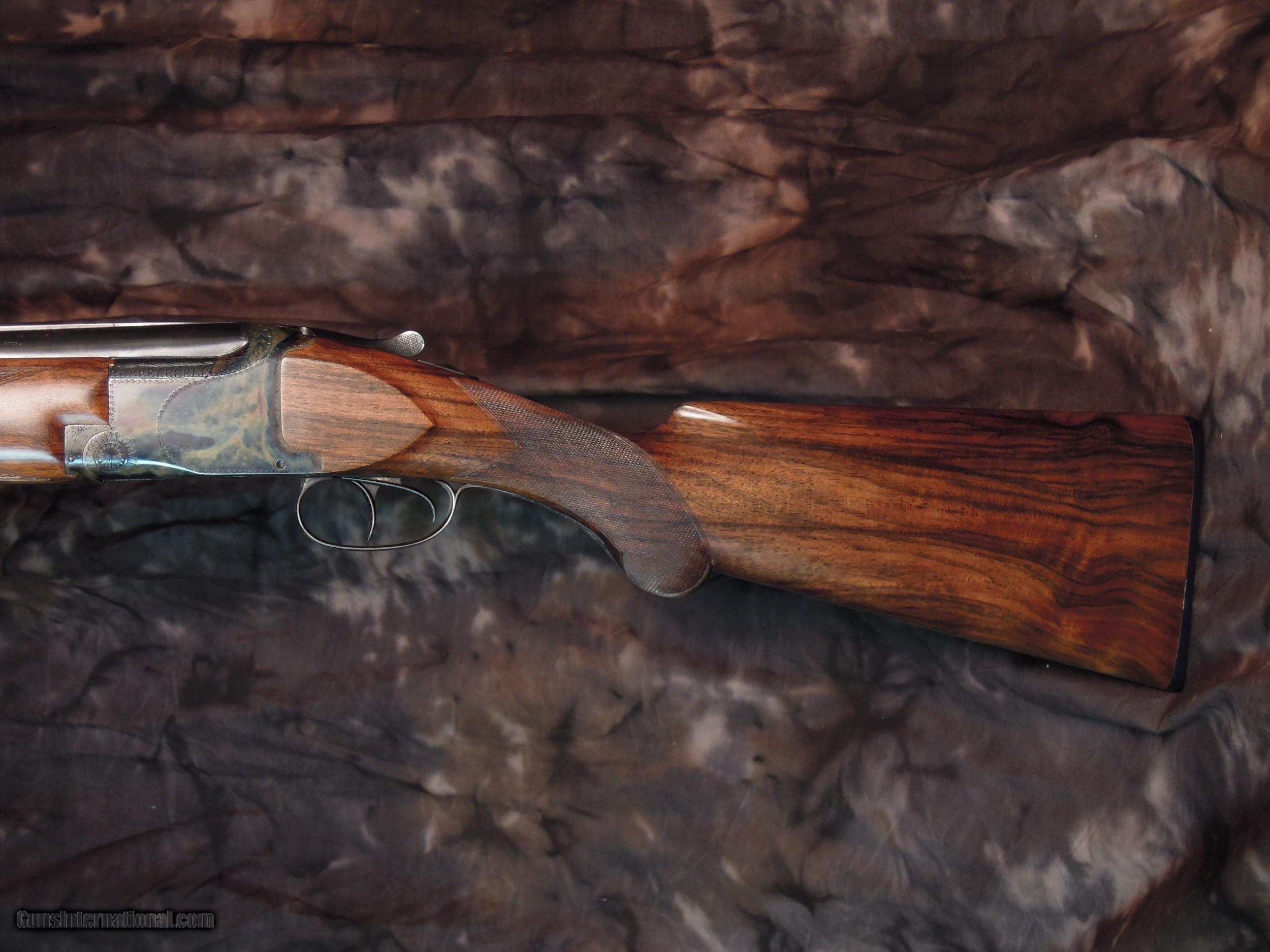 Description: Restored Pre War Browning Superposed with 32 inch barrels and double triggers. Remains in unfired condition. Early and rare 32 inch CONCAVE mat rib, double beads, and double triggers.Bores are bright and shiny with no pitting. There are no choke markings on the barrels,but chokes are IM/Full. Gun is new as restored and restocked. Stock is 1 3/8" x 1/ 3/4" x 15 " to period correct Browning butt plate. St Louis address on left barrel address. Beautiful Superposed. Enjoy the photos and I am happy to answer any questions that you may have. Or if you prefer make inquires though email SOLD |