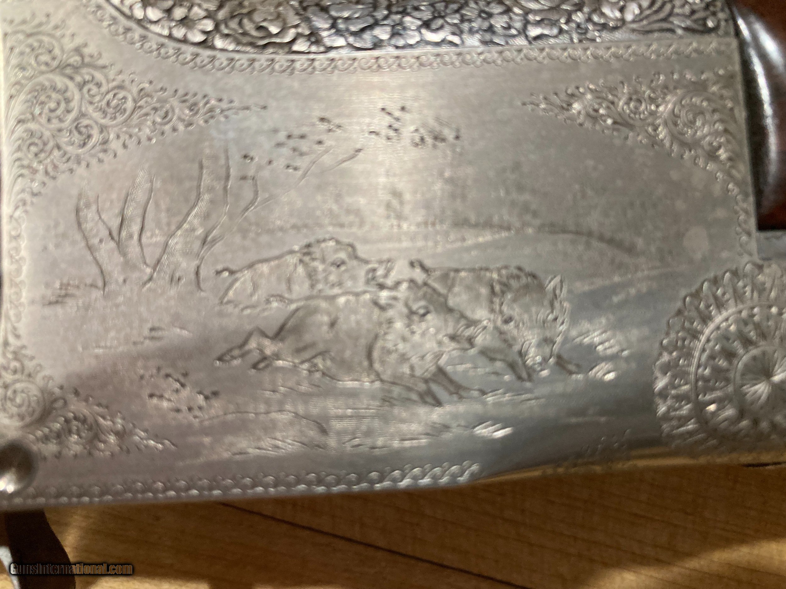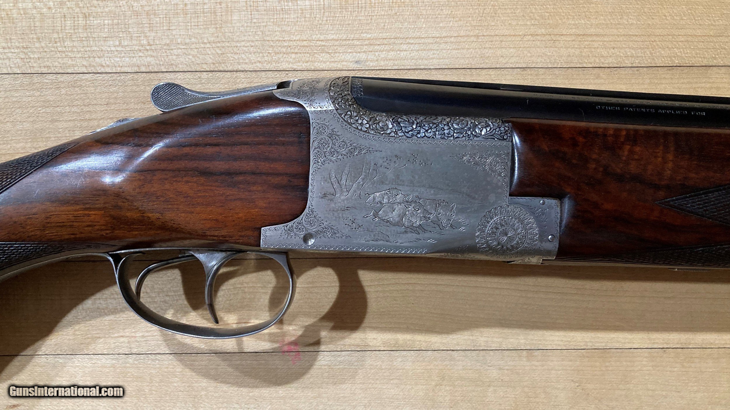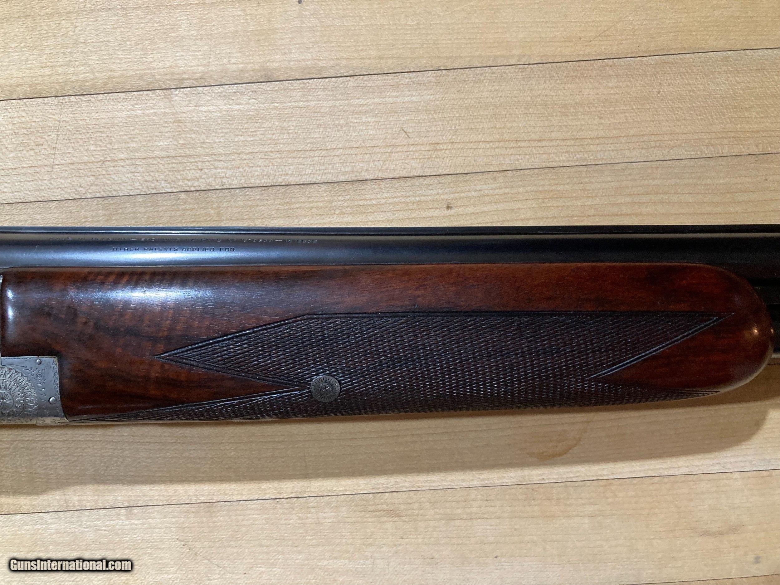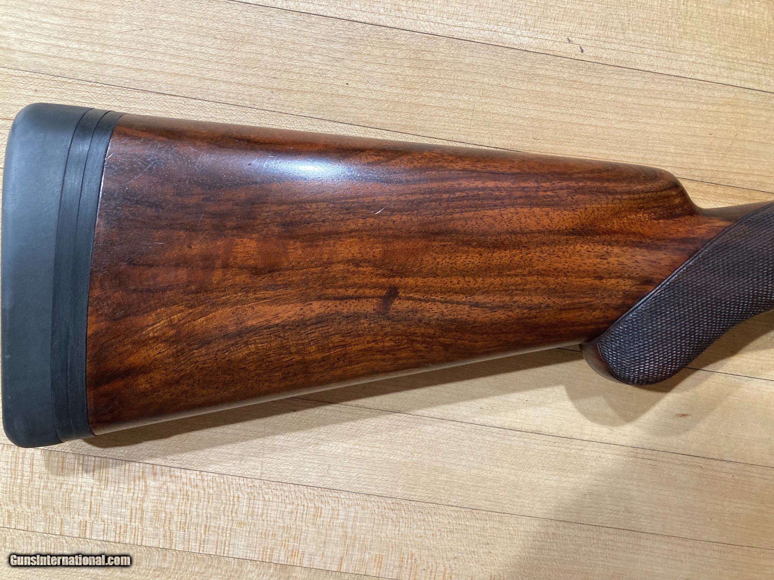 Description: Pre-war Diana grade with "Twin Single Triggers". Round knob, long tand stock with Kick-eez recoil pad. SOLD Manufacturer: Browning Model: Superposed Serial Number: 84xx Barrel Length: 26 Chambers: 2 3/4 Ejectors: Yes Condition: Excellent Metal Condition: Excellent Wood Condition: Very good Bore Condition: Mint Triggers: Twin-Single Stock: European walnut Stock Dimensions: 1 1/2 x 2 1/2 x 14 1/8 Stock Cast: Neutral Butt Pad: Kick-eez Rib: Solid Weight: 6.98 lbs Sights: Mid bead & Bradley bead Manufacture Date: 1935 Chokes: .007 & .009 Engraving: Pre-war Diana pattern Case: No Item Location: NC |