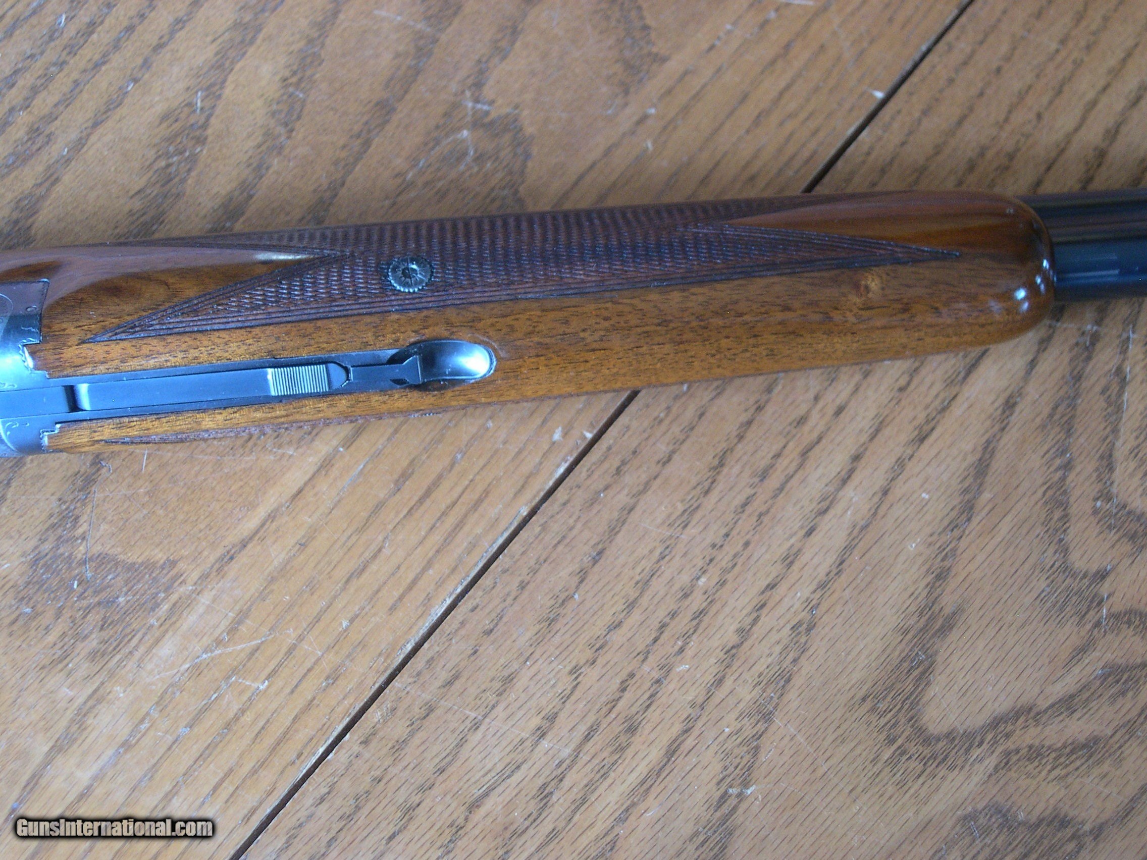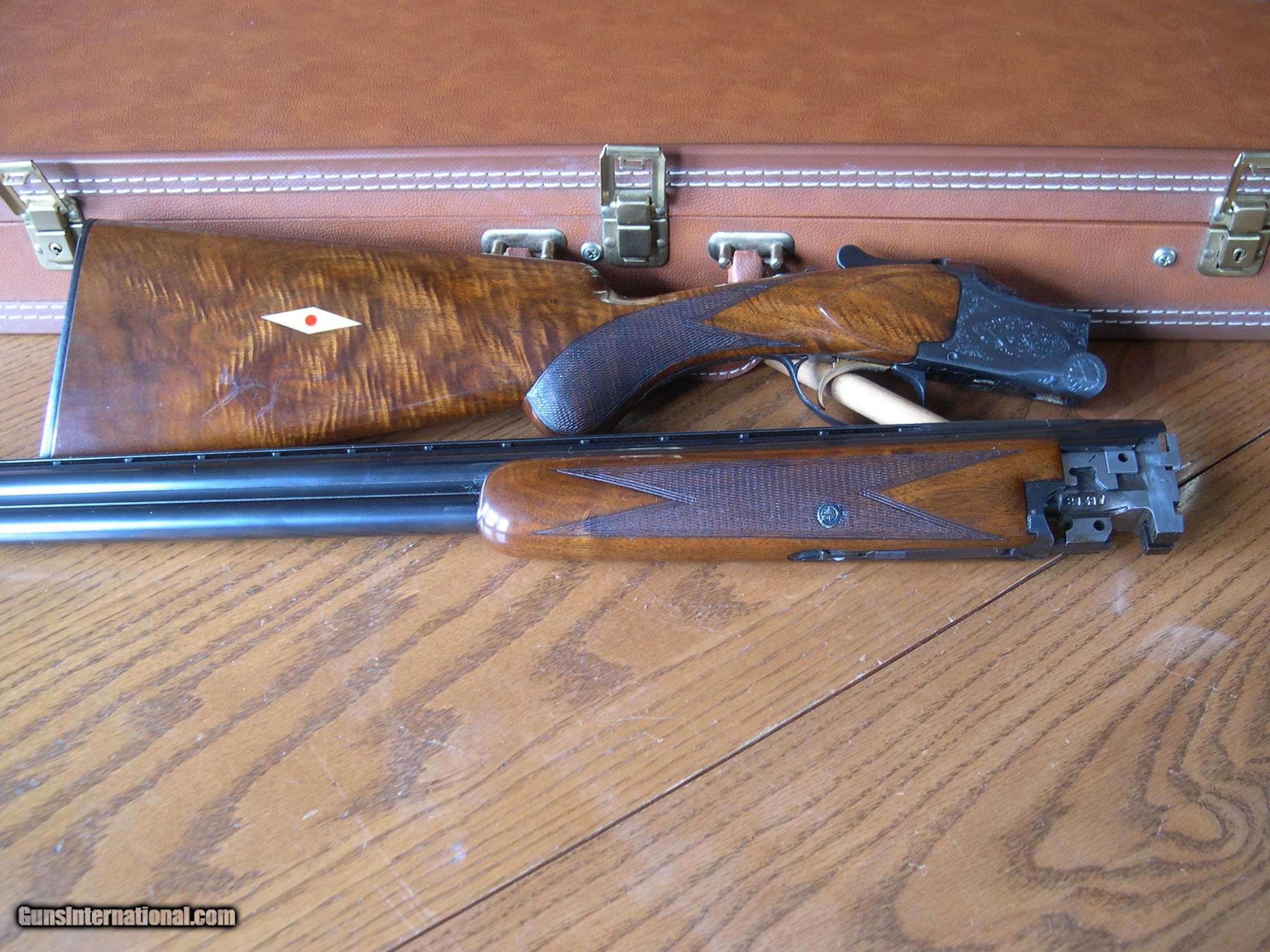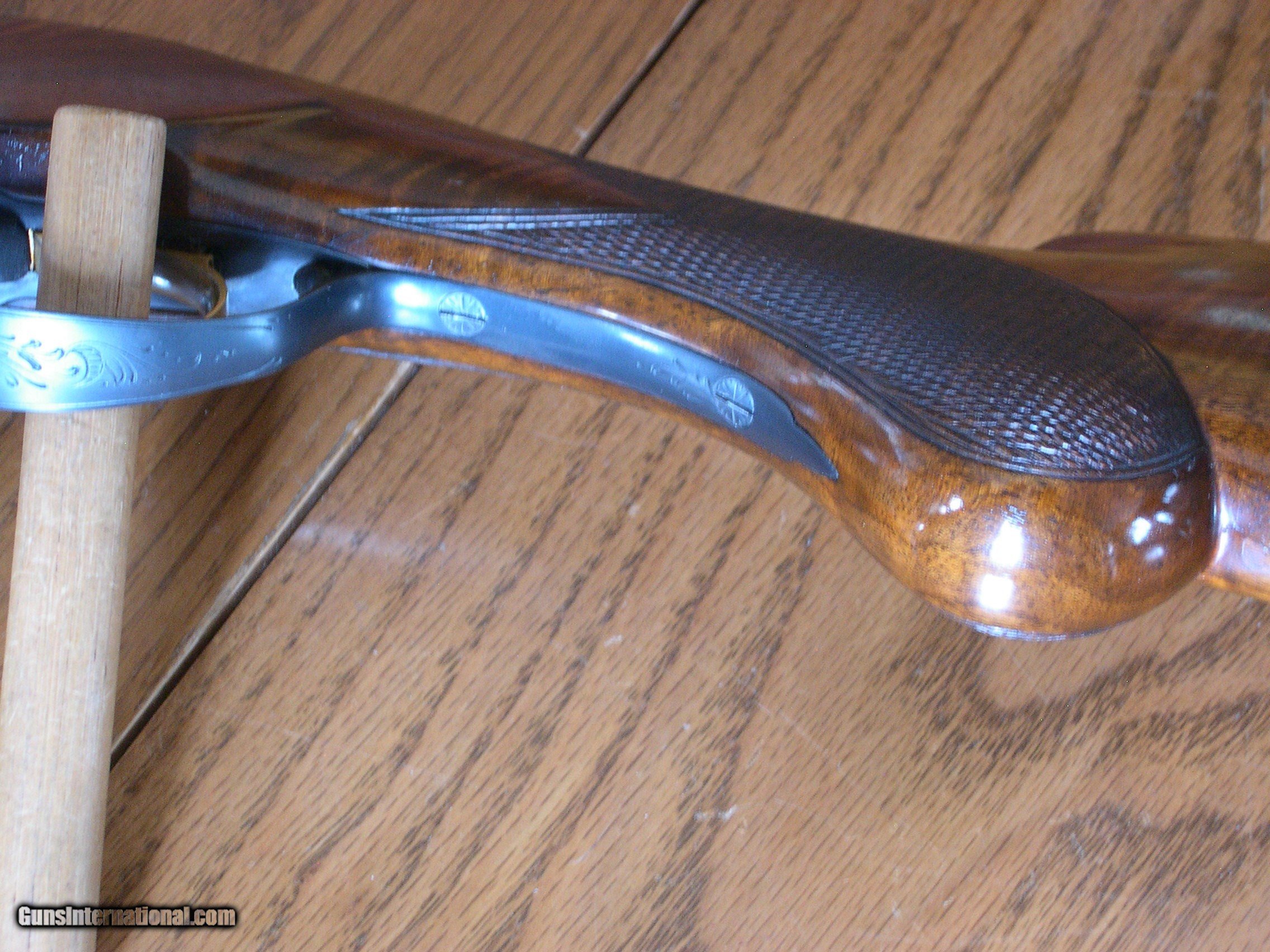 Description: this fine condition 20 ga bird gun is 100% original with the exception of diamond Ivory inlays in stock on both sides, only wear is at balance point, there is some thinning of the blue, Stock is minty and original except for ivory inlays, forend is mint no marks at all, and shows no wear, gun is tight and works perfect, chokes are imp cyl & Mod 26" Bbls, 14 1/8" LOP, Dac 1 3/8" Dah 2 1/4" single trigger and adj Bbl safety, original buttplate, Ejectors, perfect bores showing little use, no idea what the inlays signify, your guess as good as mine, but price would be a lot more w/o them in stock!! Gun comes in mint Browning o/u hartman case! SOLD |