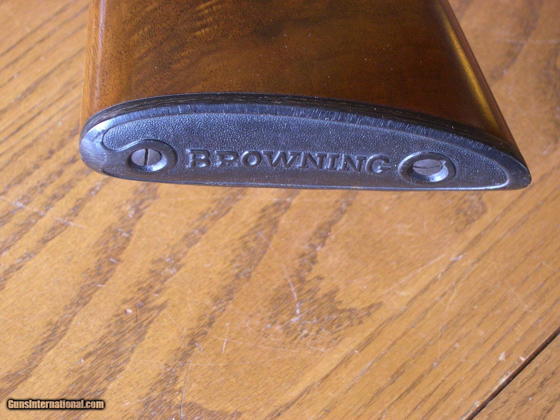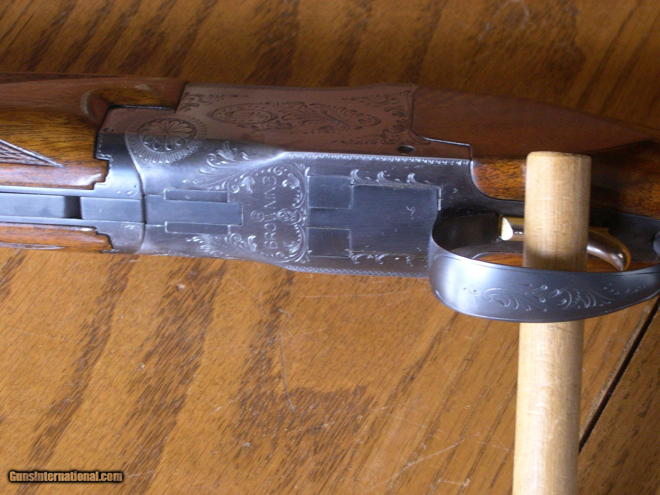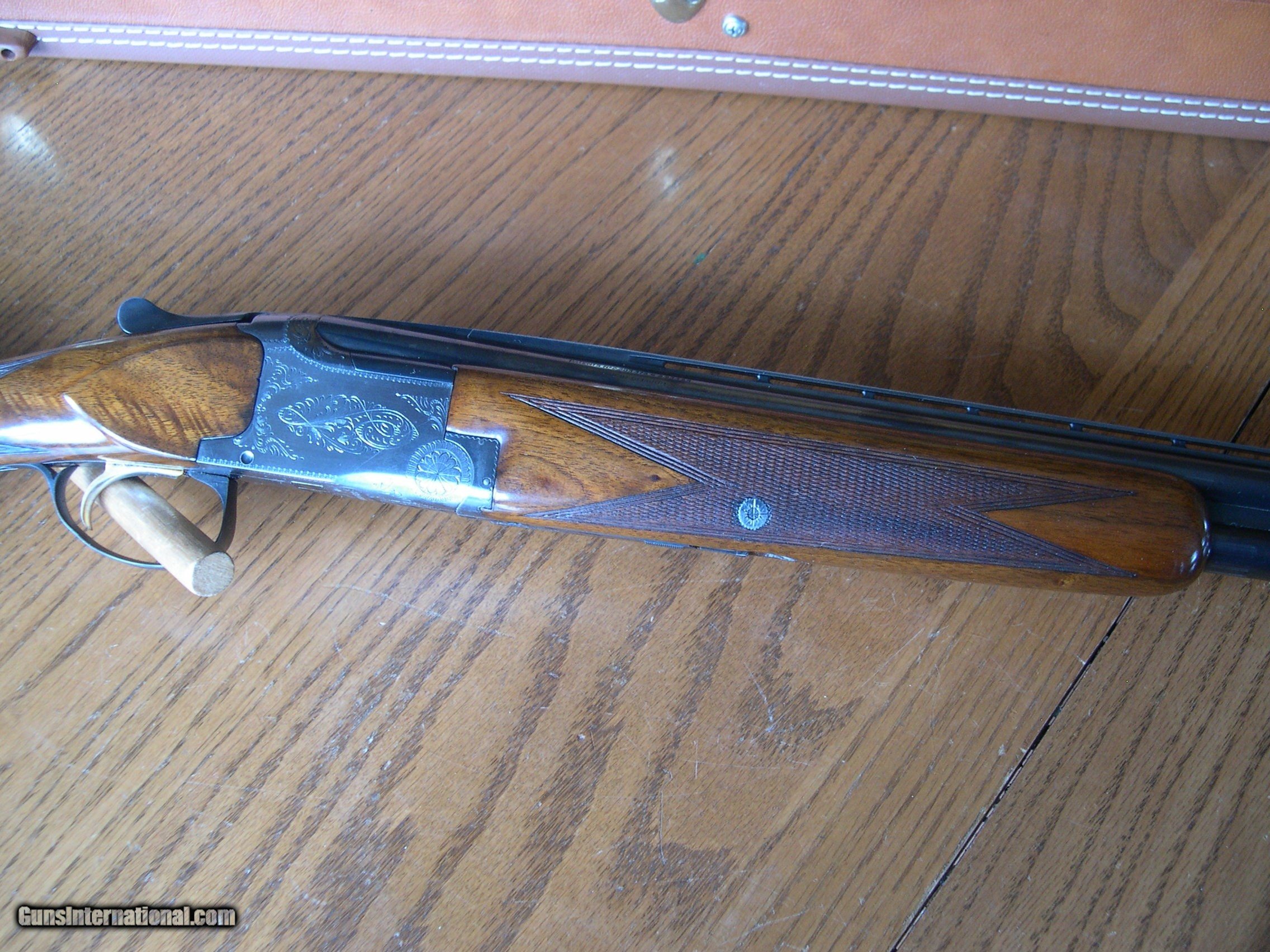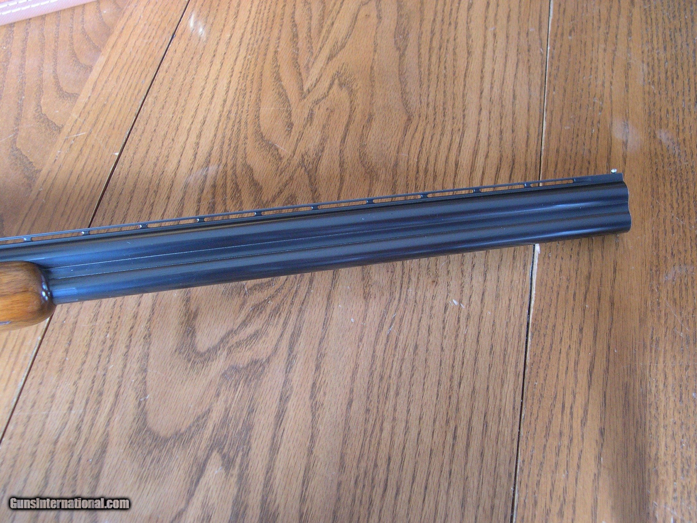 Description: this fine condition 20 ga bird gun is 100% original with the exception of diamond Ivory inlays in stock on both sides, only wear is at balance point, there is some thinning of the blue, Stock is minty and original except for ivory inlays, forend is mint no marks at all, and shows no wear, gun is tight and works perfect, chokes are imp cyl & Mod 26" Bbls, 14 1/8" LOP, Dac 1 3/8" Dah 2 1/4" single trigger and adj Bbl safety, original buttplate, Ejectors, perfect bores showing little use, no idea what the inlays signify, your guess as good as mine, but price would be a lot more w/o them in stock!! Gun comes in mint Browning o/u hartman case! SOLD |