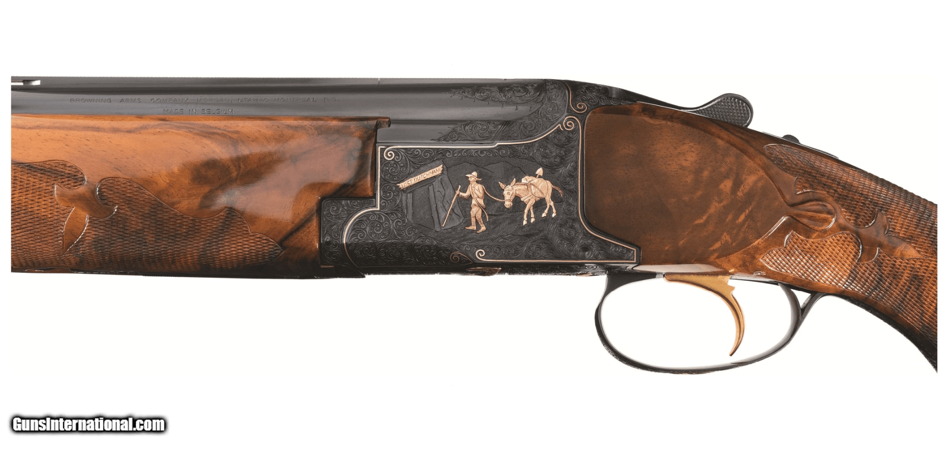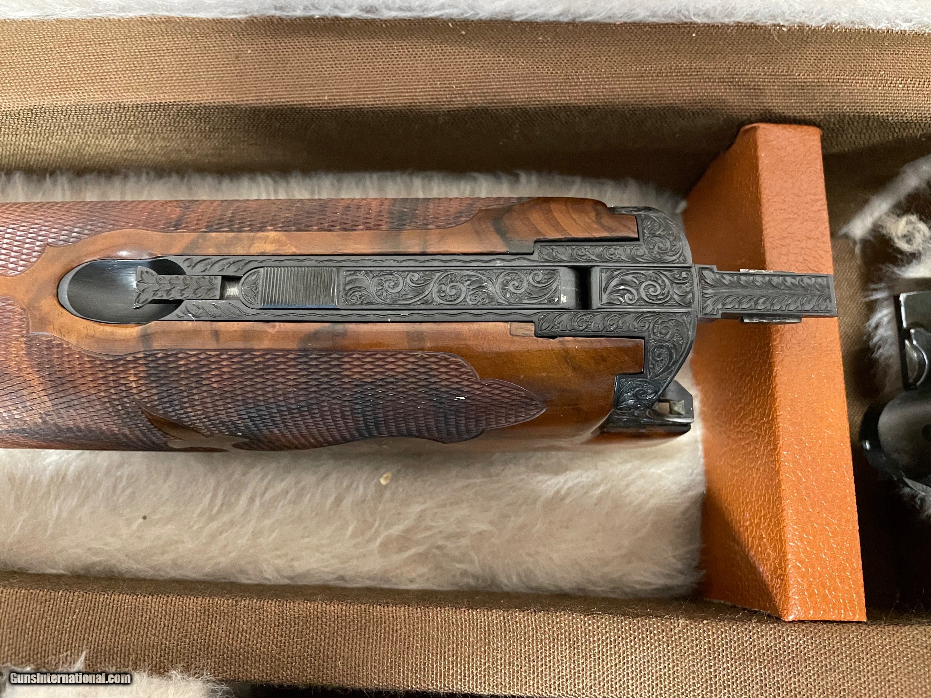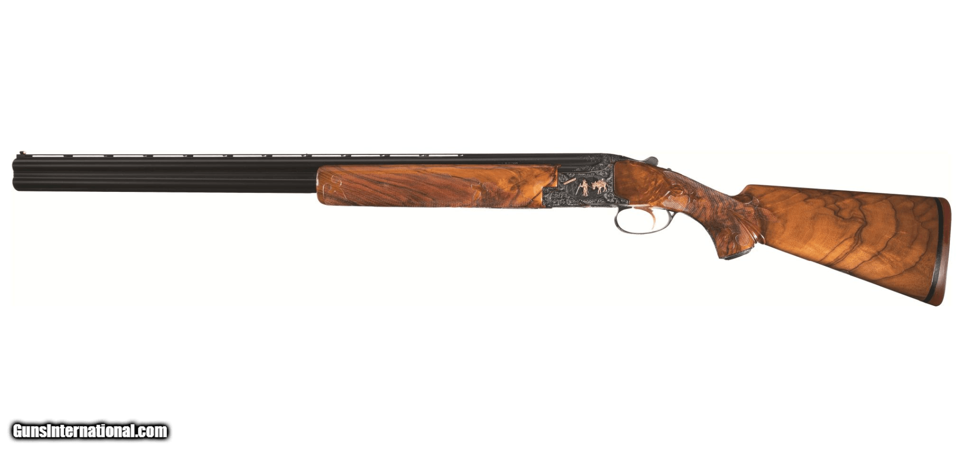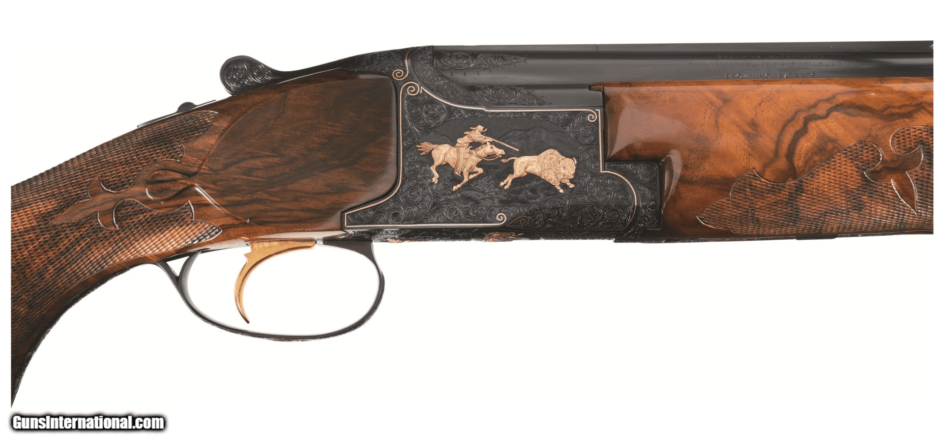 Description: Manufactured in 1974 and subsequently masterfully embellished by Walter Kolouch. Blued steel, vent rib barrels with dual white bead sights, 2 3/4 inch chambers with ejectors, and skeet/skeet chokes. The blued receiver is engraved with scrollwork and scenes from the American West, all rendered in and bordered in gold. The right side of the receiver shows a cowboy hunting a buffalo on horseback, the underside shows an American Indian in a canoe with bear pelts, and the left side features a prospector entering the infamous "Lost Dutchman Mine" believed to be located in Arizona. The scrollwork and gold borders extend to the barrel wedges, tangs, and release lever as well as a gold inlaid "12" on the rear of the barrel rib. The trigger guard shows a golden flower and just ahead of that is a golden fleur-de-lis design. Kolouch marked his work below the release lever "ENG.W.KOLOUCH/McMINNVILLE.ORE." Beautifully figured, fancy walnut forend and pistol grip stock with fluer-de-lis checkering, engraved grip cap, inscription oval marked "RD", and Pachmayr rubber buttpad. Includes three matching extra barrels, one in 20 gauge, 28 gauge, and .410 bore and a factory case that houses the set. Stock measurements: 1 1/2 inch drop at comb; 2 1/4 inch drop at heel; 14 1/16 inch length of pull. Weight: 8lbs 2 oz. SOLD Shotgun Gauge: 12 Gauge, 20 Gauge, 28 Gauge, .410 Gauge Manufacturer: BROWNING Model: SUPERPOSED Serial Number: 32694S74 |