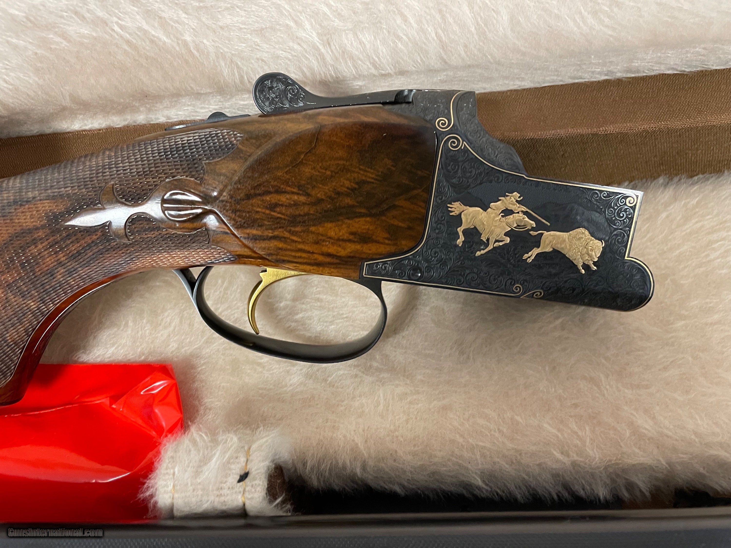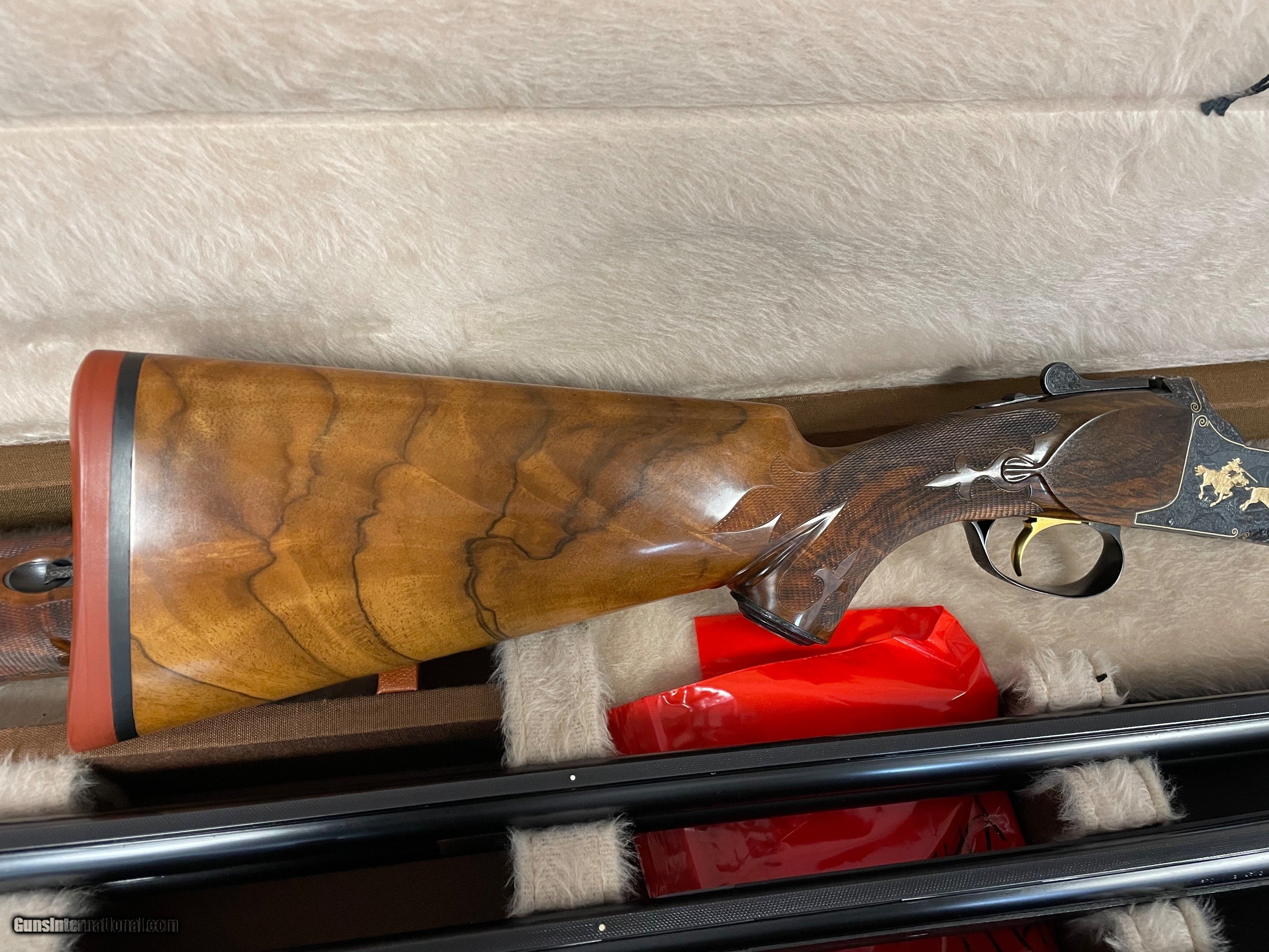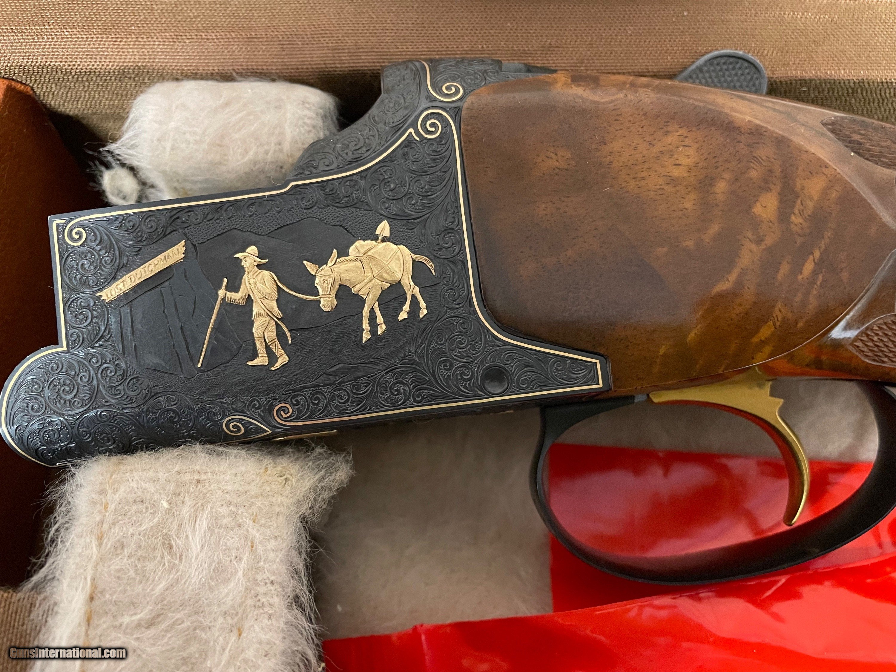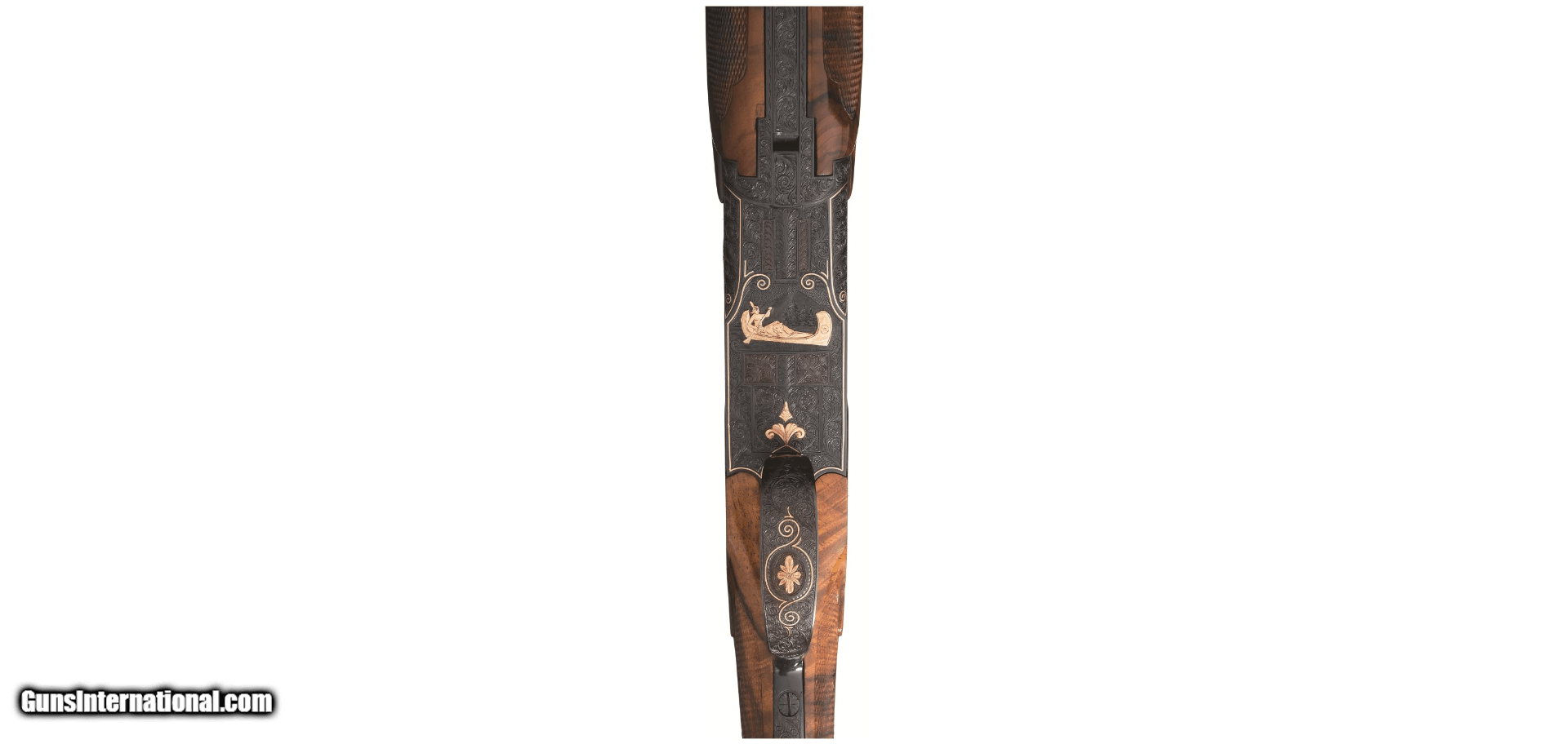 Description: Manufactured in 1974 and subsequently masterfully embellished by Walter Kolouch. Blued steel, vent rib barrels with dual white bead sights, 2 3/4 inch chambers with ejectors, and skeet/skeet chokes. The blued receiver is engraved with scrollwork and scenes from the American West, all rendered in and bordered in gold. The right side of the receiver shows a cowboy hunting a buffalo on horseback, the underside shows an American Indian in a canoe with bear pelts, and the left side features a prospector entering the infamous "Lost Dutchman Mine" believed to be located in Arizona. The scrollwork and gold borders extend to the barrel wedges, tangs, and release lever as well as a gold inlaid "12" on the rear of the barrel rib. The trigger guard shows a golden flower and just ahead of that is a golden fleur-de-lis design. Kolouch marked his work below the release lever "ENG.W.KOLOUCH/McMINNVILLE.ORE." Beautifully figured, fancy walnut forend and pistol grip stock with fluer-de-lis checkering, engraved grip cap, inscription oval marked "RD", and Pachmayr rubber buttpad. Includes three matching extra barrels, one in 20 gauge, 28 gauge, and .410 bore and a factory case that houses the set. Stock measurements: 1 1/2 inch drop at comb; 2 1/4 inch drop at heel; 14 1/16 inch length of pull. Weight: 8lbs 2 oz. SOLD Shotgun Gauge: 12 Gauge, 20 Gauge, 28 Gauge, .410 Gauge Manufacturer: BROWNING Model: SUPERPOSED Serial Number: 32694S74 |