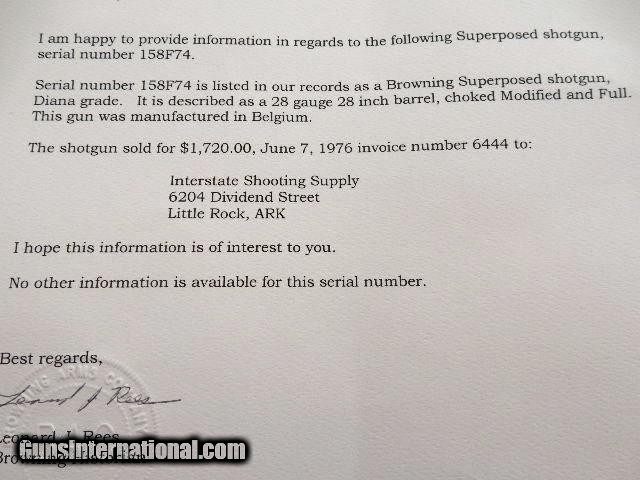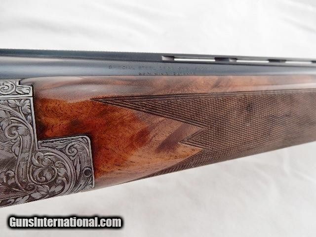 Description: This is a Browning superposed 28 gauge with 28 inch modified and full choke barrels. This gun is only 1 of 3 made that year. Less than 30 total made in this configuration. This gun is 99%+ metal and 98% wood. Few light finish marks on stock. Signed by F. Marchal. Serial # is 15xF74. DAC 1 3/8 DAH 2 1/4 LOP 14 1/4 Wt 6lb 13oz. Buyer pays 140.00 shipping with insurance. Thank you. 44-4-4 SOLD |