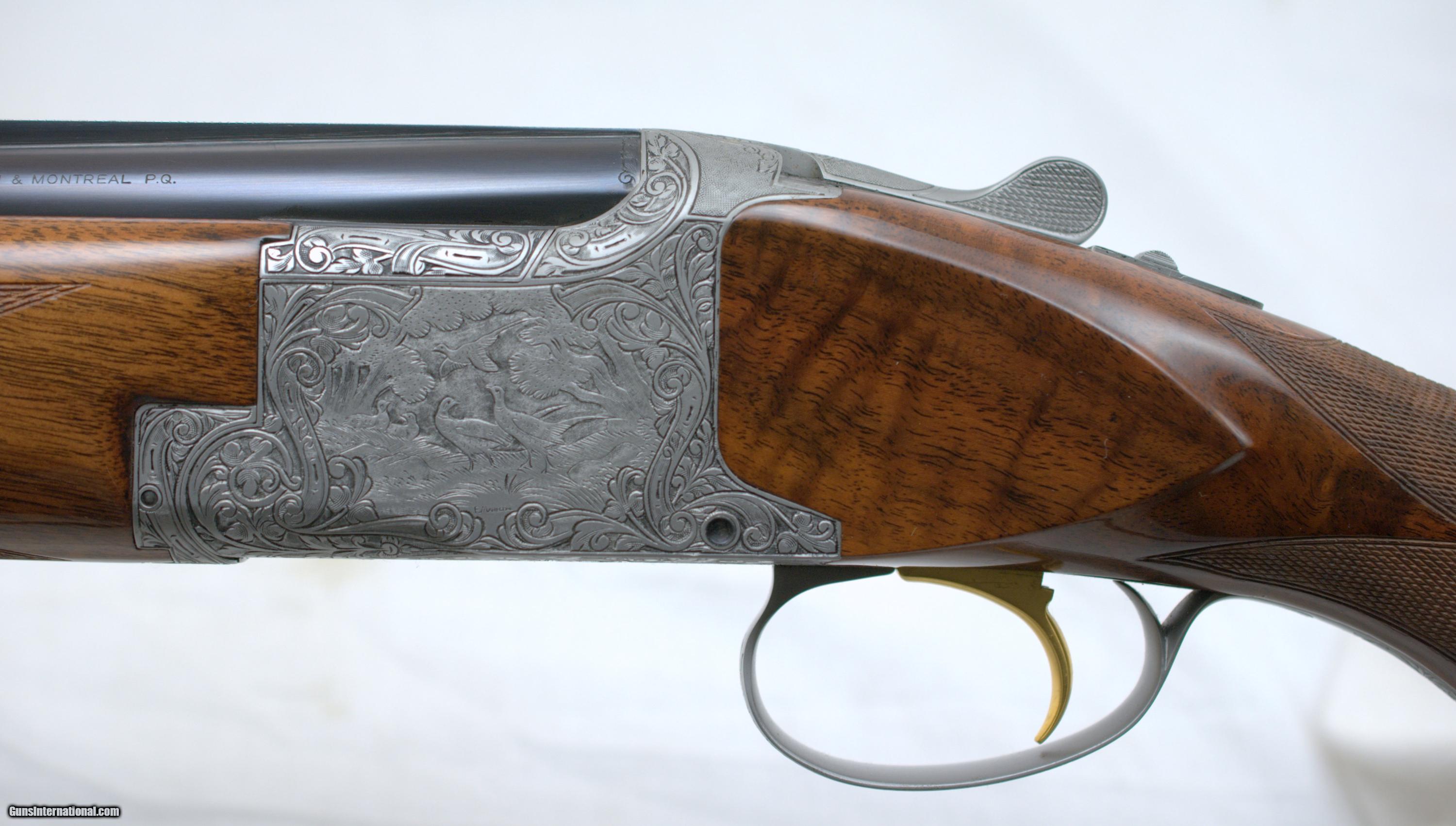 Description: BROWNING SUPERPOSED DIANA GRADE 12GA ENGRAVED BY F. MARECHAL 26-3/8″ Barrels ... 2-3/4″ Chambers ... Marked IC and mod ... LOP 14 3/8 ... DAH 2 1/2 ... DAC 1 1/2 ... Weight: 7 lbs. 3 oz ... Year Manufactured 1971...Ventilated rib ... Steel bead ... single selective trigger ... auto ejectors ... non auto safety ... hand engraved ... signed by Marechal PROVENANCE: Rod Fuller Estate Collection. CONDITION: Excellent, essentially as new Coin finished action is engraved in usual “Diana” fashion, with five pheasants in woodland background on left; quattro of ducks at pond on right; indeterminate gallinaceous fowl flying across bottom; and a pair of rabbits on trigger guard. Engravers signature, F. Marechal, is on both side scenes. Barrels with matted, ventilated rib have Browning Morgan Utah and Montreal addresses. Bore diameter: top -.727, bottom -.723. Bore restrictions: top -.022 (mod), bottom -.010 (IC). Gold of trigger is excellent. Mechanically crisp. Fine stump figured claro walnut long tang, square knob buttstock measures 14-3/8″ over Browning buttplate, and features standard Diana pattern checkering with curved line borders. Forend matches well but is relatively plain. Drop at heel: 2-1/2″, drop at comb: 1-1/2″. , LOP 14-3/8″. Tan vinyl Browning case is lined in faux fur and contains key. , with only the lightest of handling marks on wood and metal. Case is excellent with a few light scuffs. Interior is lightly soiled. Call with any questions and see our other listings for, "Only the best!" Buyer pays all shipping cost. SOLD |