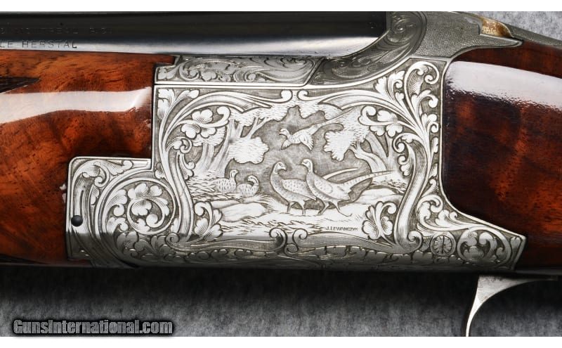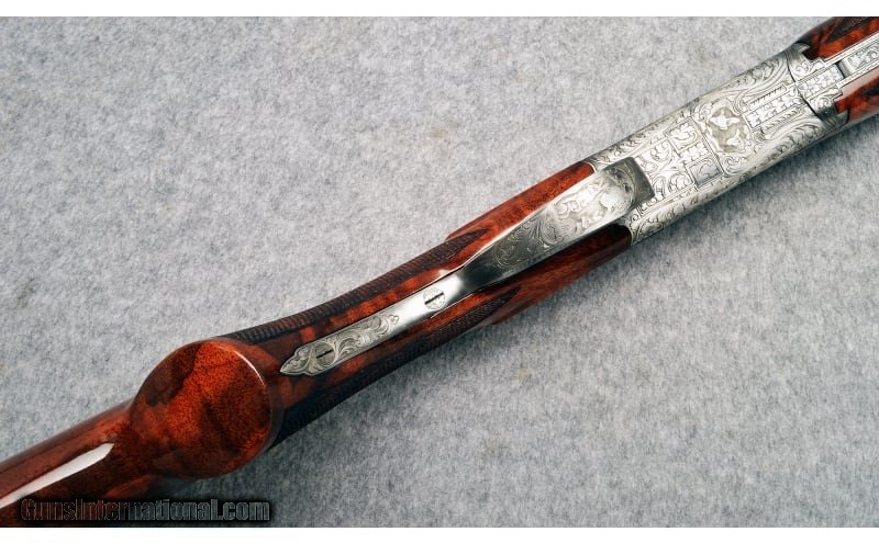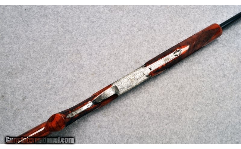 Description: Browning B25 DIANA 20 Gauge O/U 26.5" shotgun with matted-vented rib barrels choked improved cylinder (lower barrel) & modified (Top barrel) with single steel bead sight. Finely engraved on french-gray receiver with covey of pheasants on left, four mallards on right, two grouse on underside and two hares on trigger guard. The receiver is signed by master engraver J. Lewanczvk on the left side beneath the game scene. Beautifully multipoint checkered forearm and pistol grip stock with engraved fittings and Browning Buttplate. Firearm is used and shows minor discoloration on barrel with light Handling marks and nicks on stock. Includes factory box. Manufacture Date 1989. 20 Gauge SOLD Barrels: 26.5 Weight: 6 lb. Item Location: League City, TX |