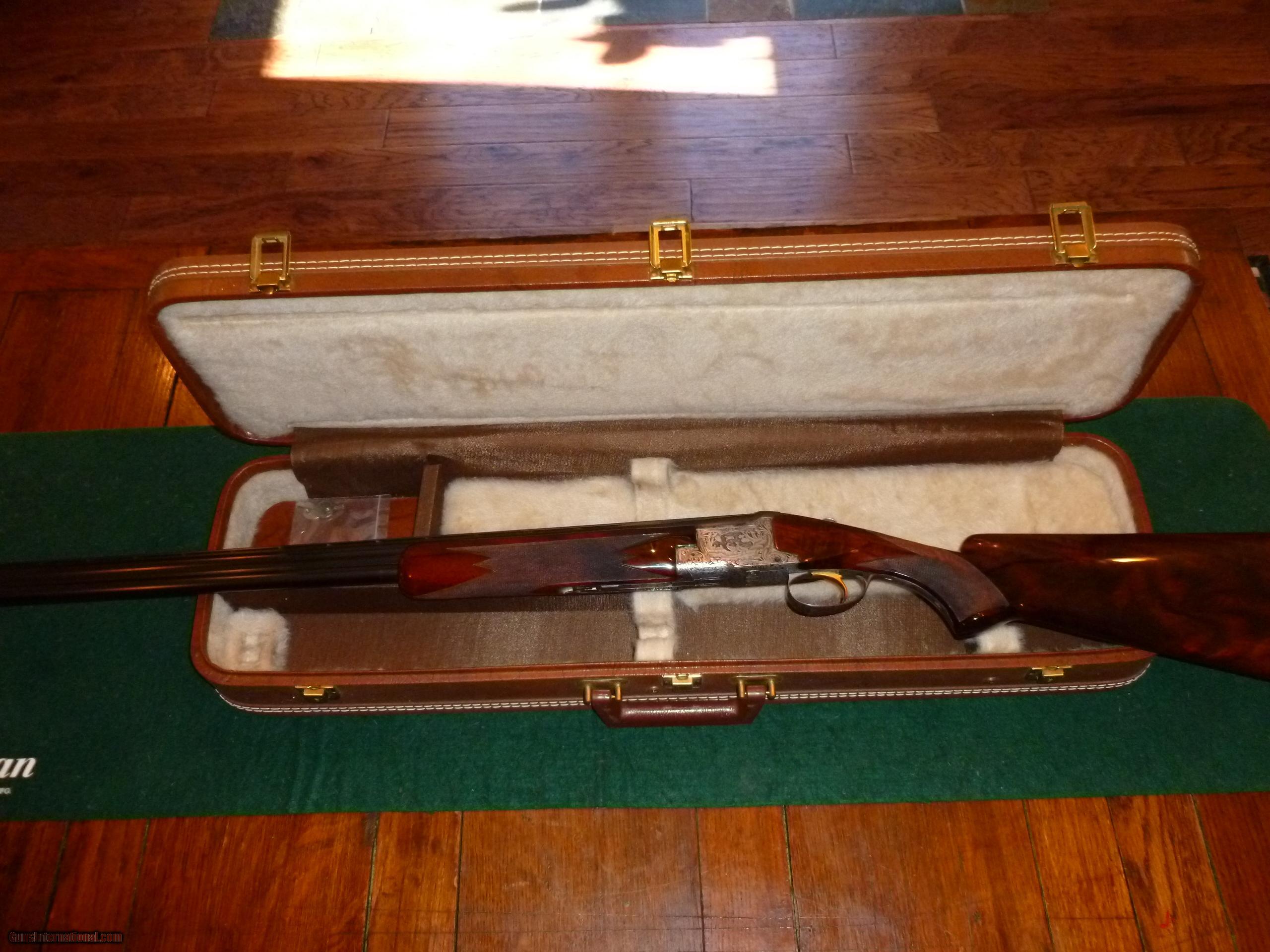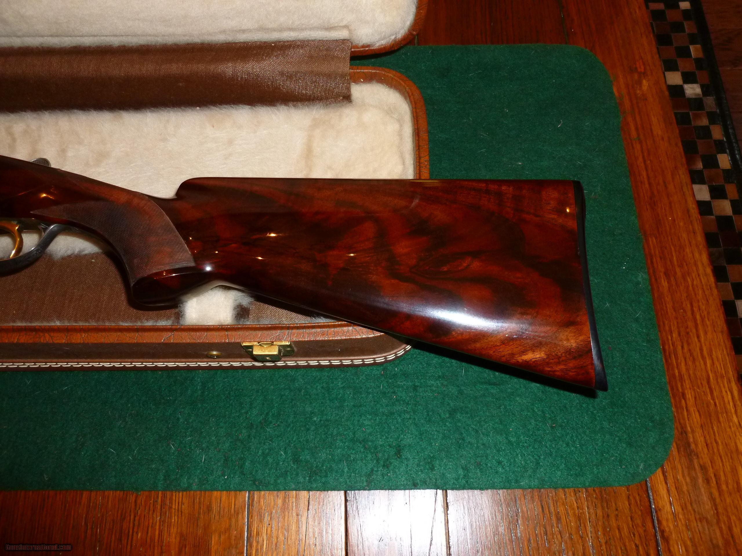 Description: Factory 1977 Angelo Bee engraved and signed (see pic 2) Diana Grade with perfect beautiful wood and 99% metal. One of 8 Diana 28 ga. 1977 guns in 26 1/2" barrels. The lever is far right and locks up as tight as new. I'm sure the gun has been shot but doesn't show much use. I have the Browning letter from Leonard Rees, Historian. The letter states the chokes as Mod and Full. The stamps on the gun are IC and Mod so a previous owner may have adjusted the chokes. The LOP is 14 1/2". Shipped to your FFL for $40. SOLD |