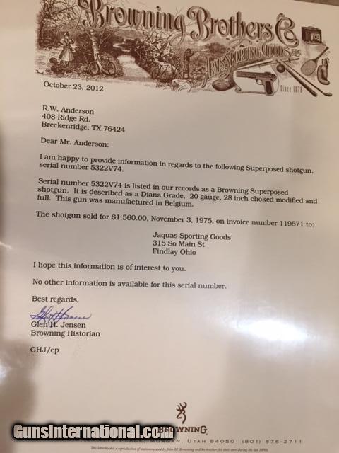 Description: This Browning Diana grade 20 gauge sold for $1560.00 new. 99 percent on gun and is a hard to find 28".The Barrels are mod/full chokes.The Lop is 14 1/4. AS IS.The buyer can rate the gun as he or she sees it. The case is included with gun.The gun will be mailed to FFL gun dealer. SOLD |