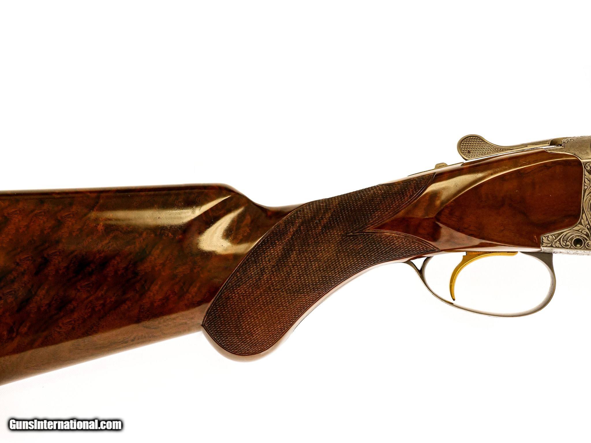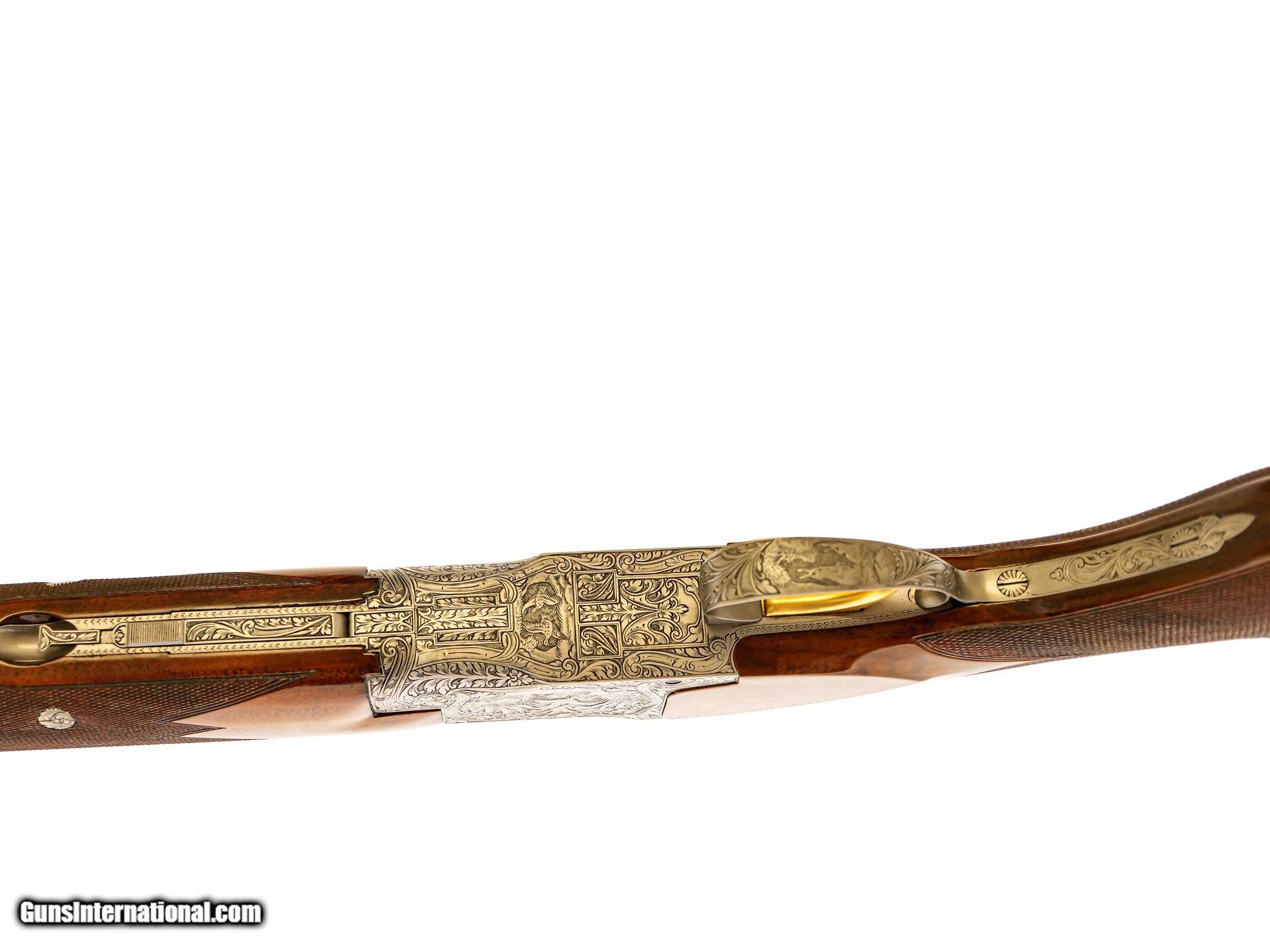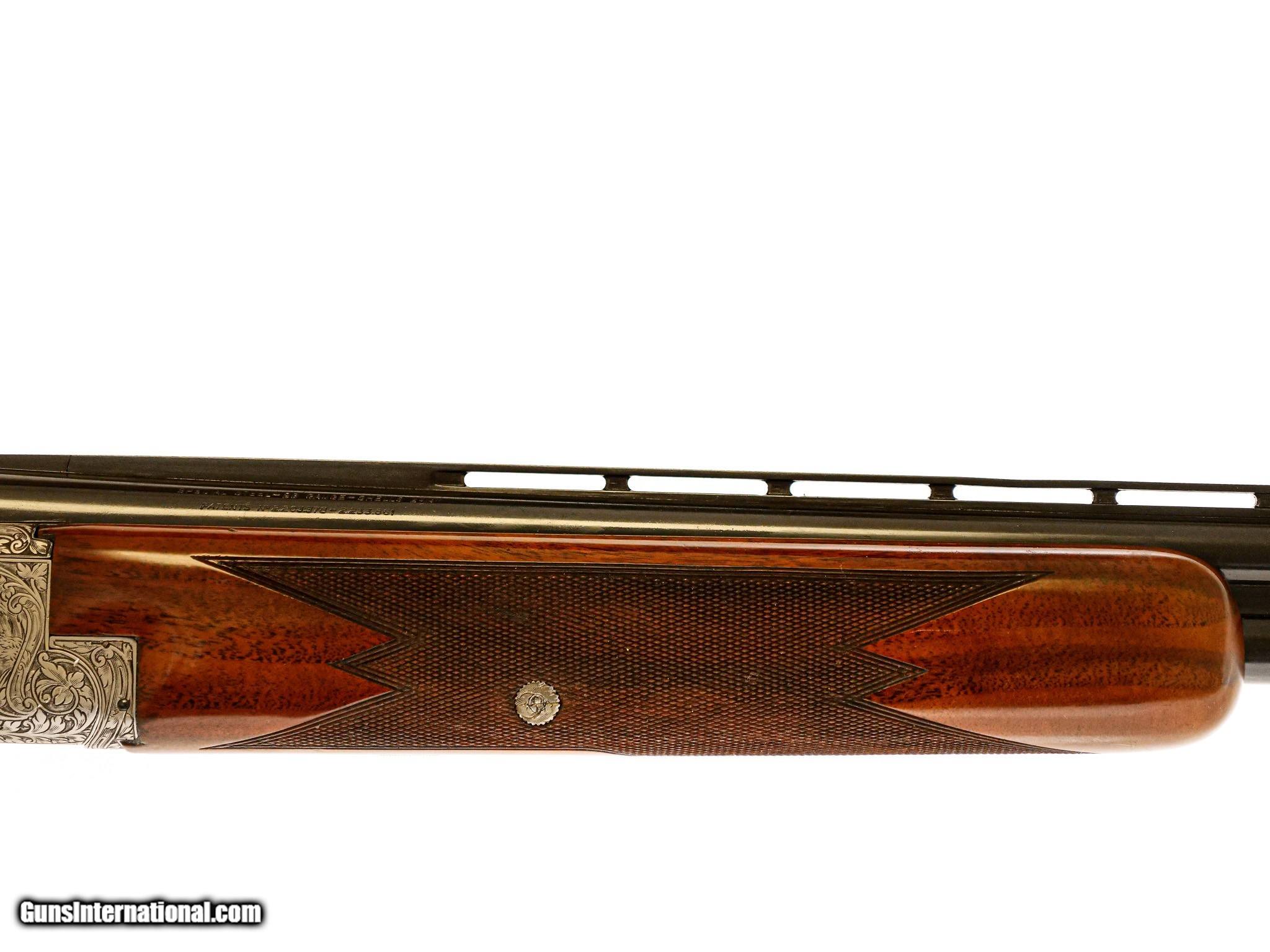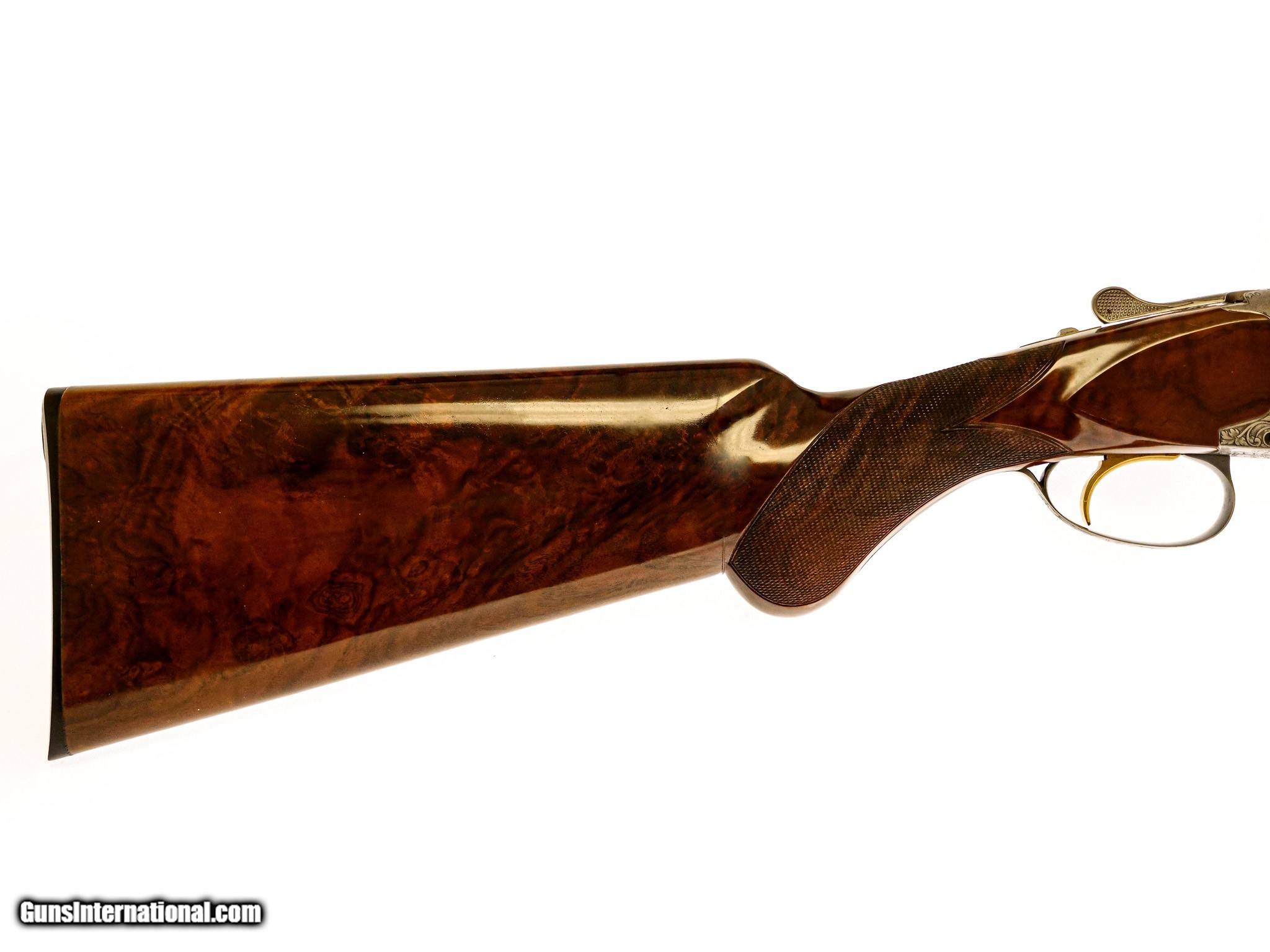 Description: Browning - Diana Grade, 28ga. 28" Barrels Choked SK/SK. Stunningly figured round knob long tang stock, factory Browning butt plate, gold single selective trigger, field forend, automatic ejectors, ventilated rib, stunning Diana engraving pattern signed by factory Master Engraver Lambert, perfect 100% everything, highest quality 1969 Belgian workmanship, extremely rare and desirable gun which would compliment any collection, available for immediate delivery. Inv: 52217 6 lbs. 12 oz. 14 ¼” x 1 ½” x 2 ¼” $27,000.00 OR MAKE OFFER SOLD |