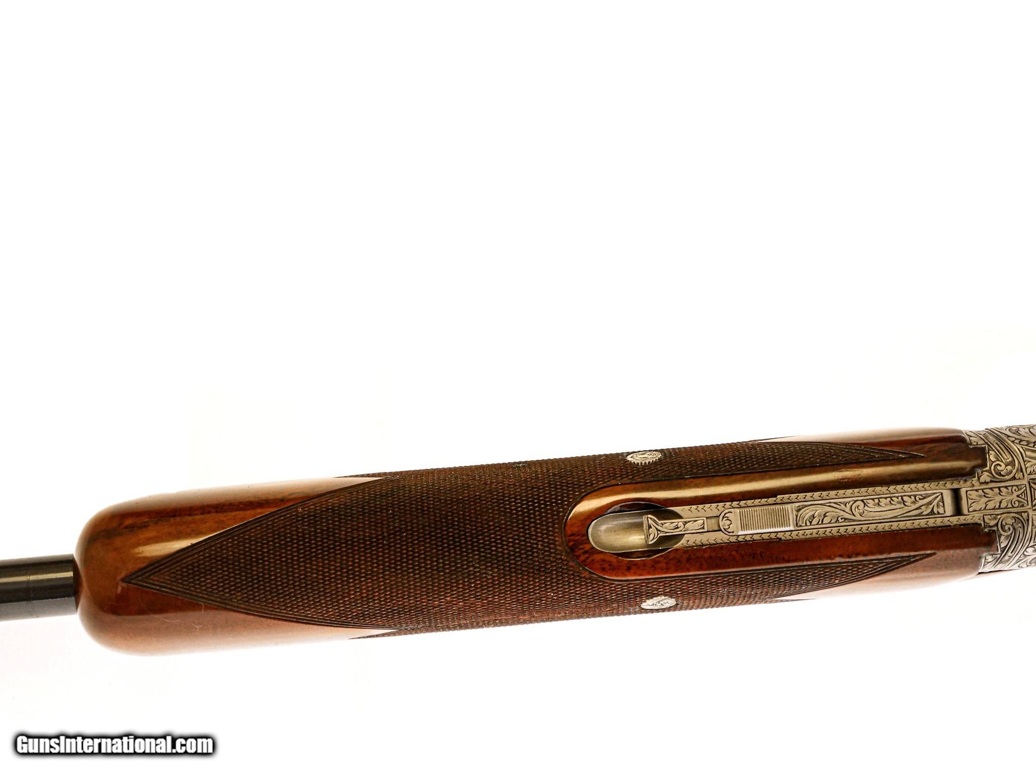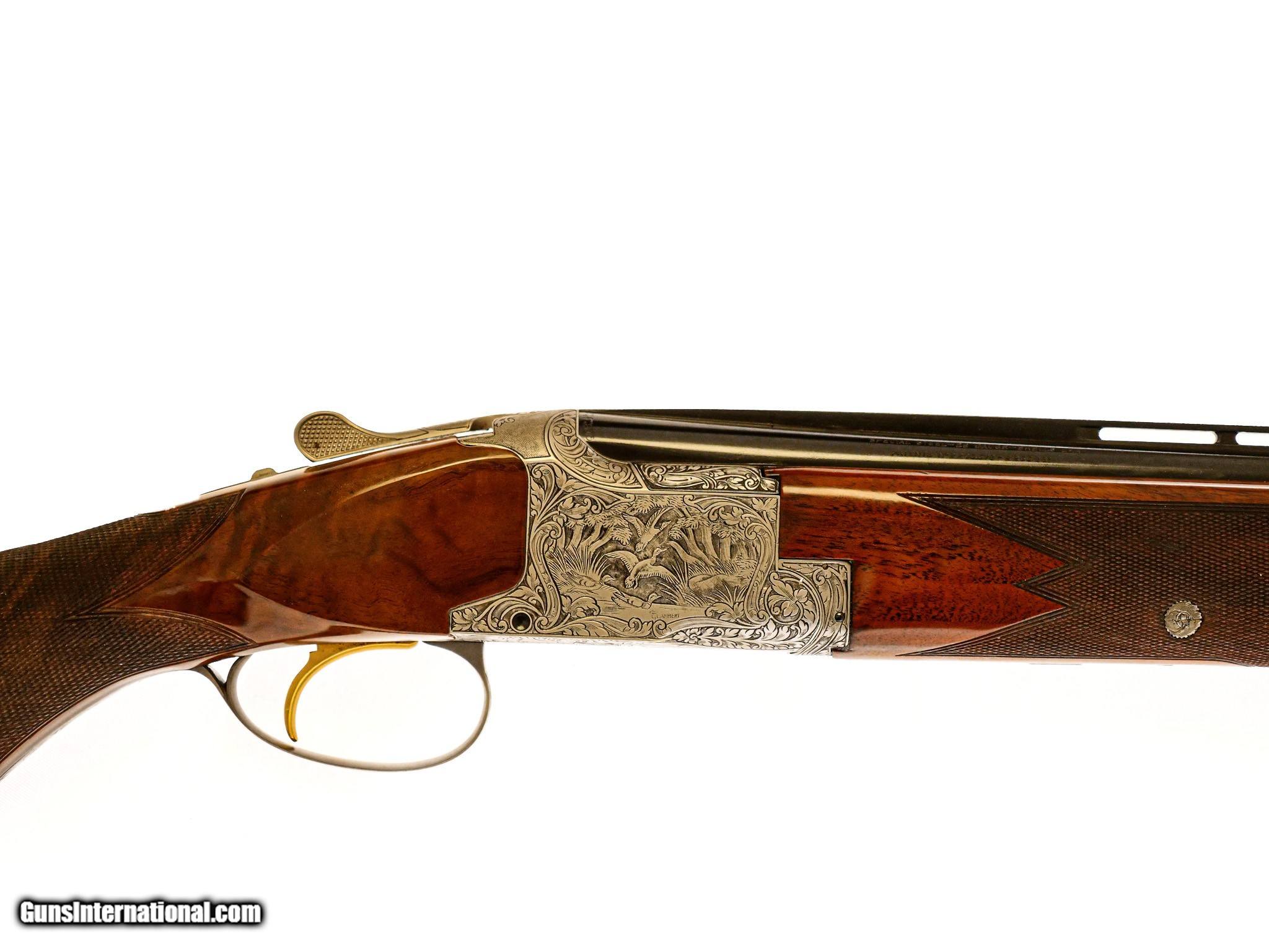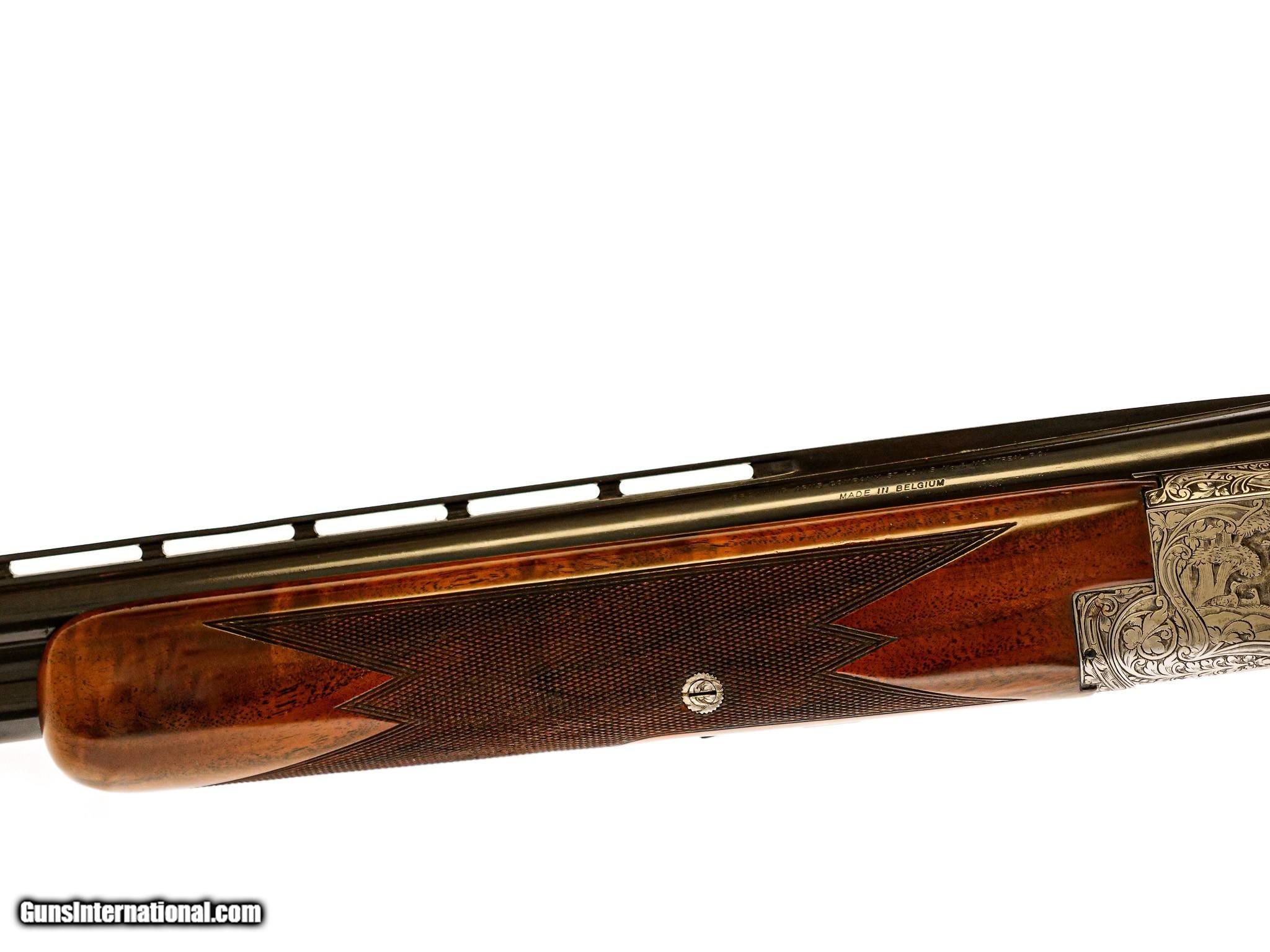 Description: Browning - Diana Grade, 28ga. 28" Barrels Choked SK/SK. Stunningly figured round knob long tang stock, factory Browning butt plate, gold single selective trigger, field forend, automatic ejectors, ventilated rib, stunning Diana engraving pattern signed by factory Master Engraver Lambert, perfect 100% everything, highest quality 1969 Belgian workmanship, extremely rare and desirable gun which would compliment any collection, available for immediate delivery. Inv: 52217 6 lbs. 12 oz. 14 ¼” x 1 ½” x 2 ¼” $27,000.00 OR MAKE OFFER SOLD |