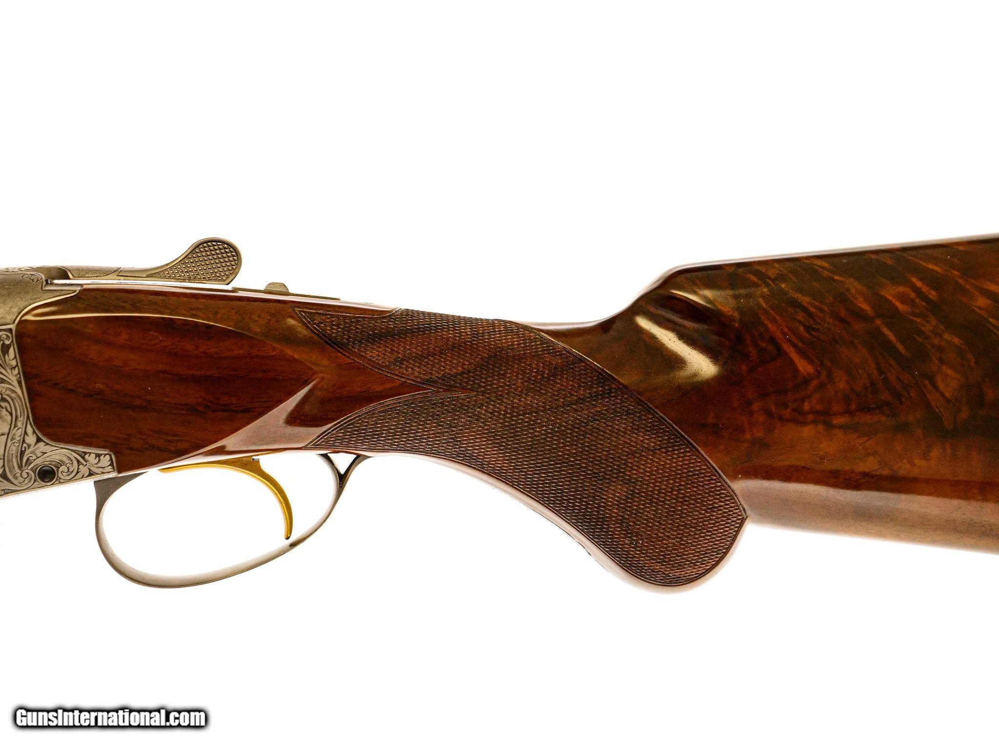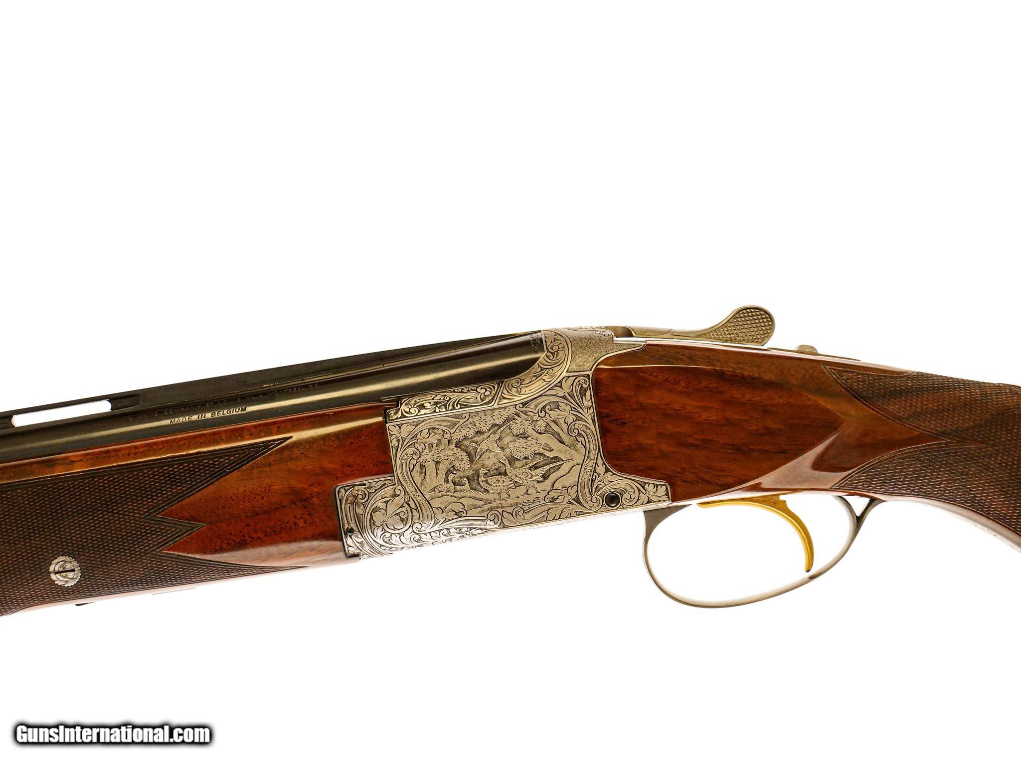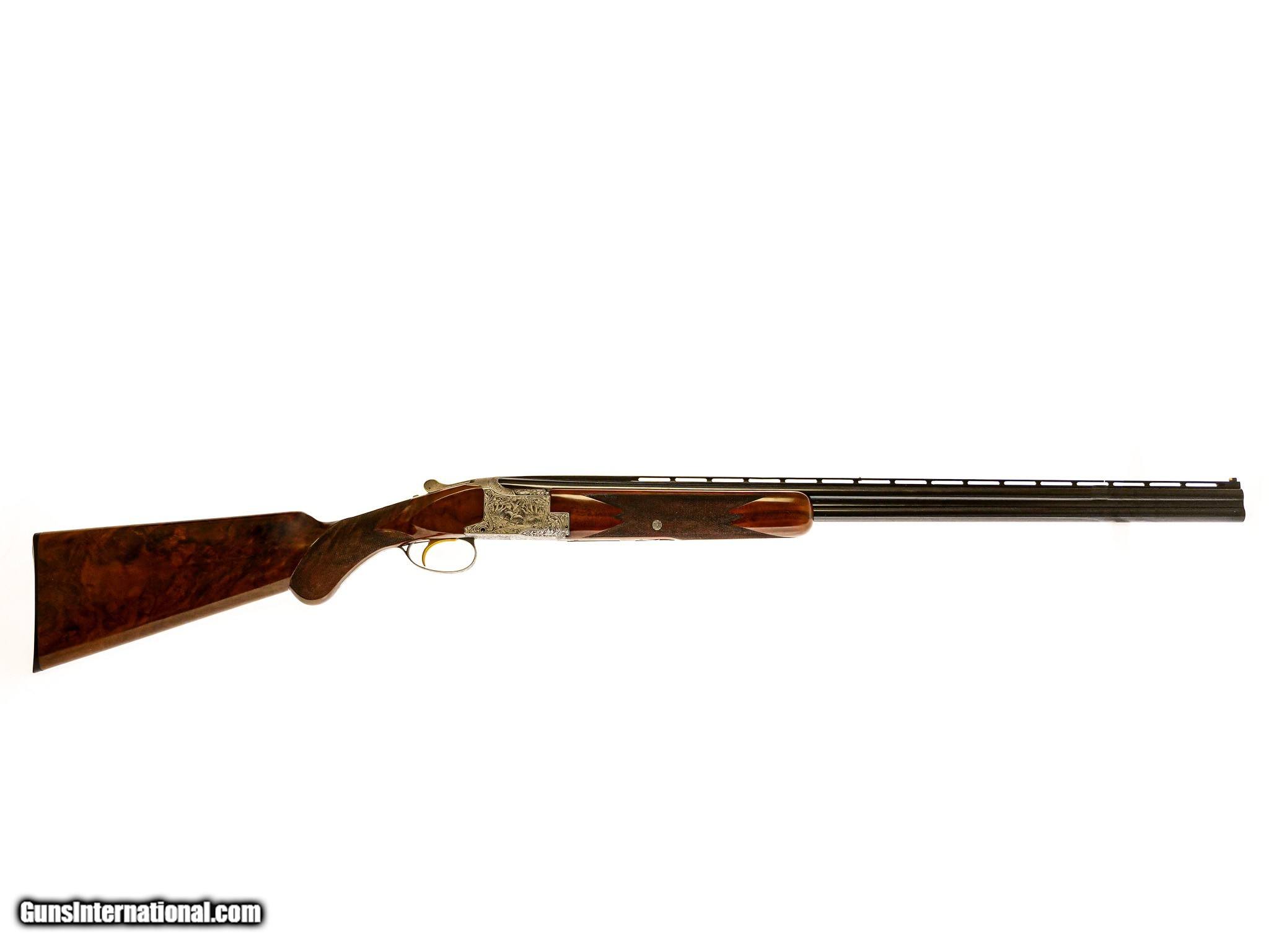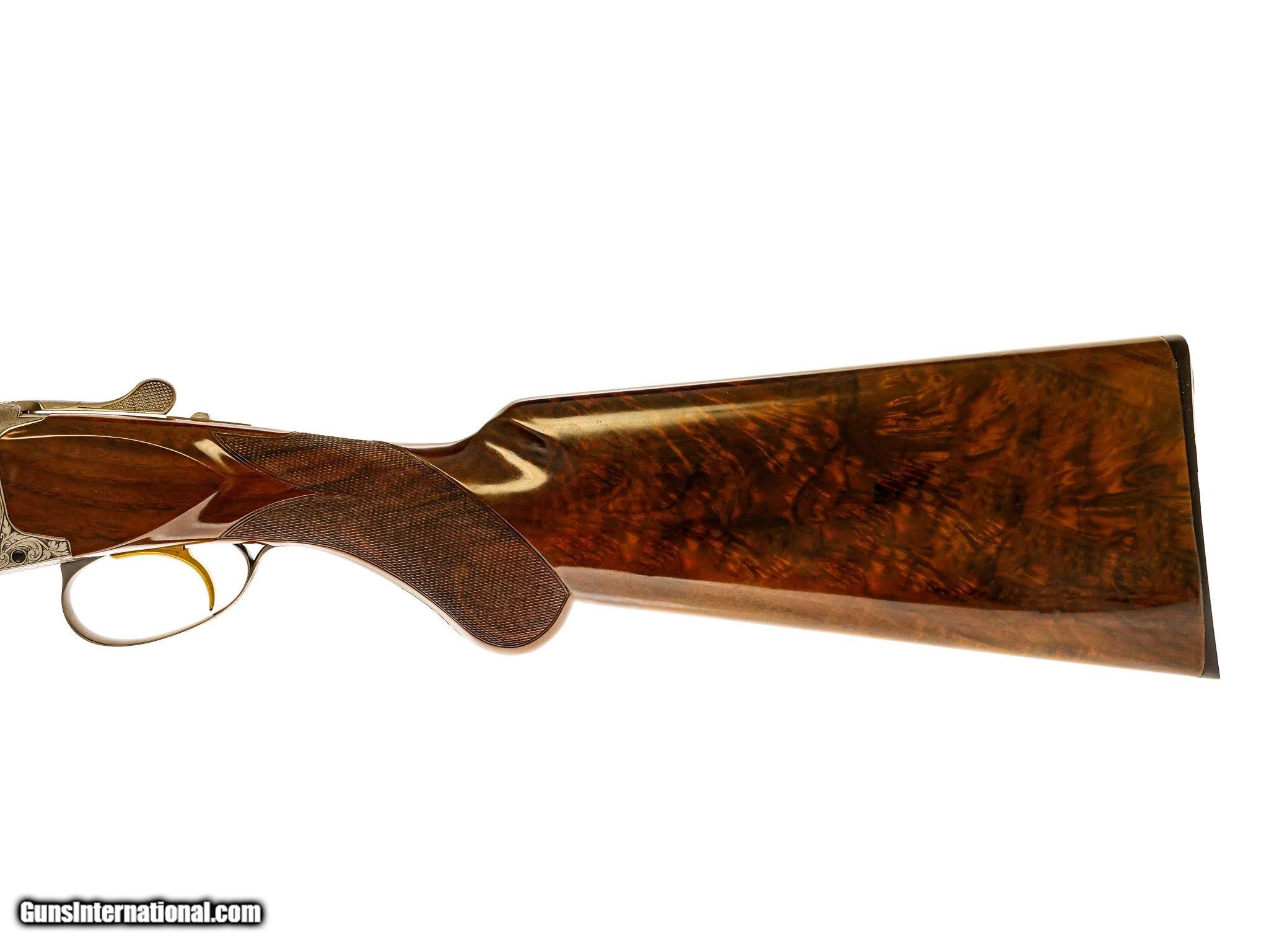 Description: Browning - Diana Grade, 28ga. 28" Barrels Choked SK/SK. Stunningly figured round knob long tang stock, factory Browning butt plate, gold single selective trigger, field forend, automatic ejectors, ventilated rib, stunning Diana engraving pattern signed by factory Master Engraver Lambert, perfect 100% everything, highest quality 1969 Belgian workmanship, extremely rare and desirable gun which would compliment any collection, available for immediate delivery. Inv: 52217 6 lbs. 12 oz. 14 ¼” x 1 ½” x 2 ¼” $27,000.00 OR MAKE OFFER SOLD |