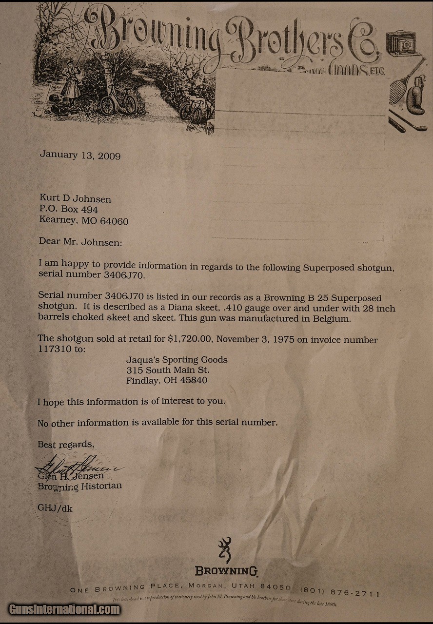 Description: Browning - Diana Grade, .410. 28" Barrels Choked SK/SK. Barrels Choked SKEET/SKEET, highest quality 1970 Belgian manufacture, long tang round knob gun, mind-blowing exhibition French walnut stock, factory Browning butt plate, gold single selective trigger, deep relief highly detailed Diana engraving pattern double signed by factory Browning master engraver Severin, automatic ejectors, ventilated rib, field forend, 100% perfect gun worthy of any serious collection, includes factory box, available for immediate delivery. Inv: 61507 6 lbs. 13 oz. 14 5/8” x 1 ½” x 2” $25,000.00 SOLD |