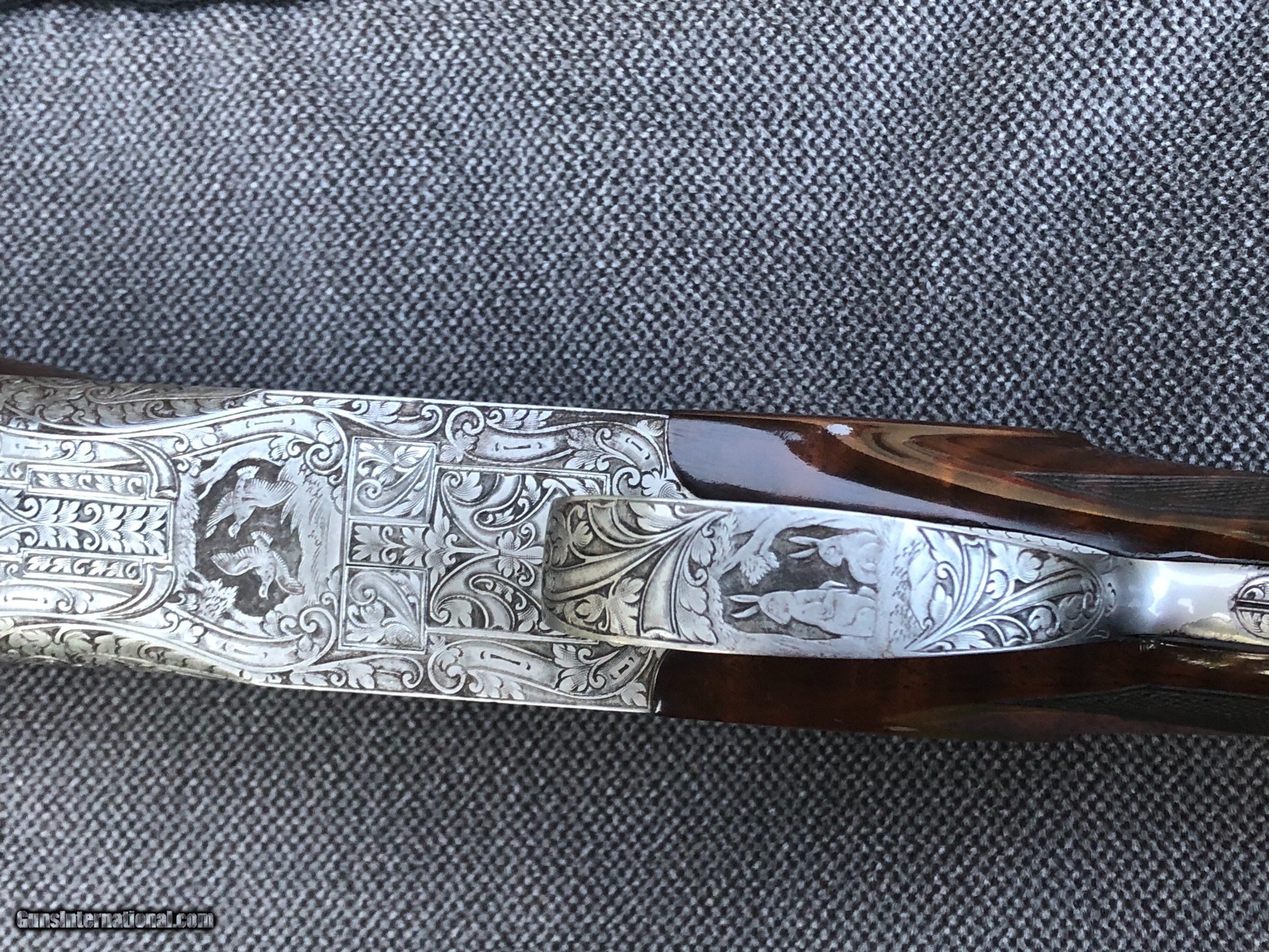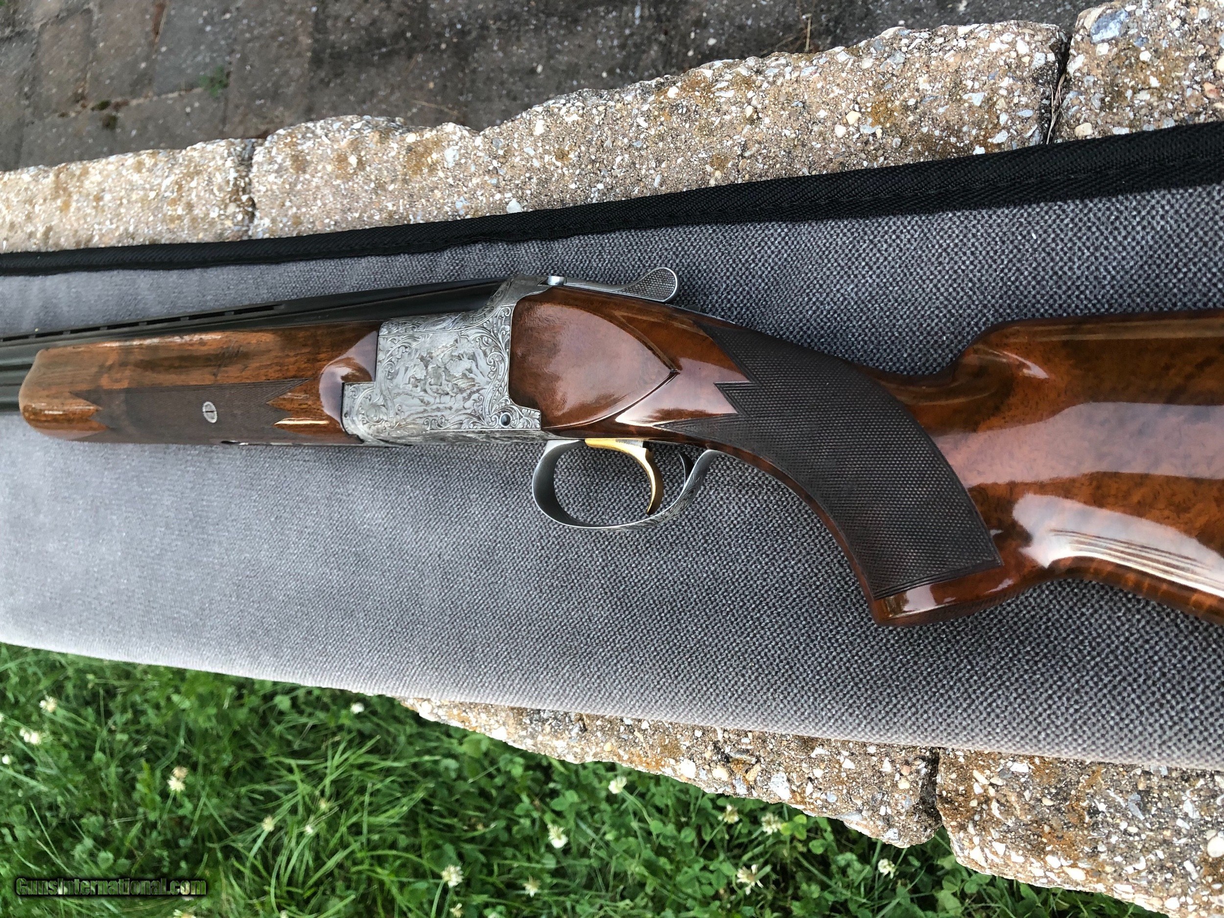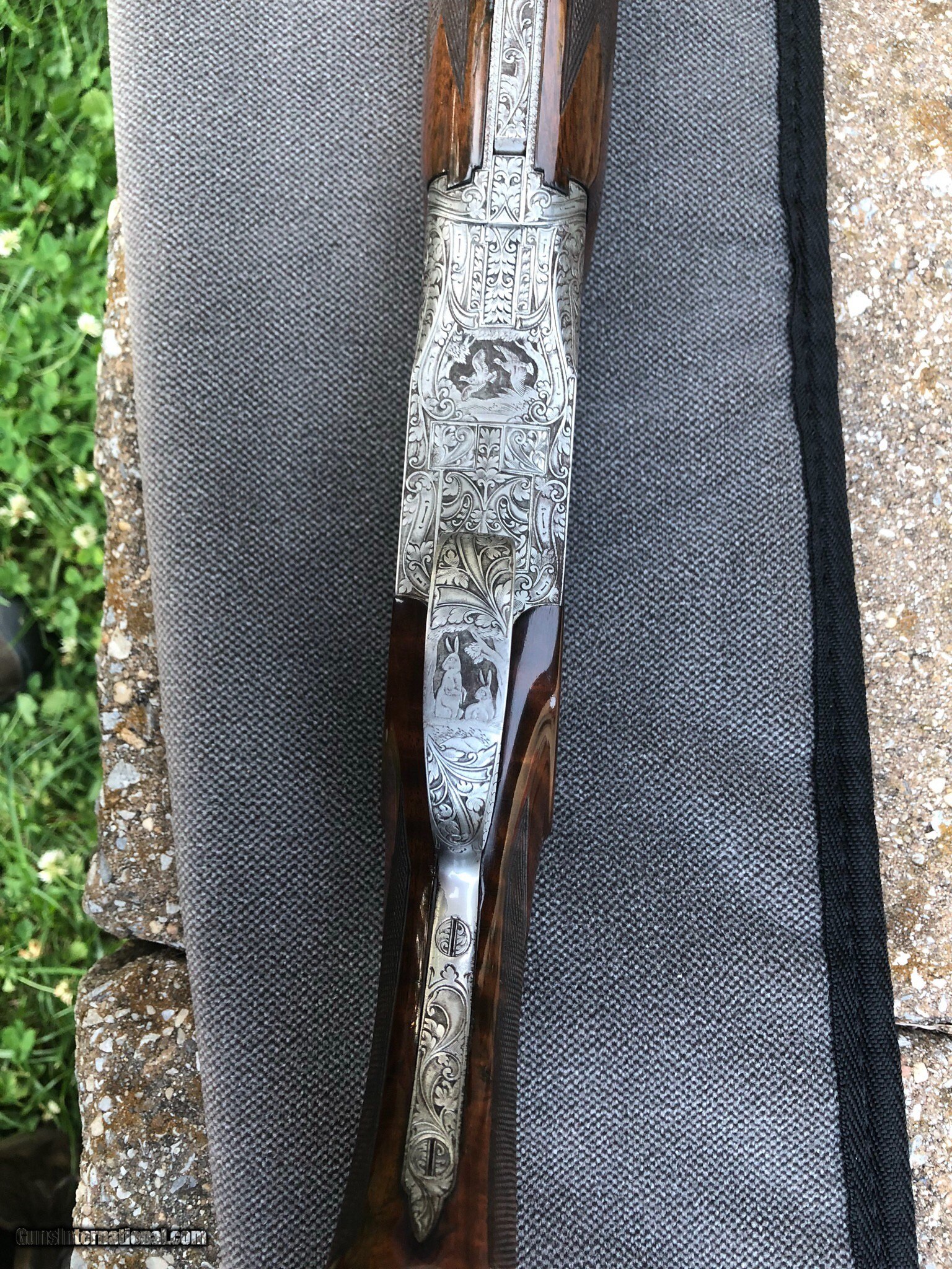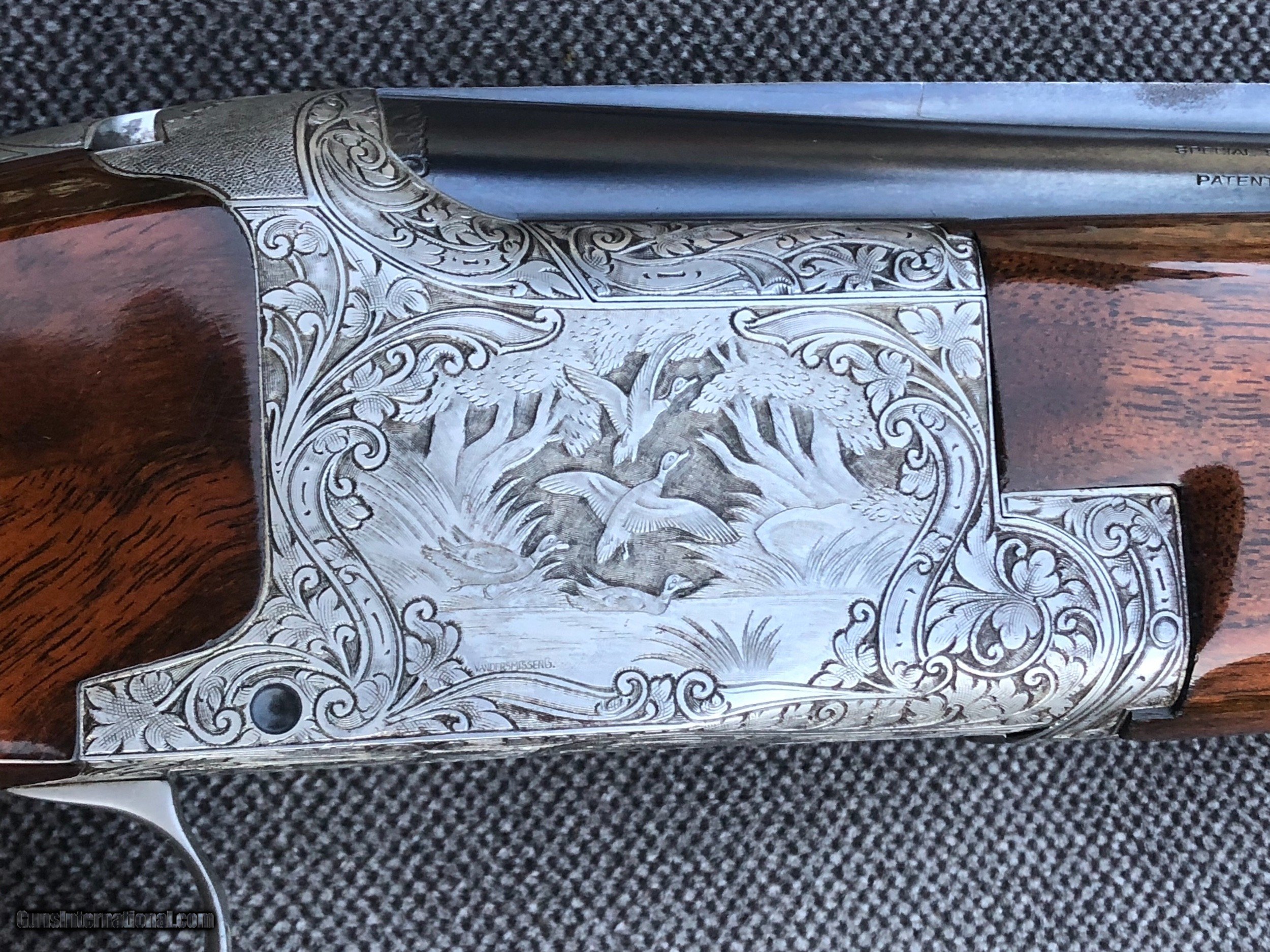 Description: This is a 1966 vintage Diana Grade Lightning rib trap gun. It's unaltered and in excellent condition. 30" barrels are bored IM&F. A few marks here and there in the wood but overall everything is 95%. It's been lightly used and is still tight. Nicely figured wood and it's pre-salt and has the desirable long tang. Standard trap dimensions with a 14 1/2" LOP. Signed by Master Engraver Gaston Vandermessen on both sides. Compare this to any other offerings and you'll see the value here! Use buy now and I'll pay shipping and insurance to the lower 48. I'll also include a fitted kickeze recoil pad for shooting comfort. SOLD |