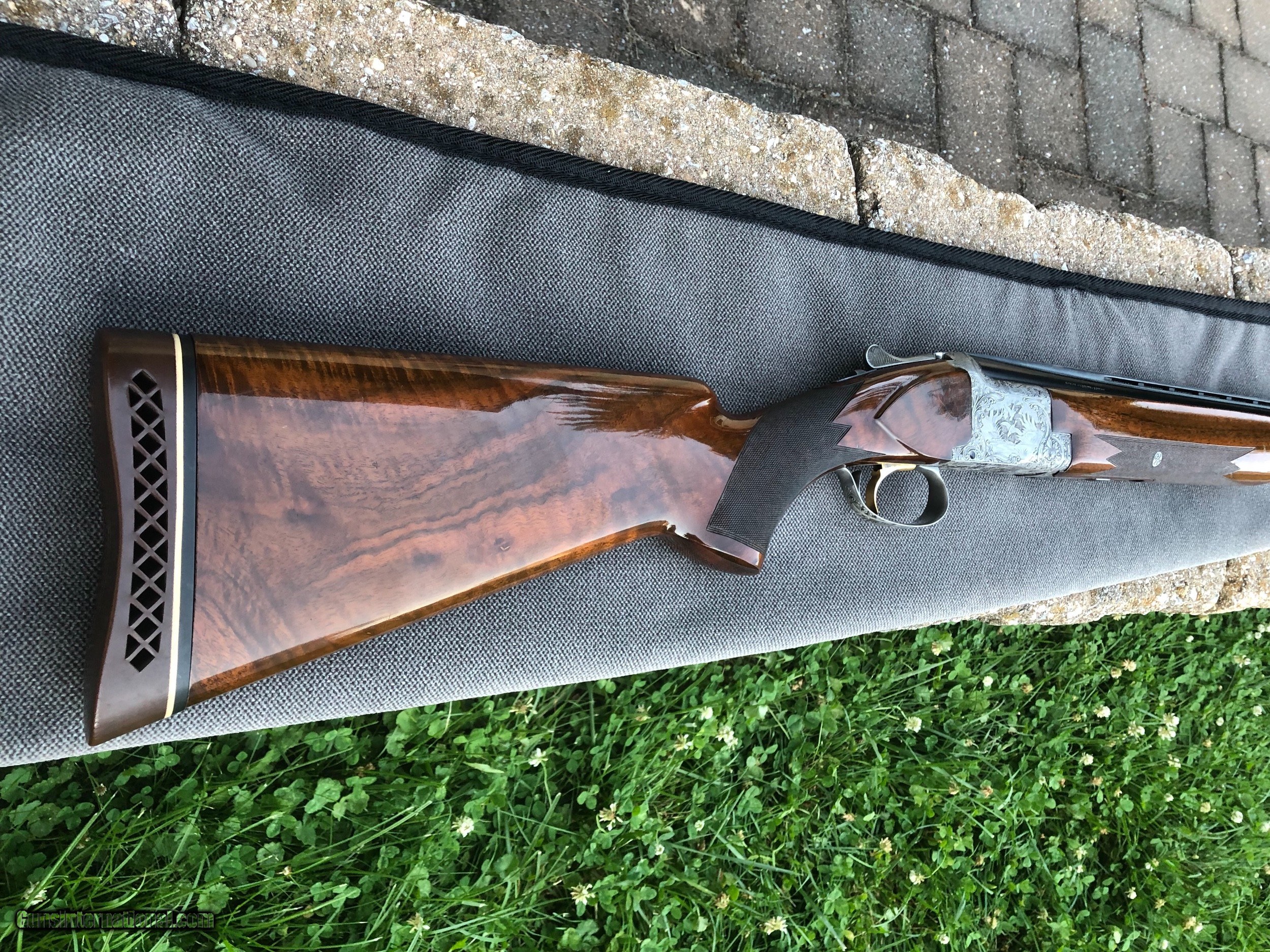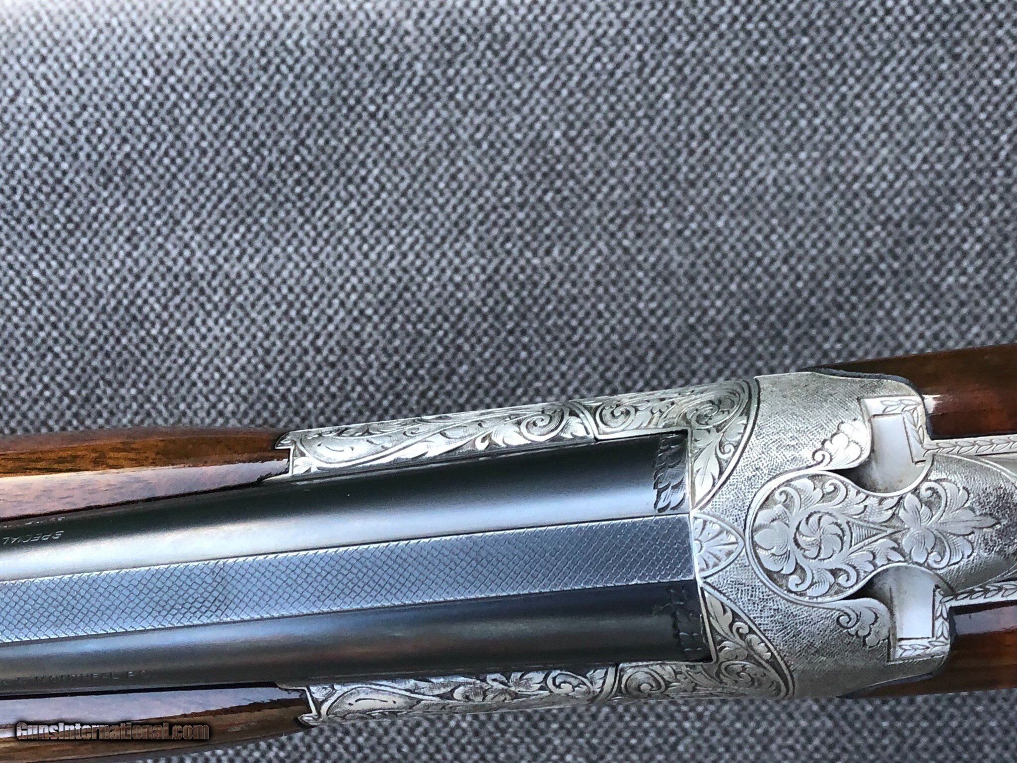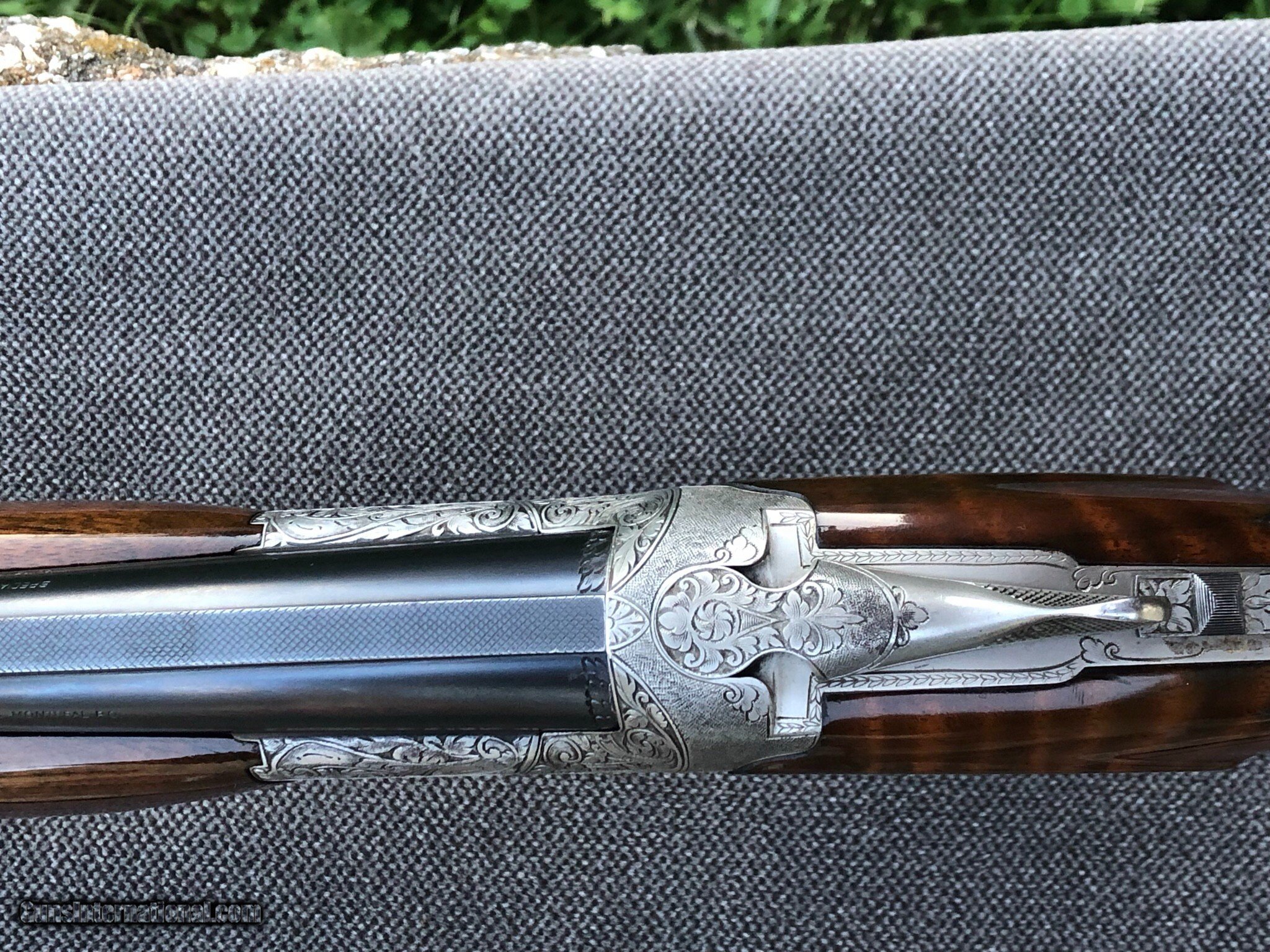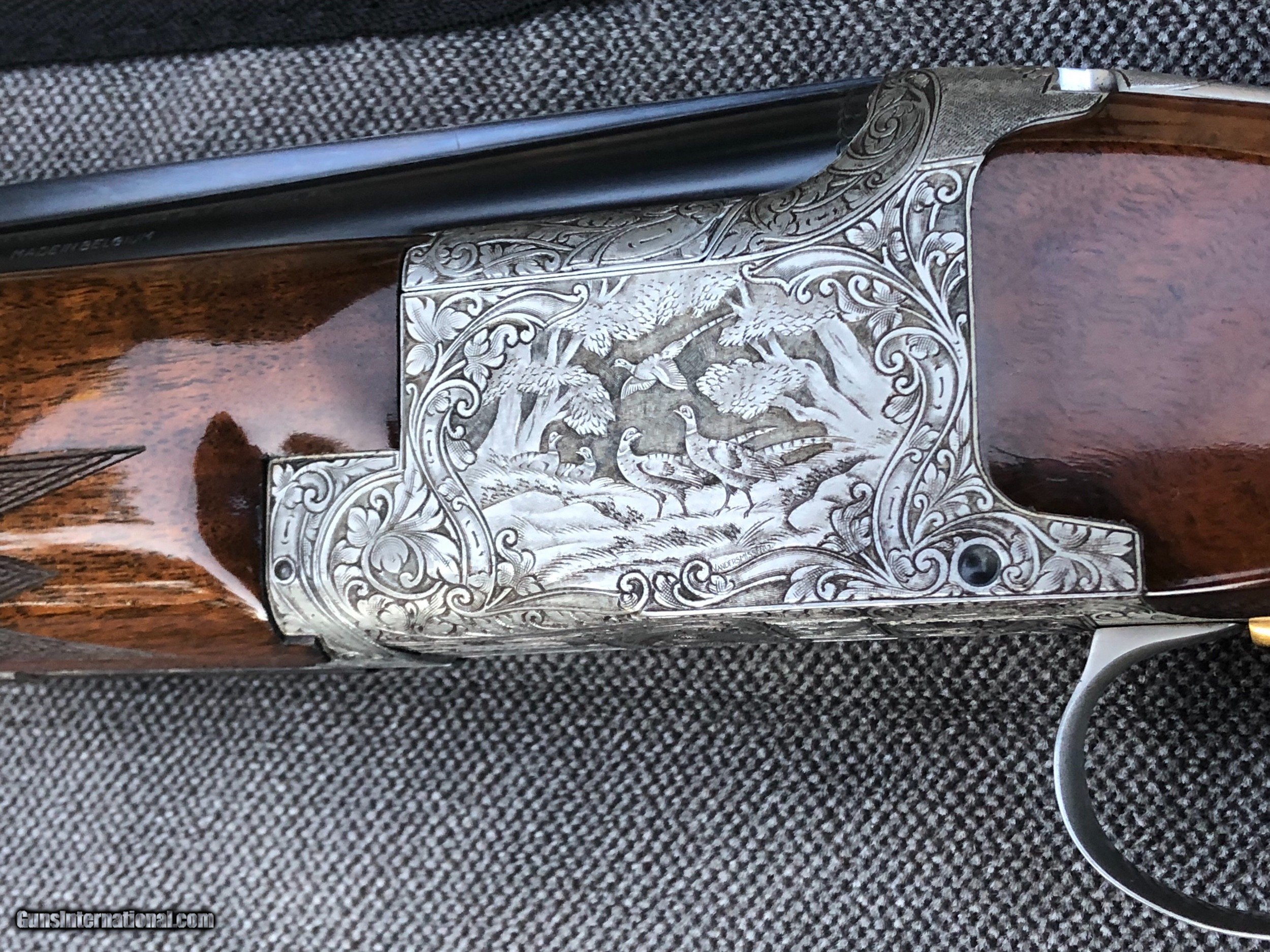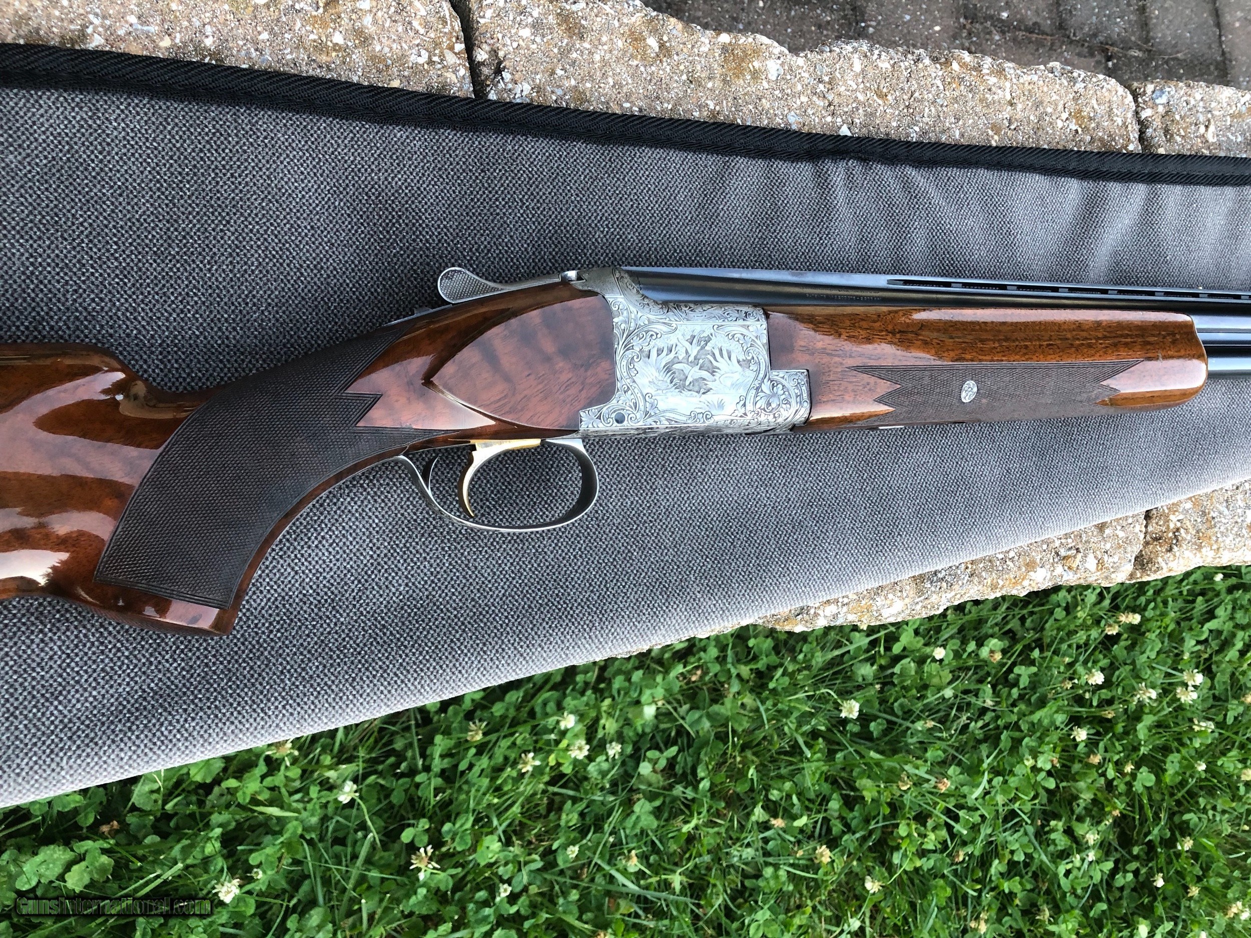 Description: This is a 1966 vintage Diana Grade Lightning rib trap gun. It's unaltered and in excellent condition. 30" barrels are bored IM&F. A few marks here and there in the wood but overall everything is 95%. It's been lightly used and is still tight. Nicely figured wood and it's pre-salt and has the desirable long tang. Standard trap dimensions with a 14 1/2" LOP. Signed by Master Engraver Gaston Vandermessen on both sides. Compare this to any other offerings and you'll see the value here! Use buy now and I'll pay shipping and insurance to the lower 48. I'll also include a fitted kickeze recoil pad for shooting comfort. SOLD |