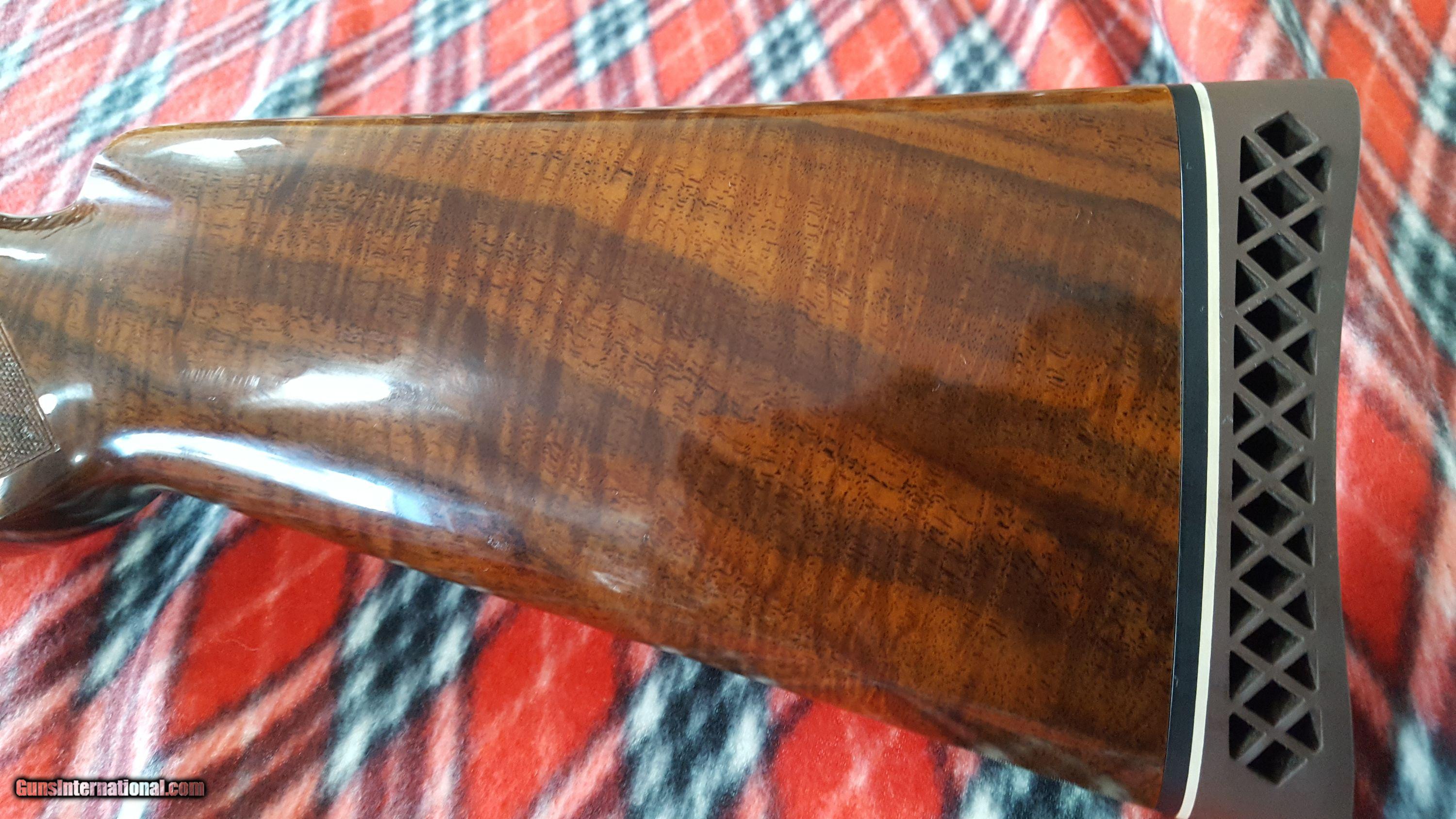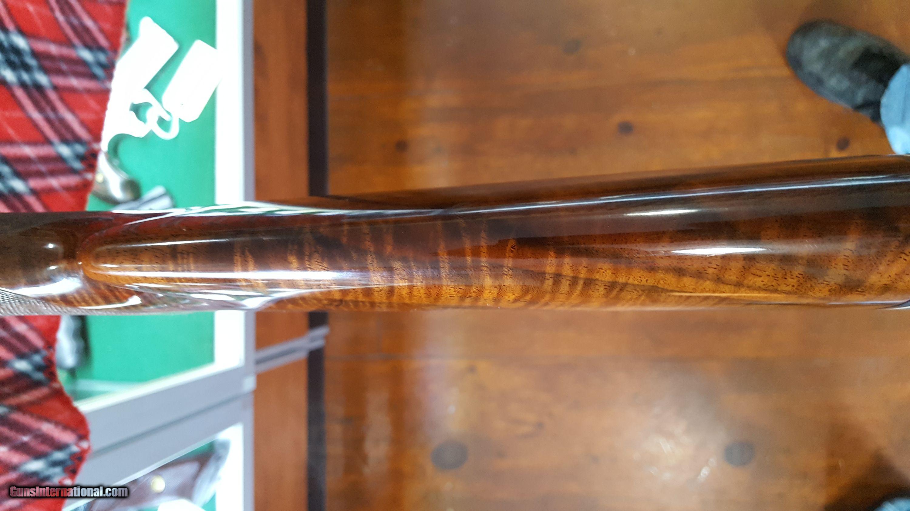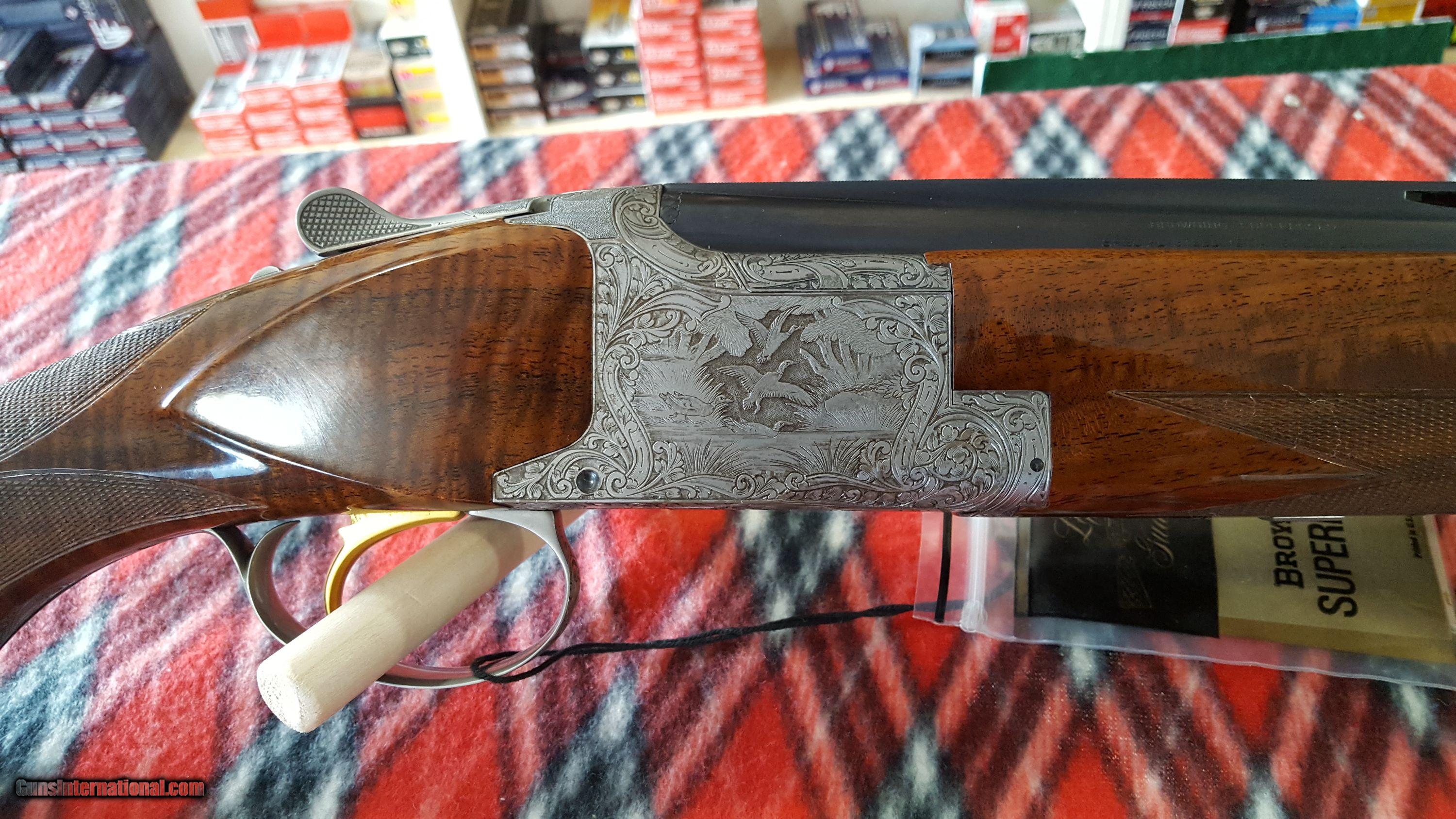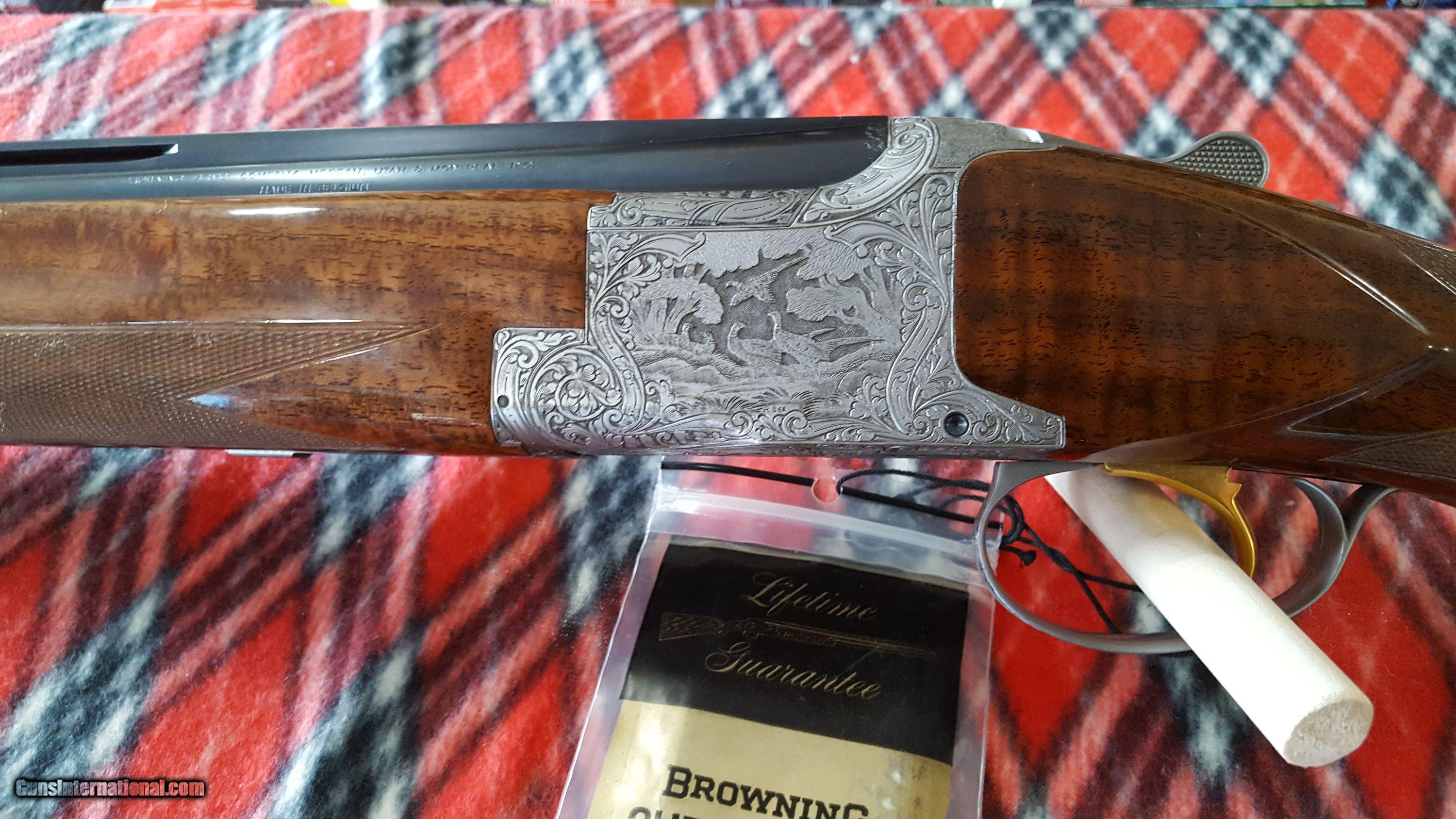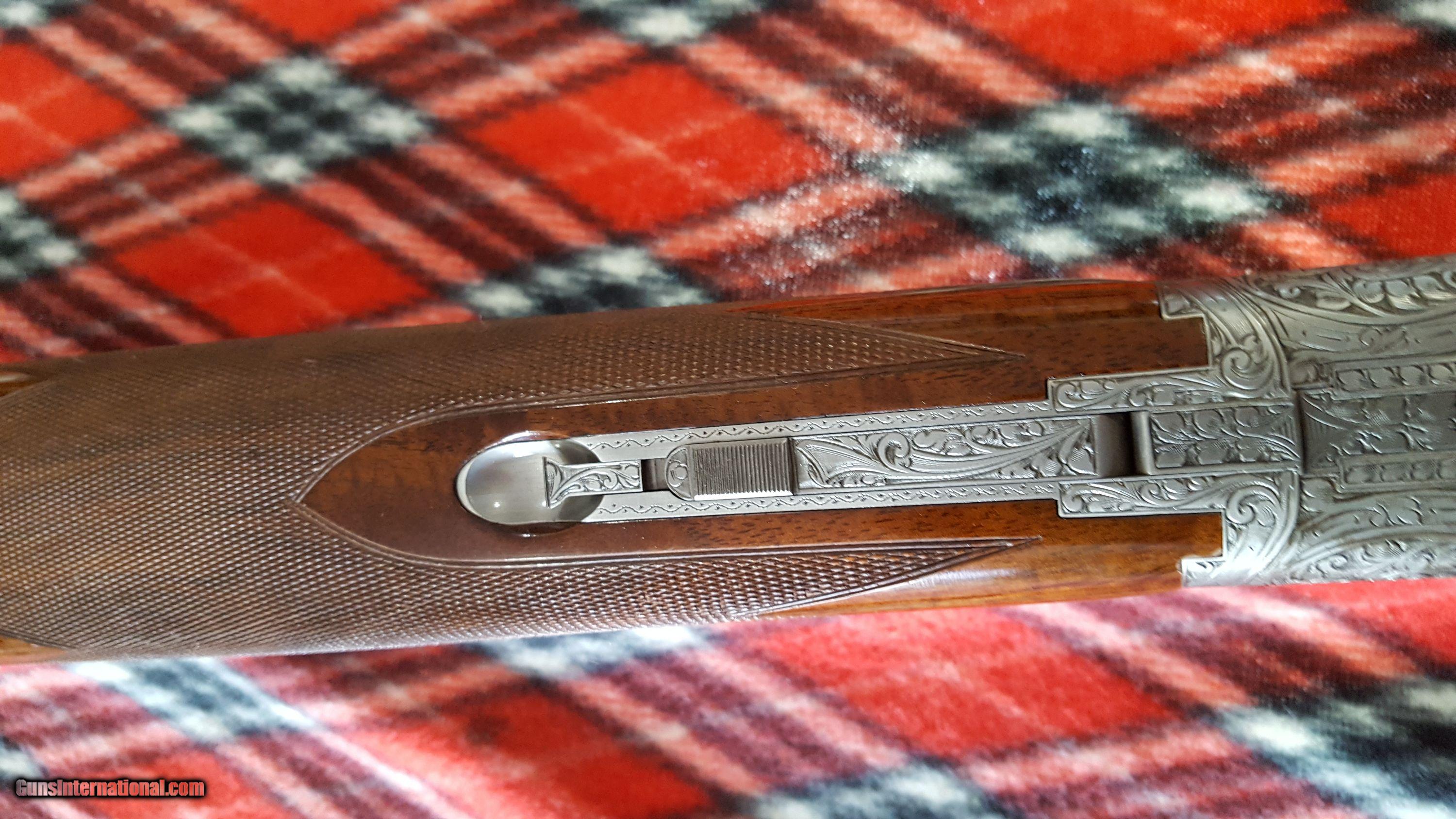Description: Browning. Superposed O/U Shotgun. 12 Ga. Made in Belgium. Model Lighting Broadway Diana trap gun. Manufacture 1974. Features 30" barrel, full over improved modified. Full vent rib, deluxe checkered high gloss walnut stock , single gold trigger and Browning rubber recoil pad. 14 1/2" LOP. Receiver has antique nickel finish, fully chisel engraved and artist signed "R.Bee". The entire receiver and trigger guard, as well as forend metal are engraved. Deep chiseled background has mallards on right side, pigeons on bottom, pheasants on left and rabbits on trigger guard. Gun shows as new in original box with paperwork. Serial # 33737 S74 SOLD |