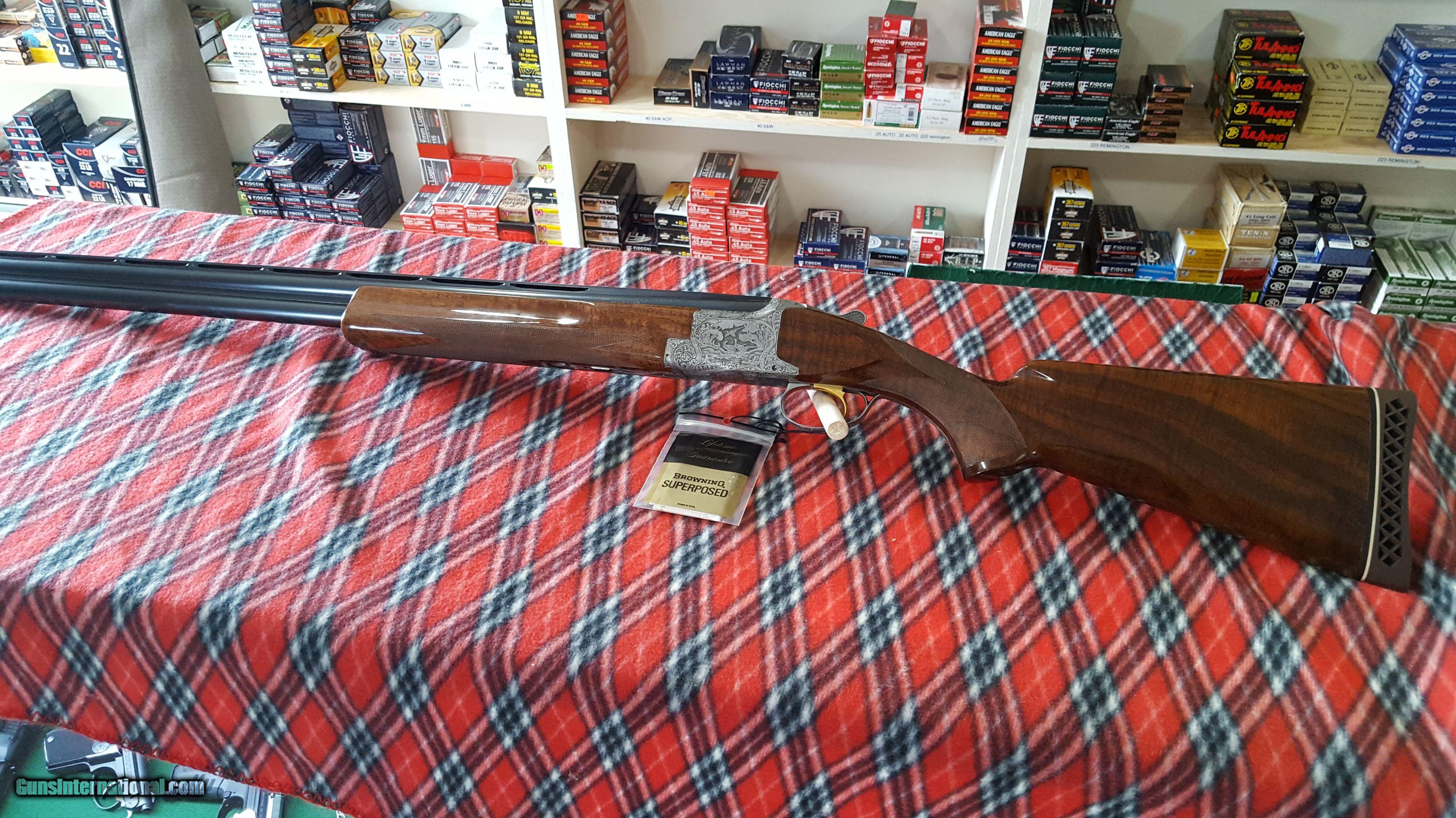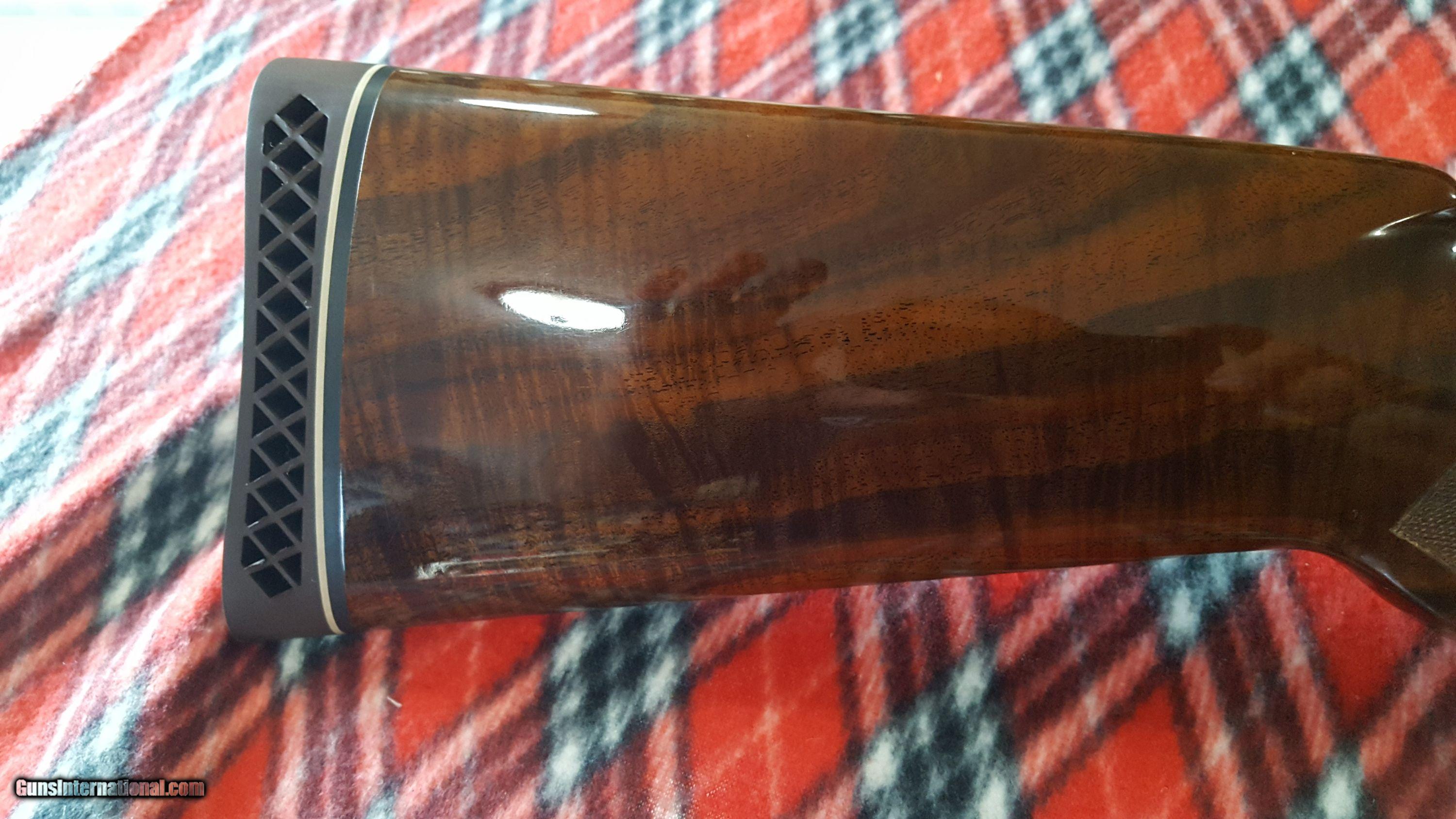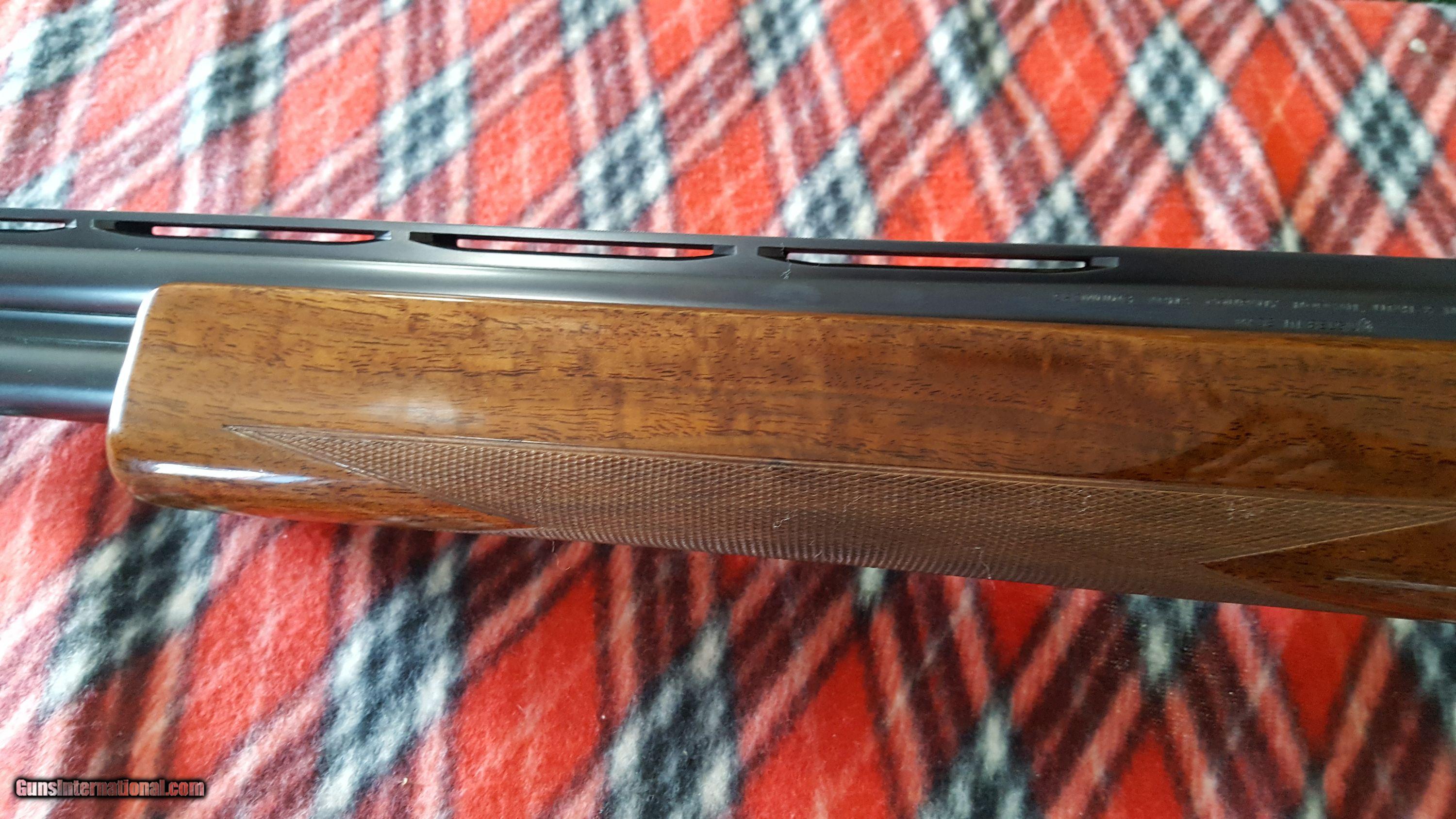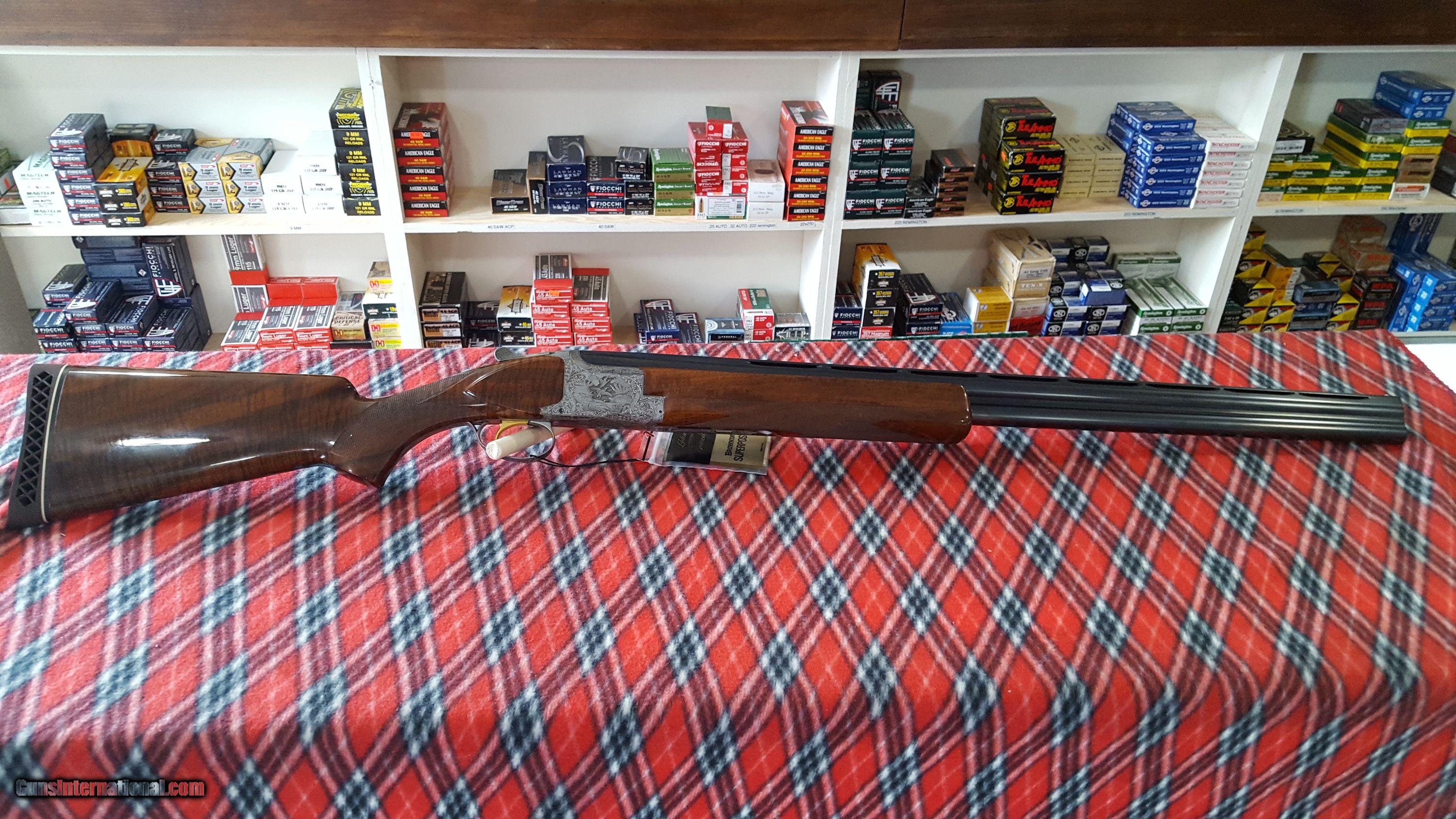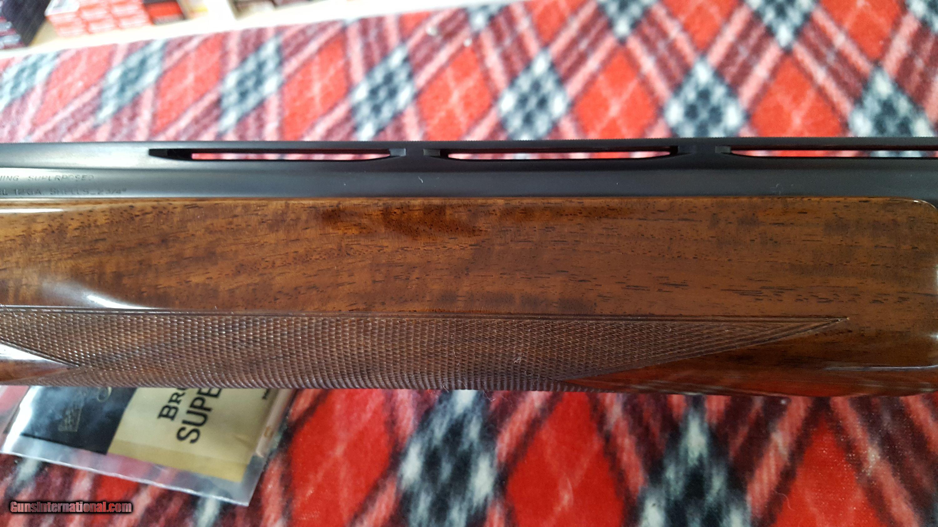 Description: Browning. Superposed O/U Shotgun. 12 Ga. Made in Belgium. Model Lighting Broadway Diana trap gun. Manufacture 1974. Features 30" barrel, full over improved modified. Full vent rib, deluxe checkered high gloss walnut stock , single gold trigger and Browning rubber recoil pad. 14 1/2" LOP. Receiver has antique nickel finish, fully chisel engraved and artist signed "R.Bee". The entire receiver and trigger guard, as well as forend metal are engraved. Deep chiseled background has mallards on right side, pigeons on bottom, pheasants on left and rabbits on trigger guard. Gun shows as new in original box with paperwork. Serial # 33737 S74 SOLD |