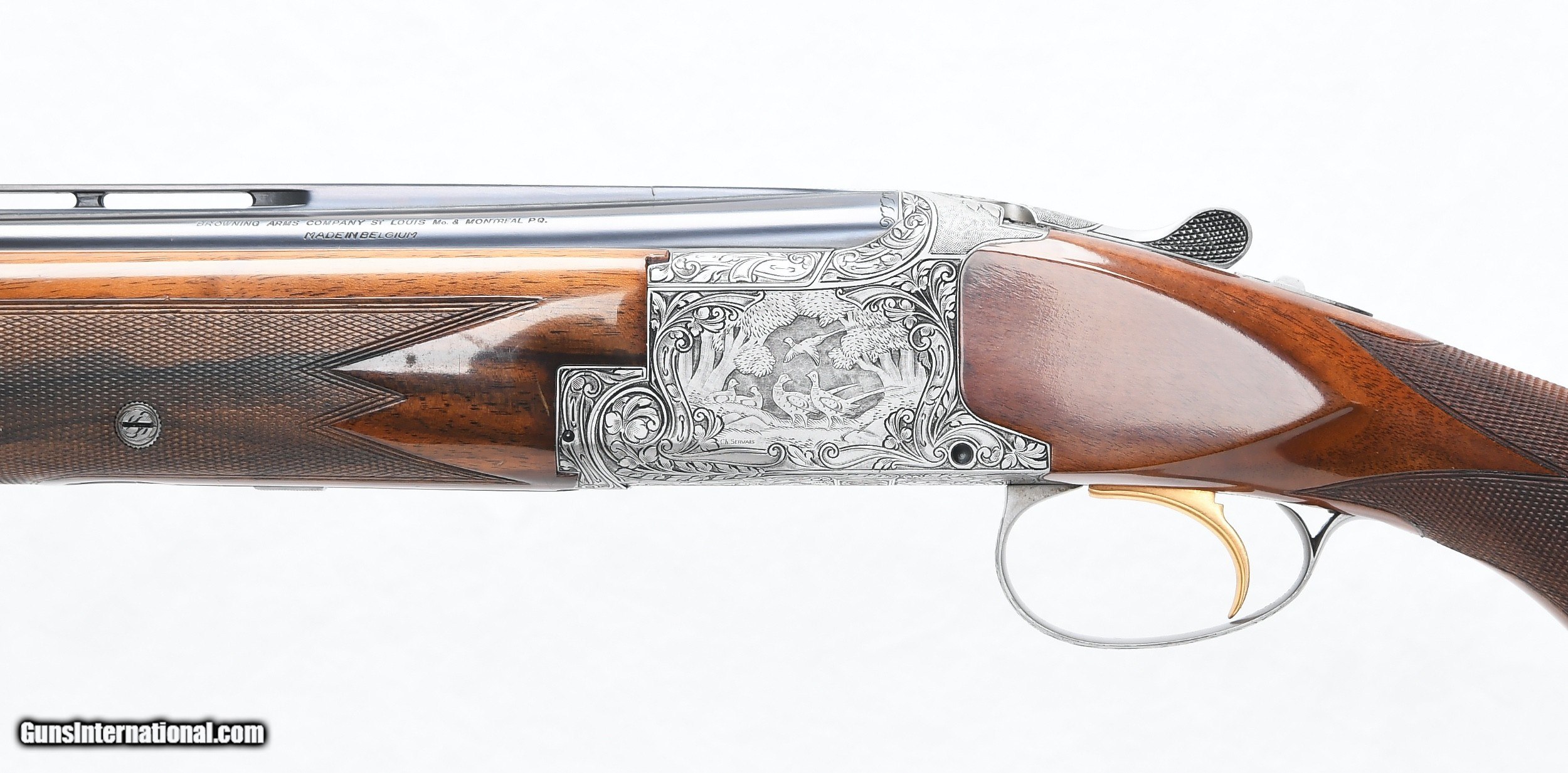 Description: Browning Superposed Diana Grade 28 gauge O/U shotgun. A one owner gun that was made in 1967 and it was discovered to be “salty”. It was returned to Browning for warranty servicing and it has remained unfired since the Browning restoration in the early 70’s. Originally this was a round knob/short tang gun (see photo of the lamp!) and when Browning did the salt restoration they replaced the stock with the flat knob/short tang that you see here. Configuration: 28” barrels that are choke marked IC/M and measure .012” & .020”. Vent rib with traditional metal front bead. The beautiful pistol grip buttstock and field forearm were crafted from a gorgeous piece Walnut and the stock was fitted with a Browning buttplate. 14 1/8” LOP over the buttplate, 1 3/8” DAC, 2 1/16” DAH and a very slight cast favoring a left hand shooter. Weighs 6 lbs. 9 oz. Condition wise as I said this gun is unfired since Browning restoration is the early 70’s. There are a few light handling marks: a small “ding” in forearm on the right side, near the breech end of the checkering and some finish “checking” is becoming visible on the forearm. All barrel markings are crisp and sharp and the blue is perfect except for the customary mark where the forearm slides under the barrel. Otherwise very mint. The receiver was engraved by Charles Servais and signed on both sides. The frame finish is “as new” $15,350.00 SN: 1762F7 SOLD |