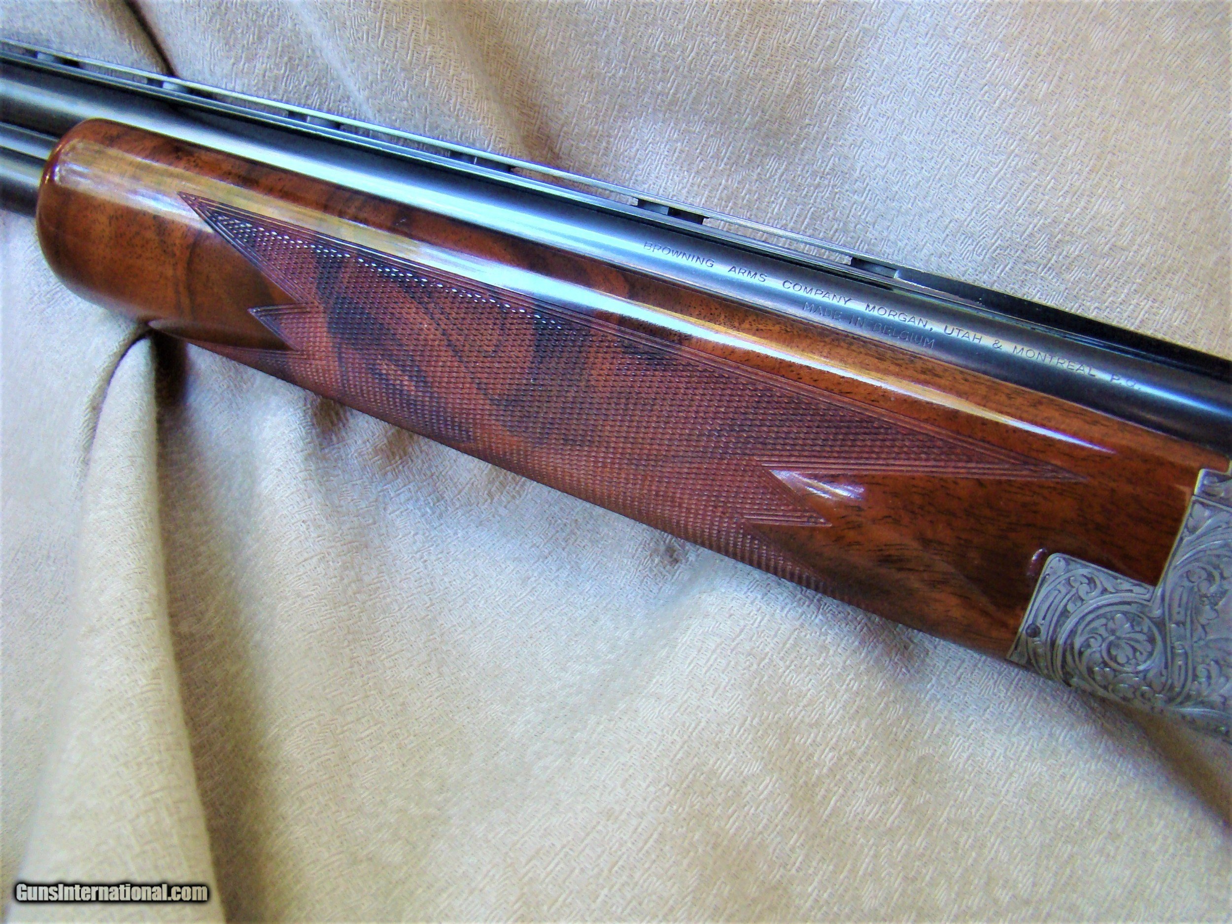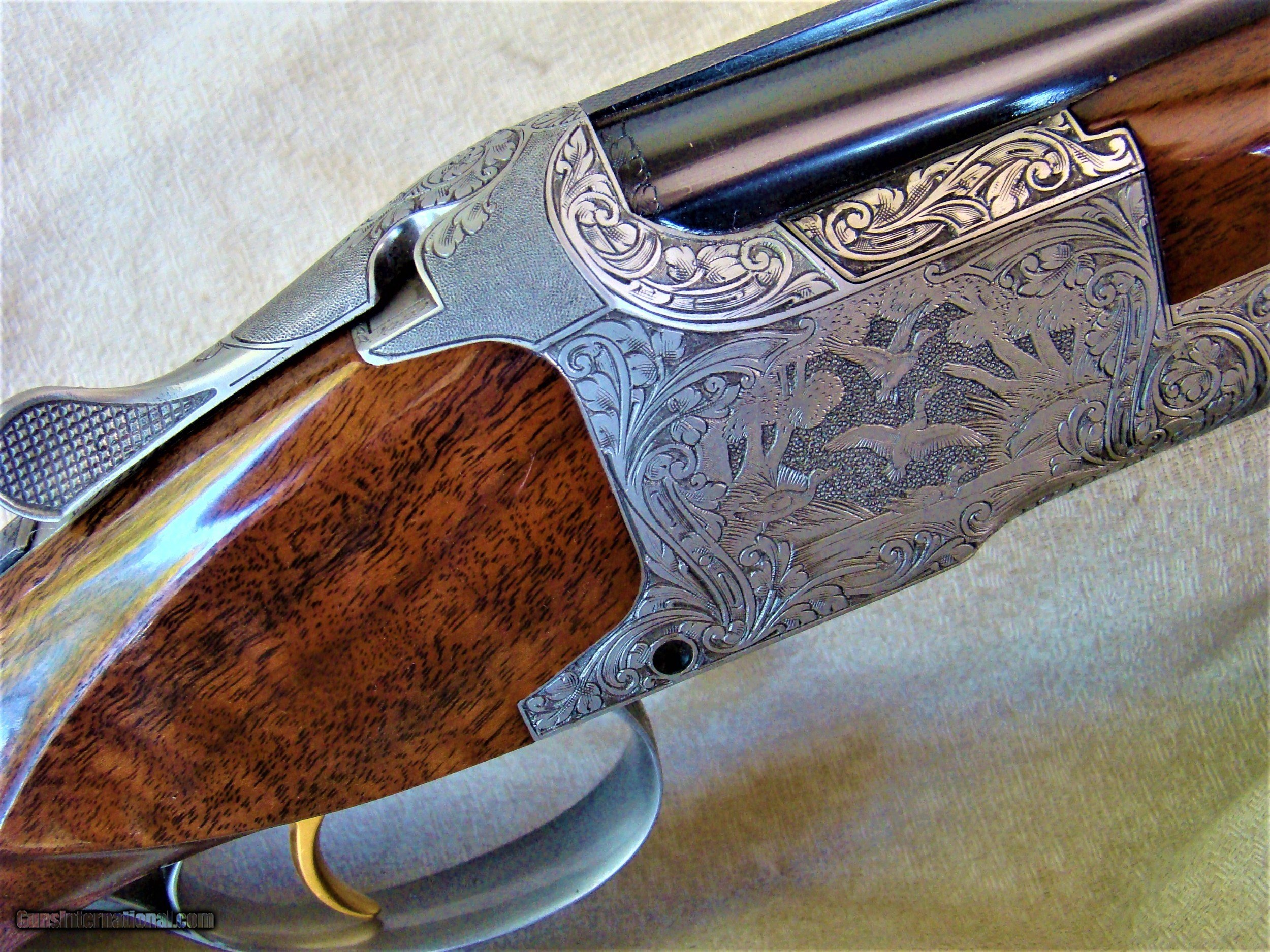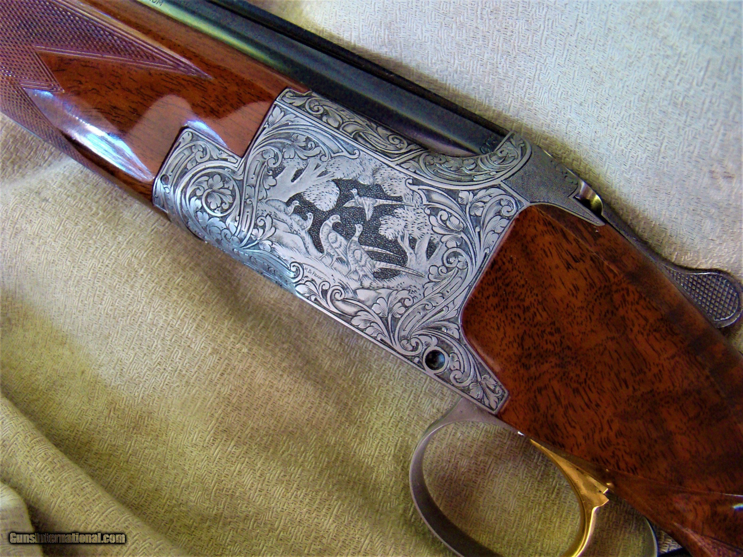 Description: Browning Superposed Diana grade 20 ga. features 28" vent rib barrels choked modified and full. The action engraved in a classic Diana pattern of game scenes and flowing scroll is well-executed and signed M. Di Franco. This wonderful example was produced in 1976 and is in new condition. The long tang pistol grip stock measures 1 3/8" comb, 2" heel, LOP 14-1/4" to the butt plate. The wood on this particular Diana is nothing short of spectacular. The fire and grain in perfect layout showcasing black figure with contrast and color that appears alive as the light plays on the surface. One would be hard pressed to find a stock this special. Weighs 6lbs 2oz. One of the best, truly elegant. SOLD |