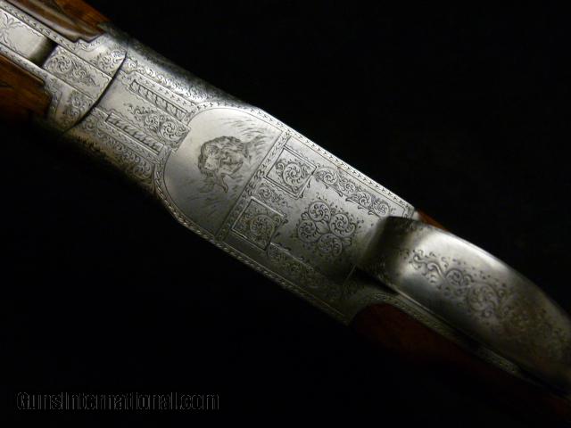 Description: Browning Superposed Gr III "Fighting Cocks" 12ga Belgium manufacture s/n: 57395 (ca. 1957), 12ga with 2 3/4" chambers, blue steel 28" VR bbls. w/ single bead and choked M/F (**/*). Silver receiver, forend iron and trigger bow game scene engraved and double signed by master engraver: F. Funken w/ pheasants on right side, fighting roosters on left side and setter or spaniel retrieving a bird surrounded by European scroll engraving, single selective gold plated trigger. Nicely figured walnut round knob/long tang stock w/ point checkering pattern w/ borders, "lightning field" style forearm, stock has been cut and is 12 1/2" to the end of the wood and the LOP is 13 3/4" over a newish ventilated Browning pad, finish shows handling marks that lead you to believe that its original or at least re-done a long time ago. Overall wood and metal are about 95% w/ handling marks in the wood but no cracks, some scratches in the barrel finish, bores are good w/ a pin size dent in top barrel that should have no affect on shooting w/ reasonable loads; gray receiver shows some "tarnishing"...overall gun's condition is consistent with its age. Dimensions are 1 1/2 x 2 1/2", weighs: 7 lbs. 11 oz. SOLD Curio/Relic: Yes Manufacturer: Browning Model: Superposed Gr III Fighting Cocks Serial Number: 57xxx Chambers: 2 3/4" Ejectors: yes Condition: good Metal Condition: 95% Wood Condition: 95% Bore Condition: good Barrels: 28" Barrel Type: demi bloc Action: o/u Triggers: SST Gauge Info: 12ga Stock Comb: 1 1/2 Stock Heel: 2 1/2 Fore End: Lightning Field Butt Pad: Browning pad LOP: 13 3/4 Rib: VR Finish: grey finish Weight: 7 lbs. 11 oz. Sights: single bead Manufacture Date: 1957 Chokes: M/F (**/*) Engraving: Funken engraved fighting cocks |