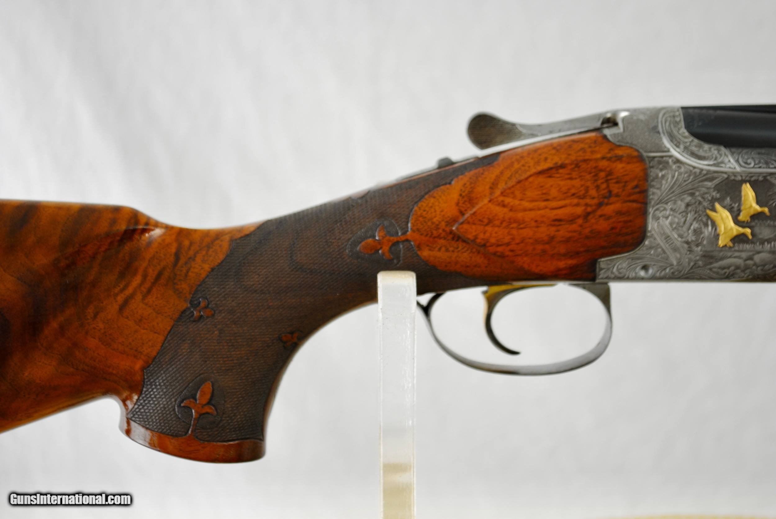 Description: This is a very unique Doyan Engraved Grade 5, 20 gauge Superposed Browning. Acknowledged as skilled an engraver as Felix Funkin, Doyan typically only engraved Grade 5 guns. This is the only Grade 5 with gold animals that we have ever encountered. Browning Collectors letter confirms that the gun was made as an original Grade 5 in 1956. Unusual Monte Carlo cheekpiece stock with Fleur de lis checkering pattern and Browning Butt Plate. Silver oval grip cap inlay with initials, also confirmed by Browning Collectors Association Letter. This appears to be a very rare custom order Browning. Chokes are Skeet and IC, having been opened up from Mod and Full, also confirmed by the Browning letter. Gun was obviously used for Skeet and has seen extensive use. Mirror bores. Weight of gun is 6 LBS 13 1/2 OZ. LOP is 13 7/8:". Drop at Comb - 1 1/2". Drop at Heel - 2". Shipping is $50. Payment by check only. SOLD Curio/Relic: Yes |