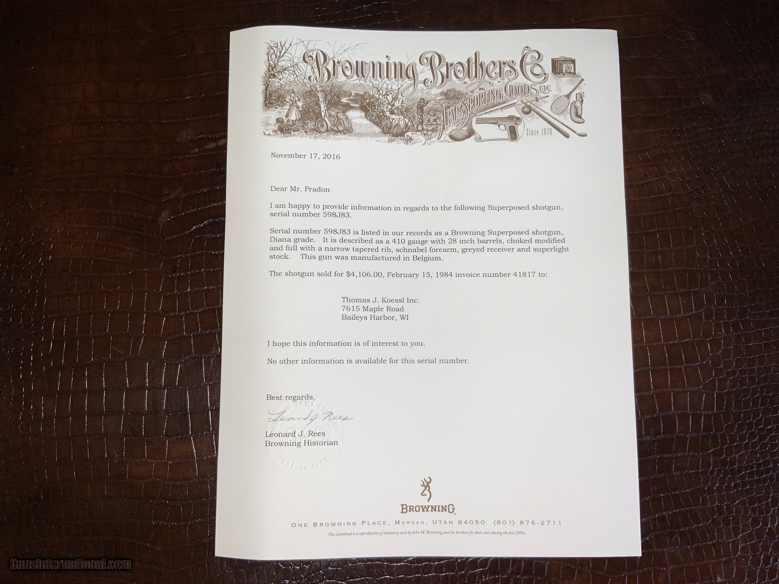 Description: Browning Superposed Superlight Diana - 410ga - 28” - M/F - Special Order by Koessl of Wisconsin - Case and Gun Like New - see letter attached - L. Cortis Engraved - ca. 1983 - Superb Walnut and Engraving - Bravo! 14 1/4 x 1 3/8 x 2 1/4 - 6.7 lbs - SN: 598J83 The Quillen-Worfe Private Gun Collection - Guns International page – please read prior to making a purchase: