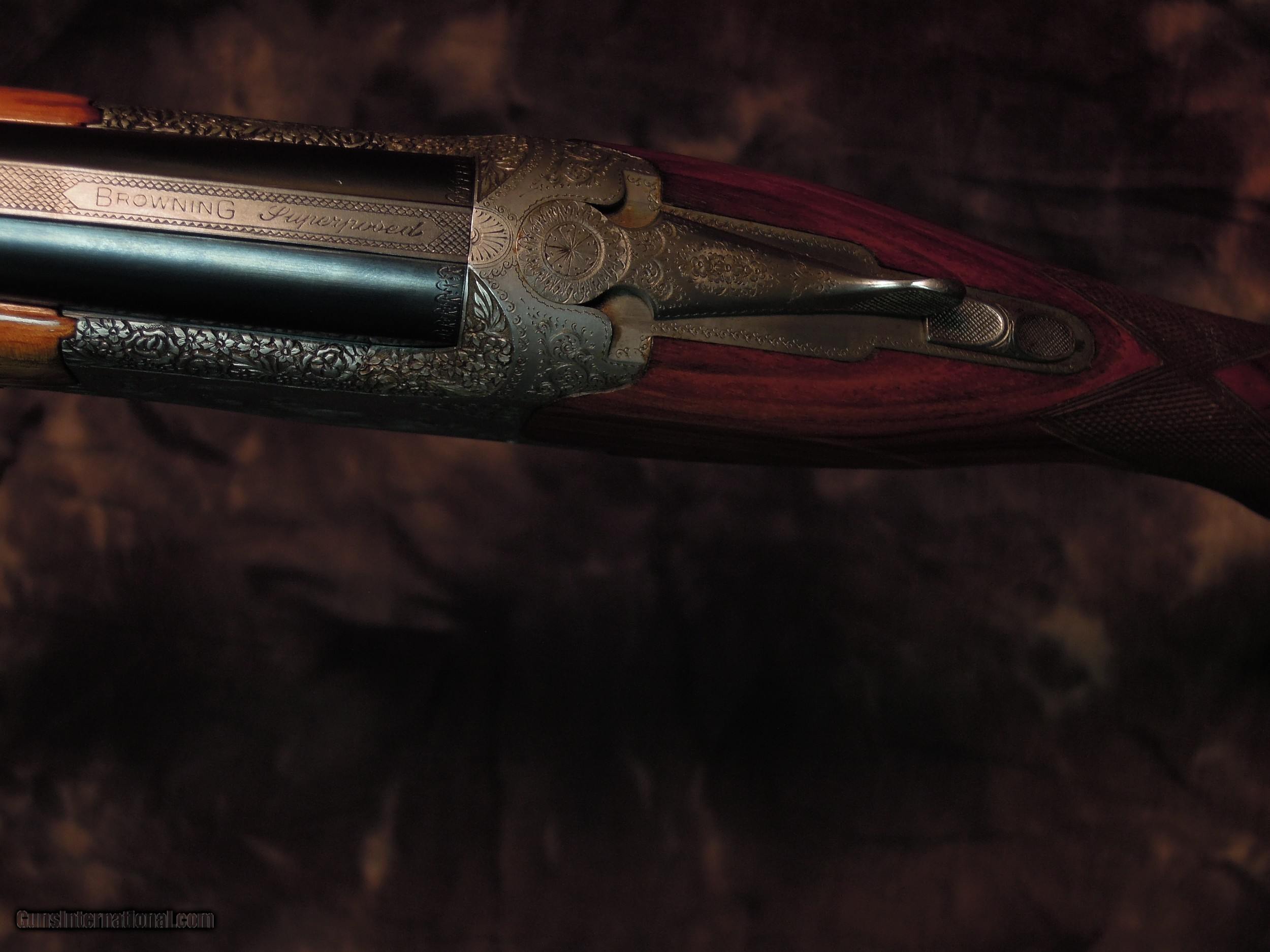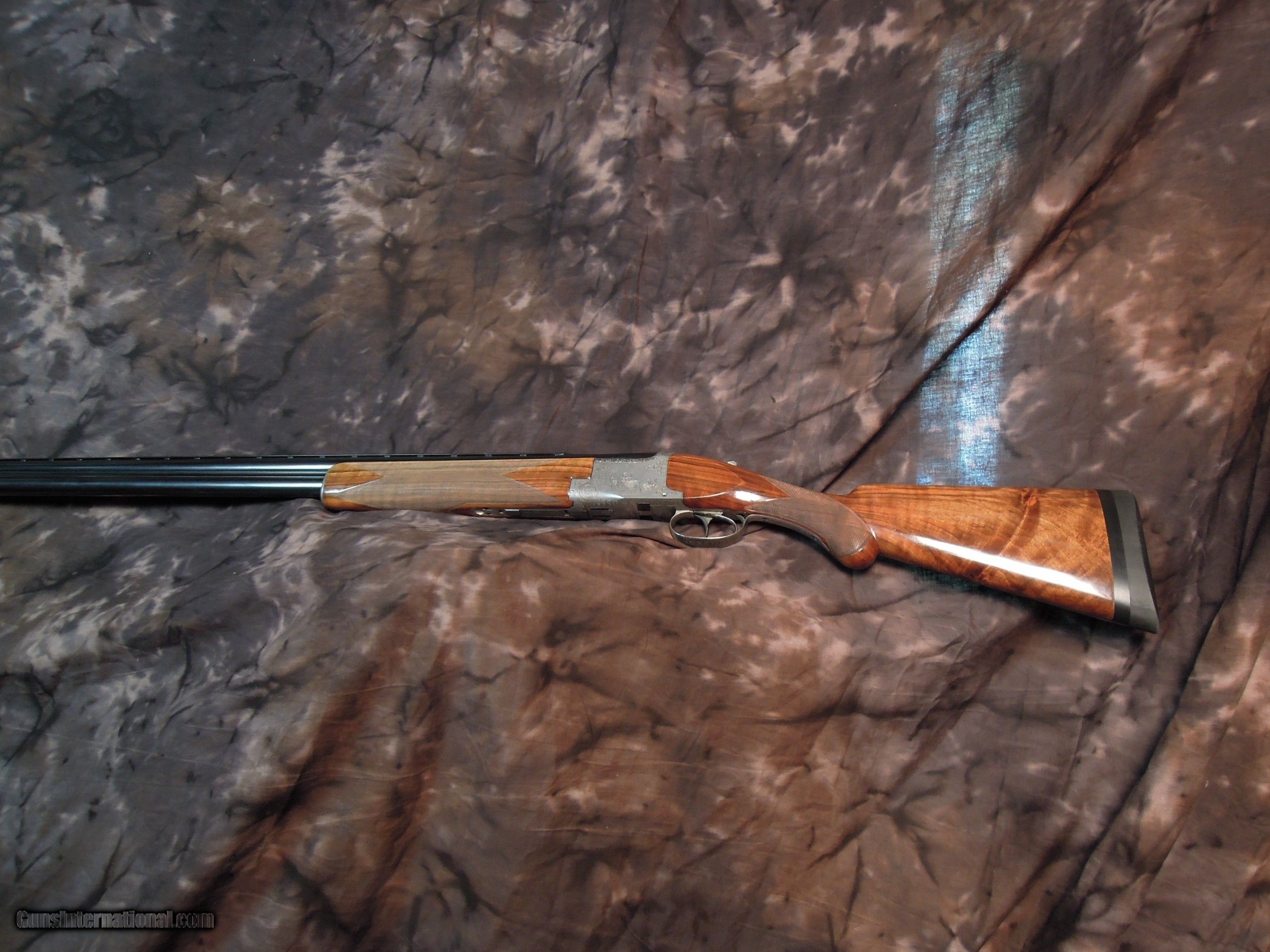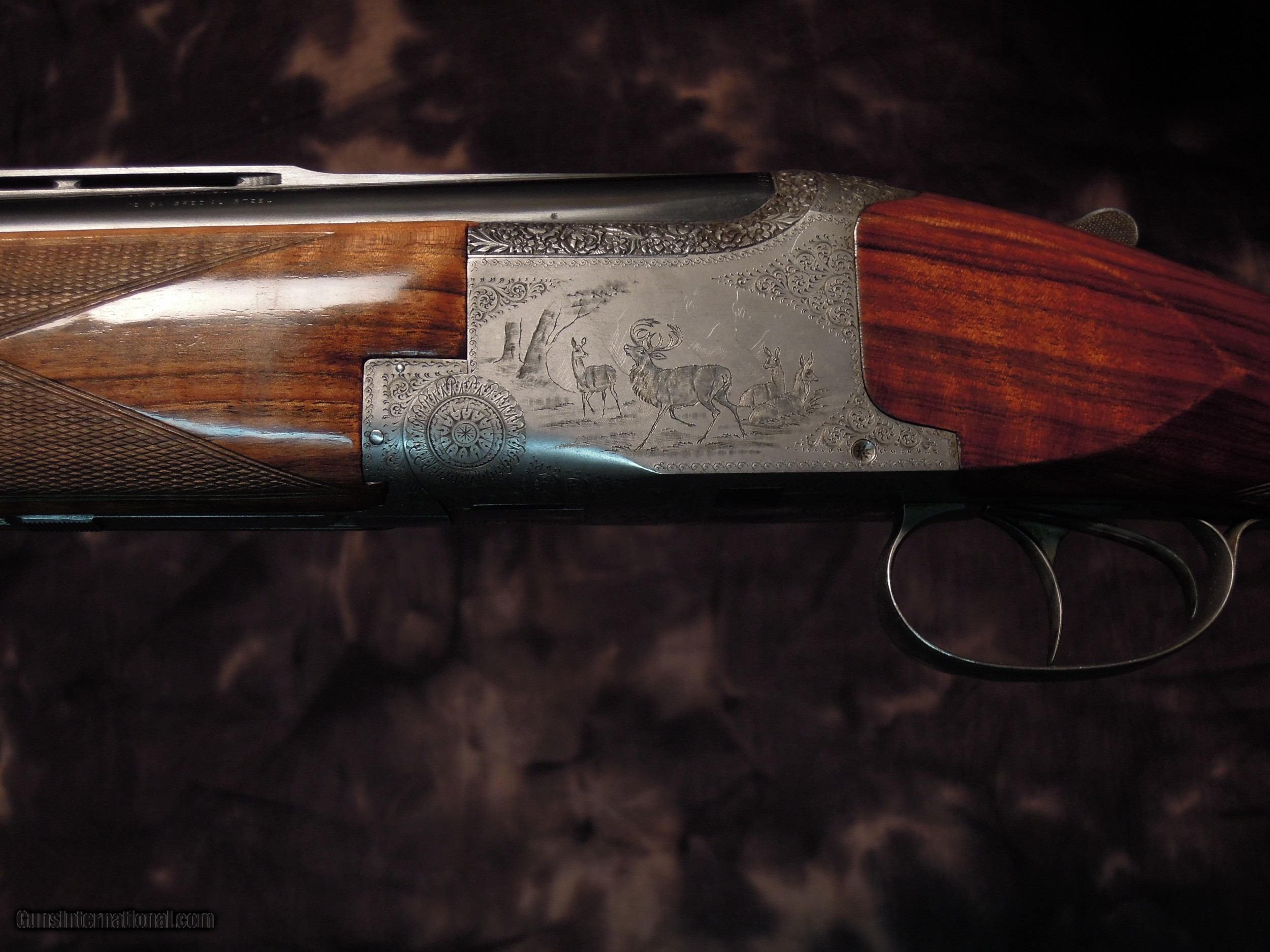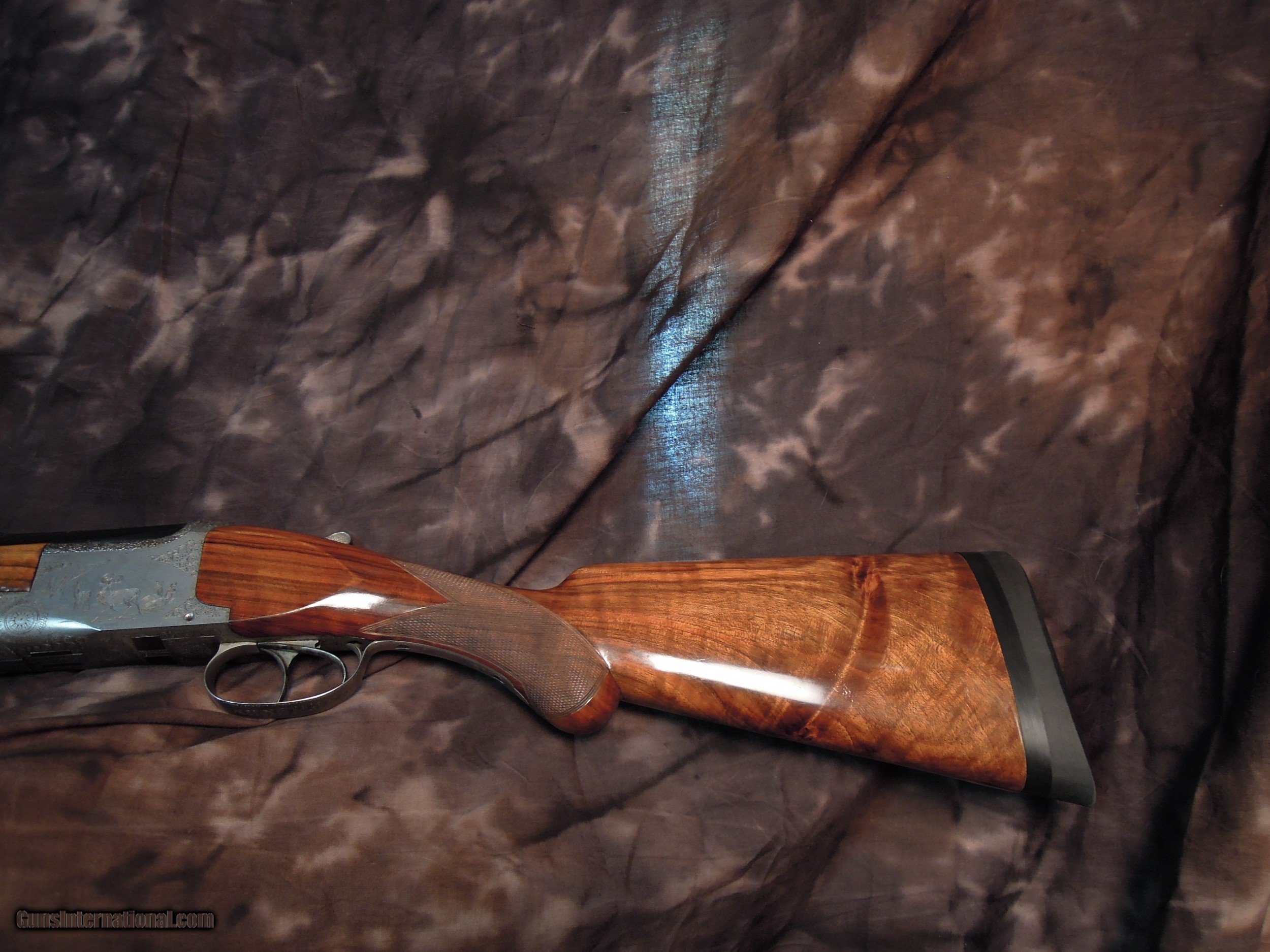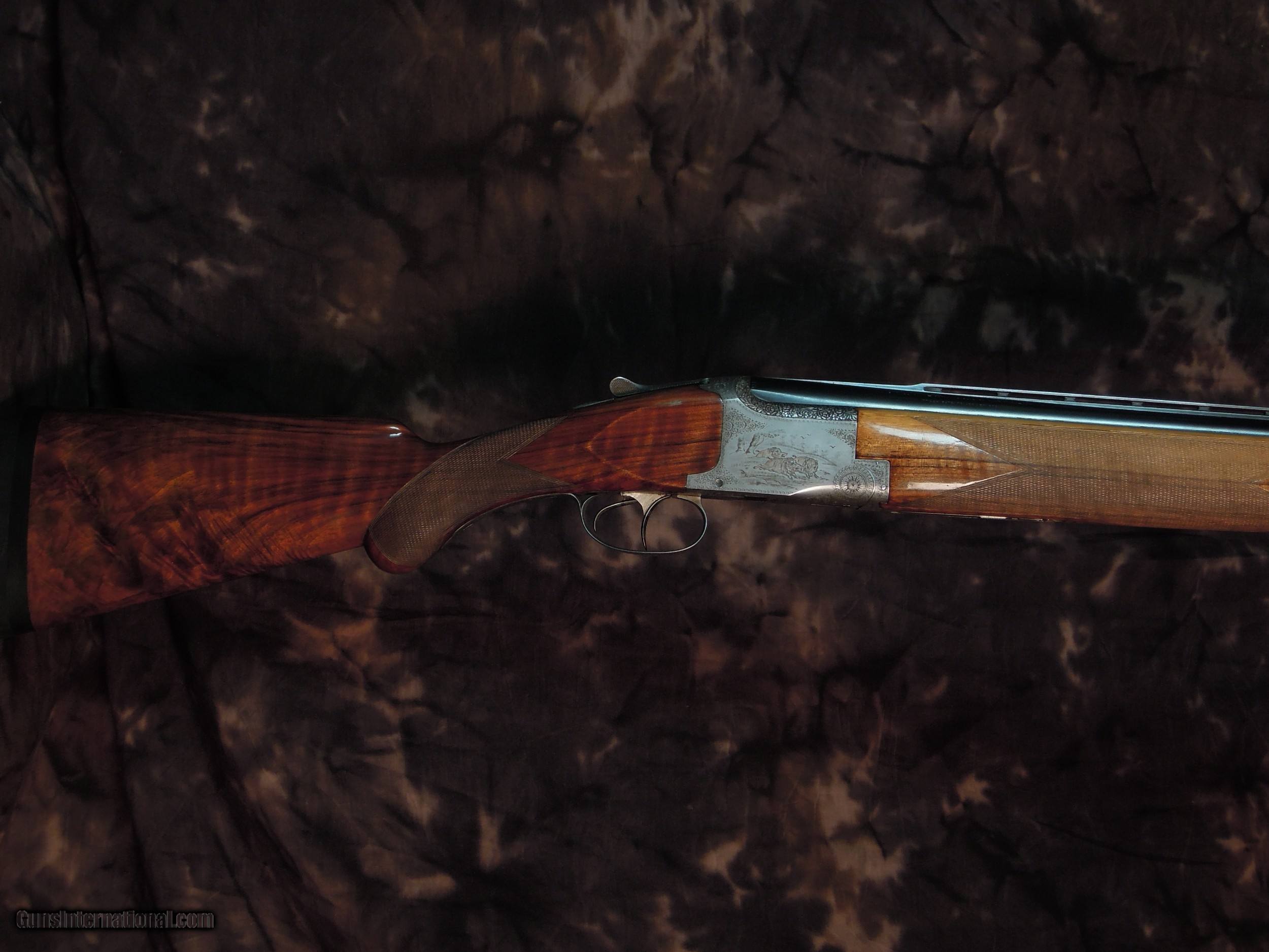 Description: Pre War Browning Superposed Diana Grade 1932 manufacture. 30 inch Non Cross Fire rib, double triggers. Coin finish is in excellent shape and engraving is still sharp. Bores are bright with no pitting. Top barrel is choked * bottom barrel is *-. Original bluing on barrels that have no dents or bulges. Top rib has one small ding at the muzzle on the right side. Original stock measures 1 1/4" x 1 1/2" x 14 1/8" to non original recoil pad.Stock has what appears to be the original finish with a few small handling marks and a scratch on the left side underneath by the trigger bow. Triggers are crisp, ejectors are strong, and the action remains firm with a nice sound when locked up. All in all a very nice high condition scarce second year Diana with long barrels and double triggers. Enjoy the photos and if you have questions on any aspects of the gun I would be happy to take your calls or respond to your inquiries by email SOLD Manufacturer: Browning Model: Pre War Duana Bore: 12 Chambers: 2 3/4 Ejectors: yes |