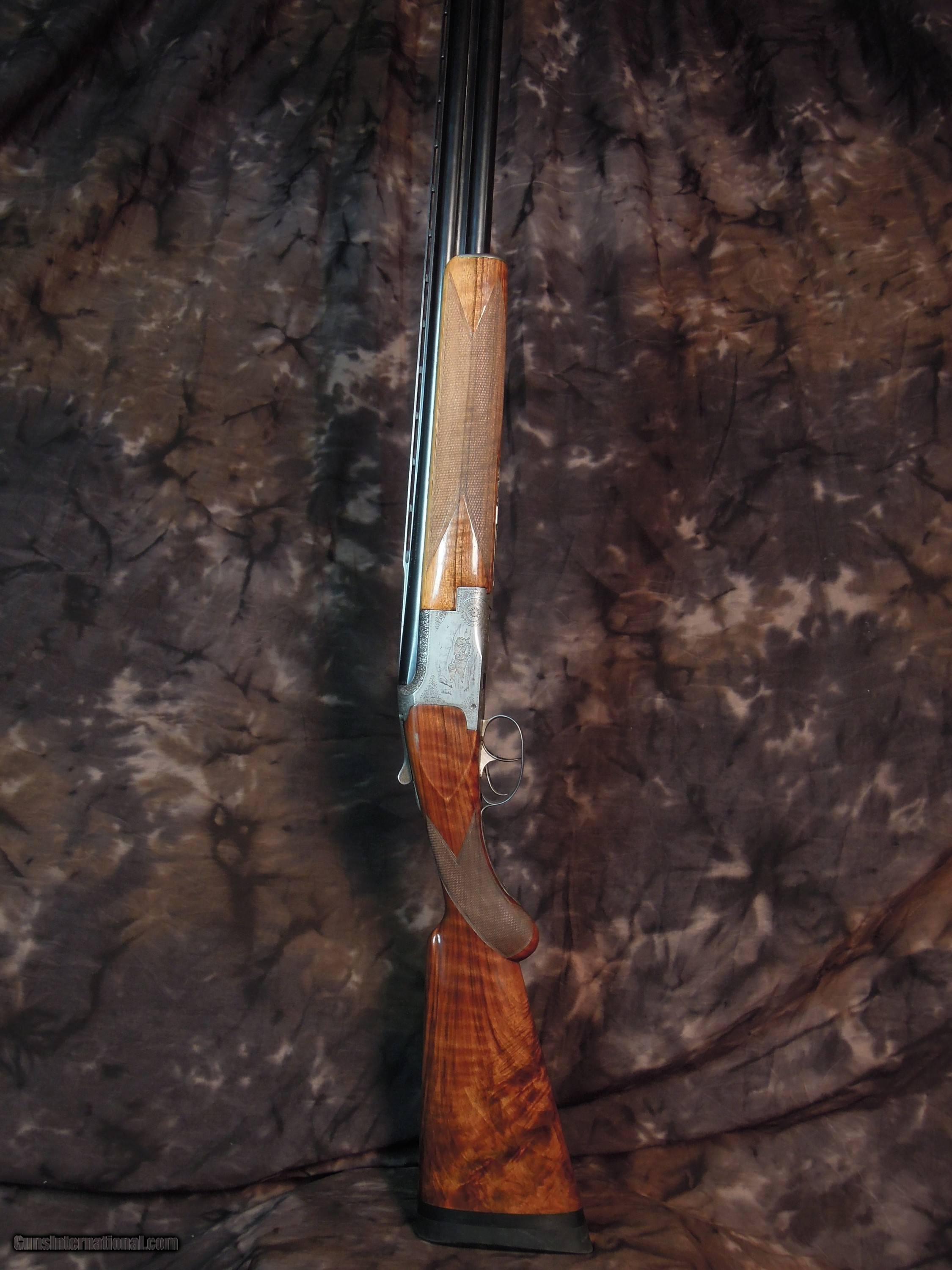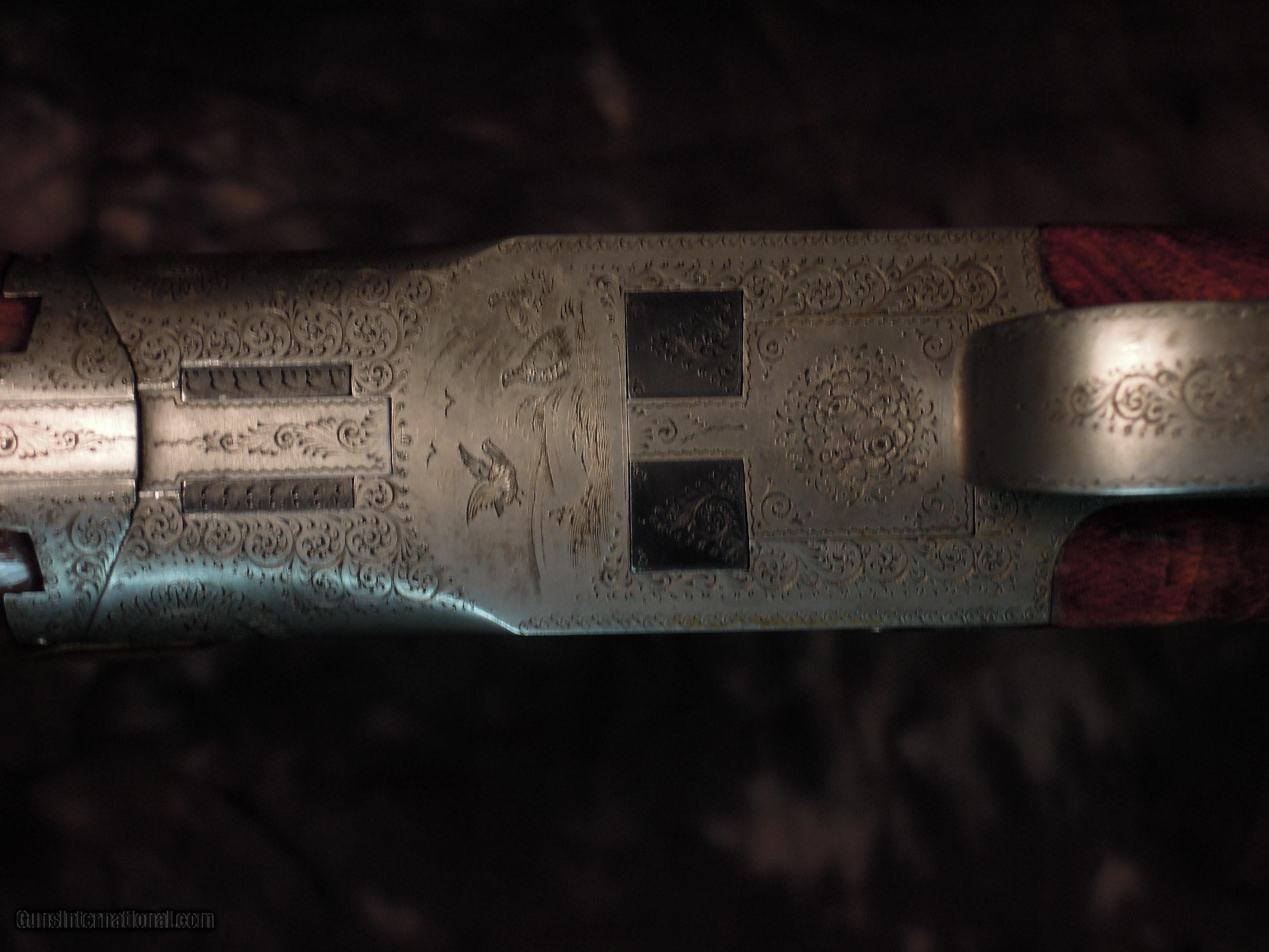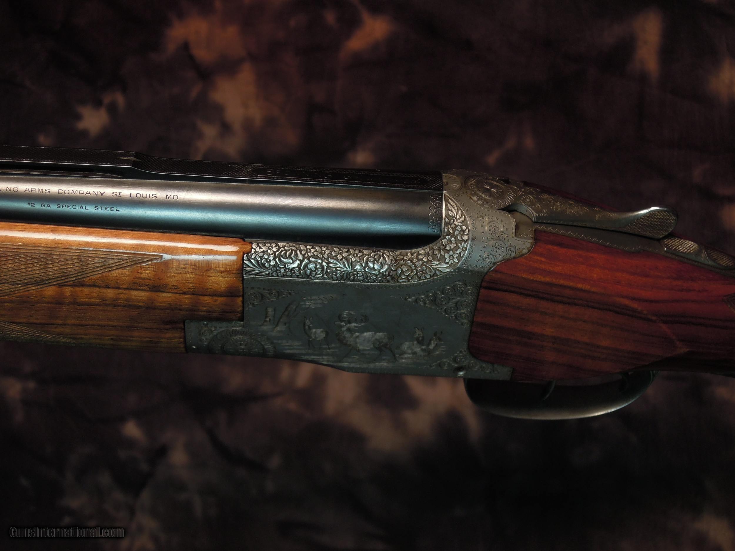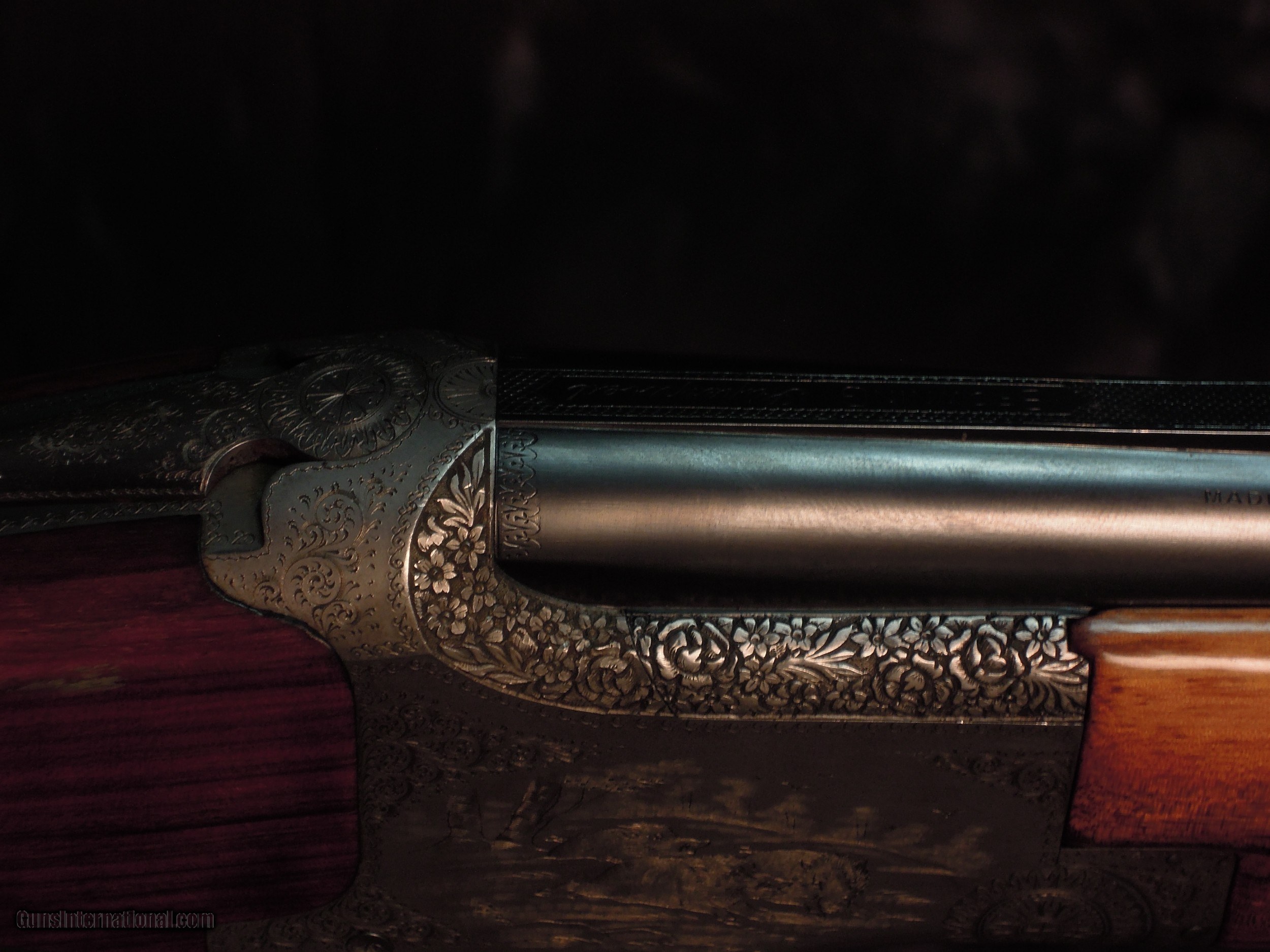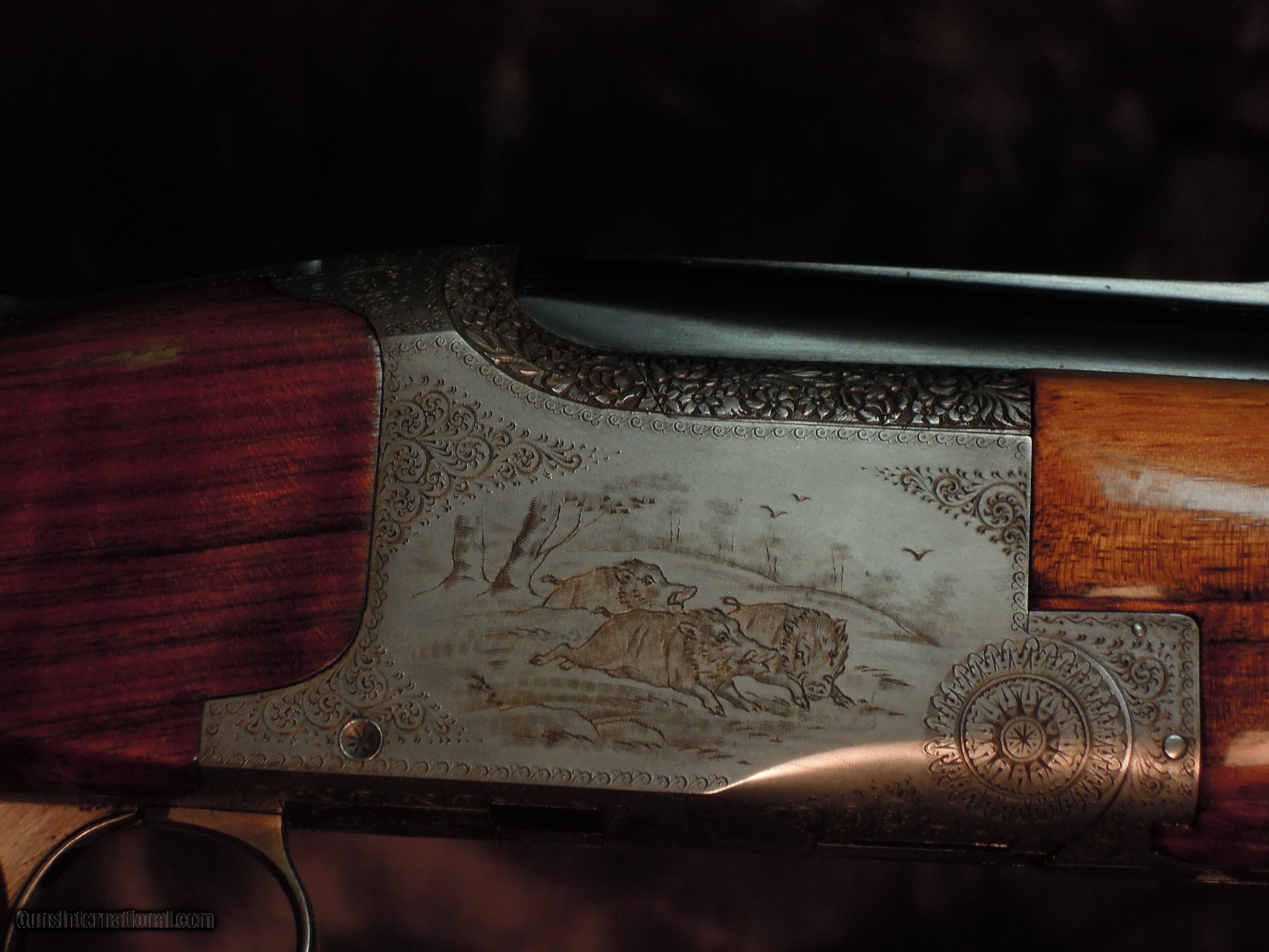 Description: Pre War Browning Superposed Diana Grade 1932 manufacture. 30 inch Non Cross Fire rib, double triggers. Coin finish is in excellent shape and engraving is still sharp. Bores are bright with no pitting. Top barrel is choked * bottom barrel is *-. Original bluing on barrels that have no dents or bulges. Top rib has one small ding at the muzzle on the right side. Original stock measures 1 1/4" x 1 1/2" x 14 1/8" to non original recoil pad.Stock has what appears to be the original finish with a few small handling marks and a scratch on the left side underneath by the trigger bow. Triggers are crisp, ejectors are strong, and the action remains firm with a nice sound when locked up. All in all a very nice high condition scarce second year Diana with long barrels and double triggers. Enjoy the photos and if you have questions on any aspects of the gun I would be happy to take your calls or respond to your inquiries by email SOLD Manufacturer: Browning Model: Pre War Duana Bore: 12 Chambers: 2 3/4 Ejectors: yes |