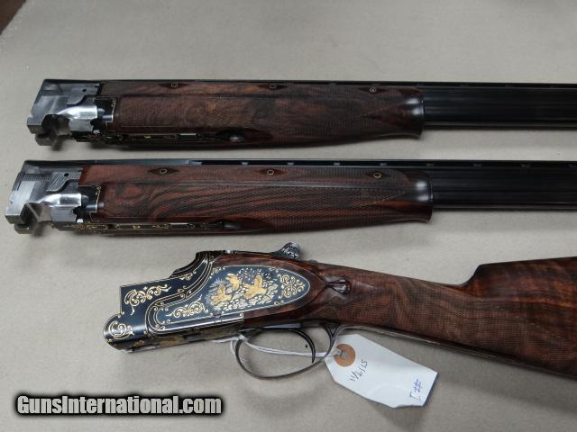 Description: Browning Superposed Superlight Custom Exhibition 2 gauge set 28-410 with 28" vent rib barrels. Straight grip stock of outstanding turkish walnut with fine checkering,checkered butt, and 3 piece forends. Spectacular deep blued action with heavy gold inlays by master engravers R.Capaese and J.Diet. A beautiful little gun. SOLD |