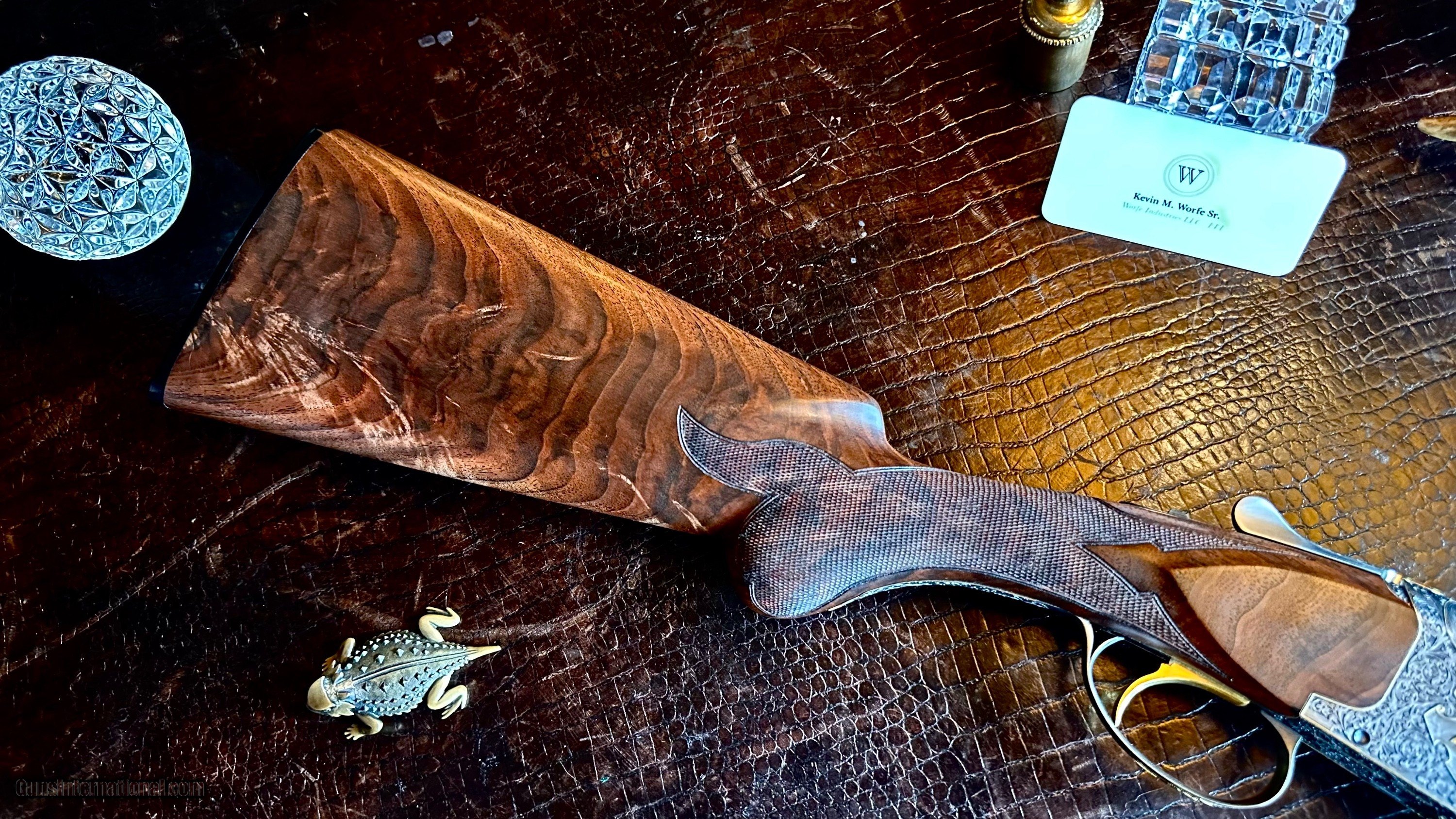 Description: BROWNING EXHIBITION GRADE CUSTOM 20GA RKLT 28” M/F MASTER ENGRAVER R. HAMBROOK ORNATELY DETAILING THE SOUTHERN STYLE GAME SCENE Shotgun Gauge: 20 Gauge Manufacturer: BROWNING Model: SUPERPOSED EXHIBITION GRADE CUSTOM UPGRADE Serial Number: 11442 Barrel Length: 28” Condition: AS NEW 99% Stock Comb: 1 1/2 Stock Heel: 2 3/8 Stock Cast: NEUTRAL TO SLIGHT RIGHT HAND AT TOE Fore End: FIELD Butt Pad: BROWNING BUTTPLATE LOP: 14 1/4 Rib: VENT Finish: HAND RUBBED OIL Weight: 6 LBS 12 OZS Chokes: MOD/FULL Engraving: CUSTOM SOUTHERN GAME SCENE WINDMILL DOVE QUAIL RKLT STIPPLING BEHIND SCROLL IS THE FINEST