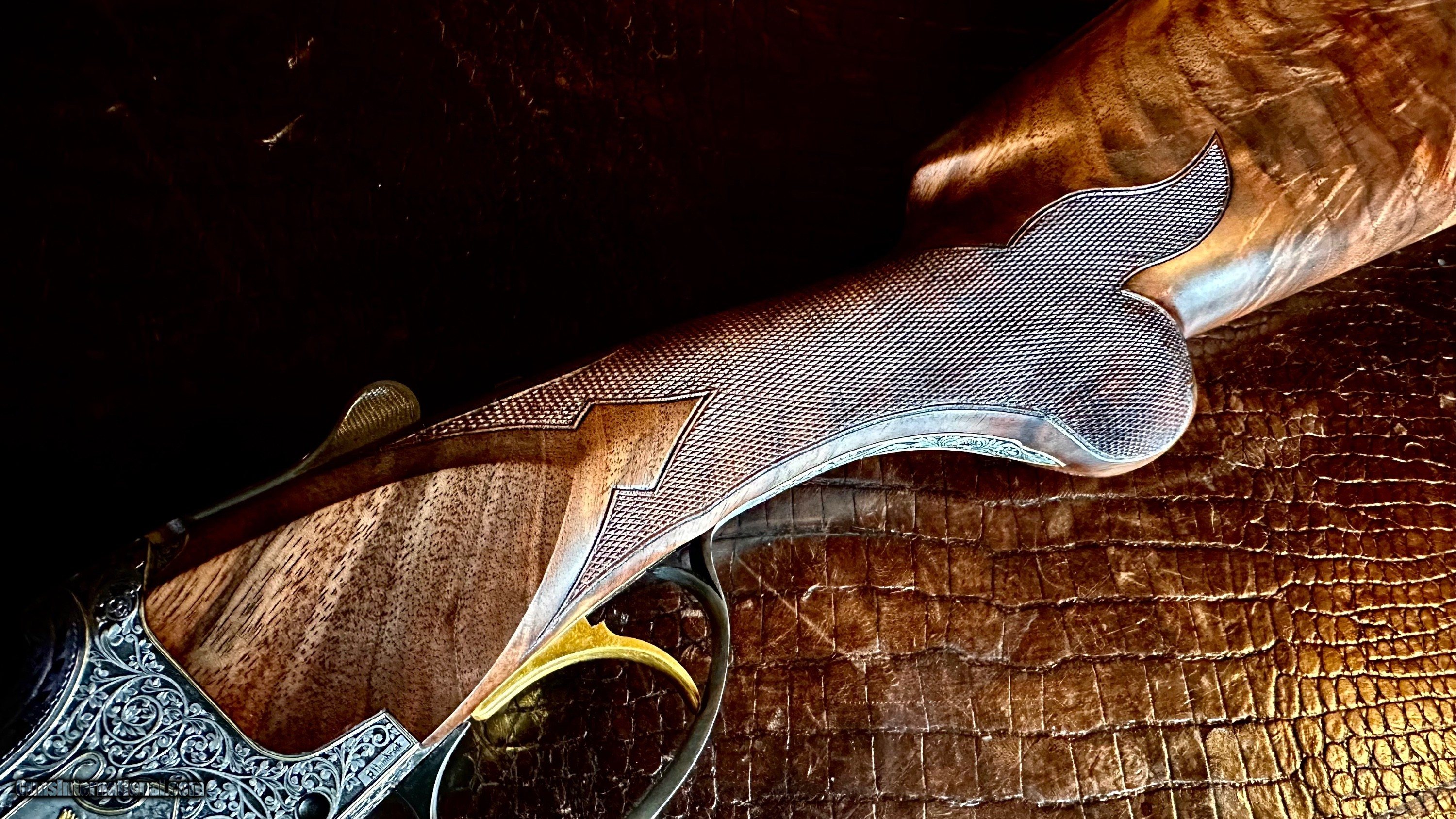 SOLD Shotgun Gauge: 20 Gauge Manufacturer: BROWNING Model: SUPERPOSED EXHIBITION GRADE CUSTOM UPGRADE Serial Number: 11442 Barrel Length: 28” Condition: AS NEW 99% Stock Comb: 1 1/2 Stock Heel: 2 3/8 Stock Cast: NEUTRAL TO SLIGHT RIGHT HAND AT TOE Fore End: FIELD Butt Pad: BROWNING BUTTPLATE LOP: 14 1/4 Rib: VENT Finish: HAND RUBBED OIL Weight: 6 LBS 12 OZS Chokes: MOD/FULL Engraving: CUSTOM SOUTHERN GAME SCENE WINDMILL DOVE QUAIL RKLT STIPPLING BEHIND SCROLL IS THE FINEST |