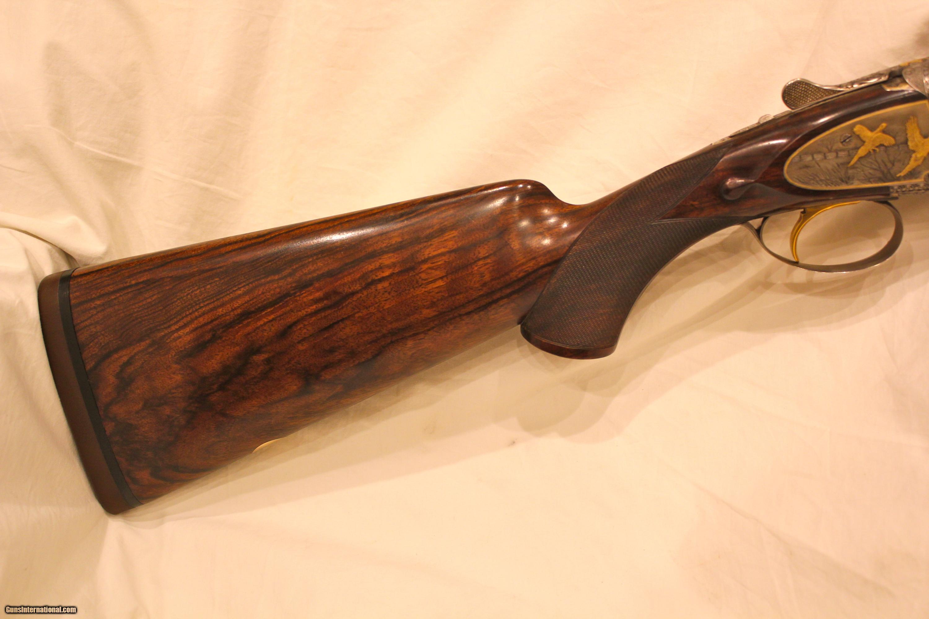 Description: A unbelievable Browning Superposed Engraved and signed by Philippe Grifnee and Ren'e Delcour, 2 of the finest engravers to have lived a gorgeous 20ga 26 1/2in IC/M beautiful 3 piece schnable forend 14 1/2 LOP gold birds and a beautiful Lab on the bottom Could not replace this gun SOLD |