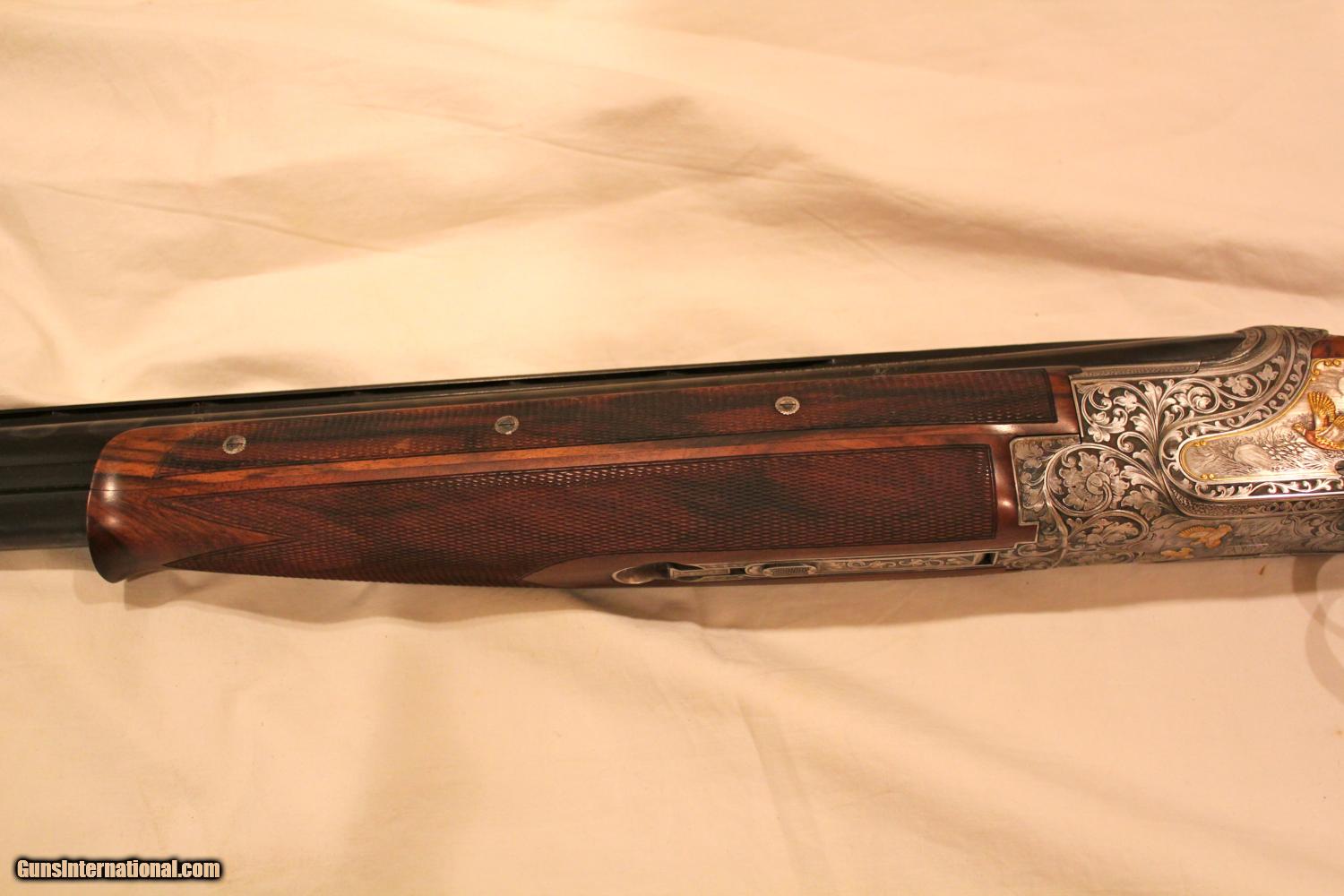 Description: A spectacular Angelo Bee Engraved Browning Superlight 28ga Some othe prettiest wood you will see 14 1/2 LOP to a checkered butt 3 piece forend Superlight Rib Tear drop checkering Deep engraving with multi color gold birds 26 1/2 in barrels with top barrel choked .007 and bottom barrel choked .006 SOLD |