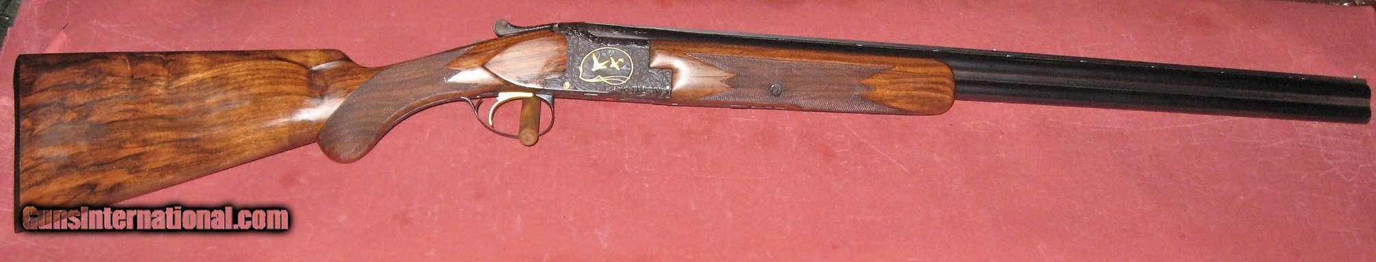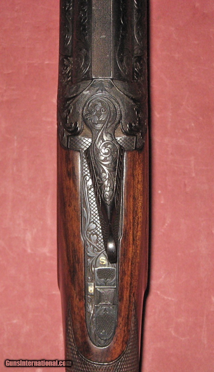 Description: Belgian Browning 20 gauge Midas gradebuilt in 1962.This beautiful little bird gun has the round knob,long tang stock.The 261/2" barrels are choked improved cylinder and modified.The receiver is signed in 2 places by Browning master engraver ADeirckx.The receiver retains 99% of the original blue.The stock and forend are hoghly figured European walnut and retain 99% finish and are free of any cracks or damage.The original Browning rib has been replaced with a sporting type flat rib and the barrels were professionaly reblued.The forend has been adjusted so that it can be removed rather than slid forward.The action is tight and on face and locks up tightly.The gun weighs 6-0 and handles quickly and smoothly.This is not a collectors gun but a very high quality hunting gun.Perfect for quail,grouse,pheasants,doves or just breaking clays.Cased in a Browning Luggage case.Priced at half of what other round knob field choked Midas 20s are bringing.Trades for quality shotguns or rifles considered.C&R eligible SOLD Curio/Relic: Yes Manufacturer: Browning (FN) Model: Midas Serial Number: 26942V2 Chambers: 23/4" & 3 Ejectors: yes Metal Condition: excellent Wood Condition: excellent Bore Condition: mint Action: over under Triggers: single selective Stock Dimensions: 141/4"x11/2"x2 Butt Pad: factory buttplate Rib: ventilated (replacement) Weight: 6-0 Manufacture Date: 1962 Choke Left: modified Choke Right: Improved cylinder |